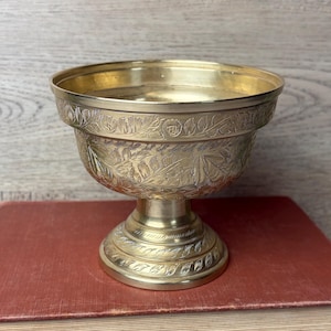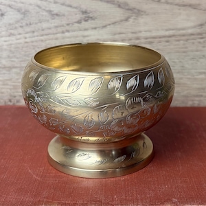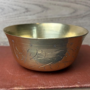 Beautiful vintage brass candlestick holder. In a floral/leaf design with etched lines in the top and a dash pattern on the underside. In good vintage condition. Showing some signs of wear and tarnish but overall beautiful.