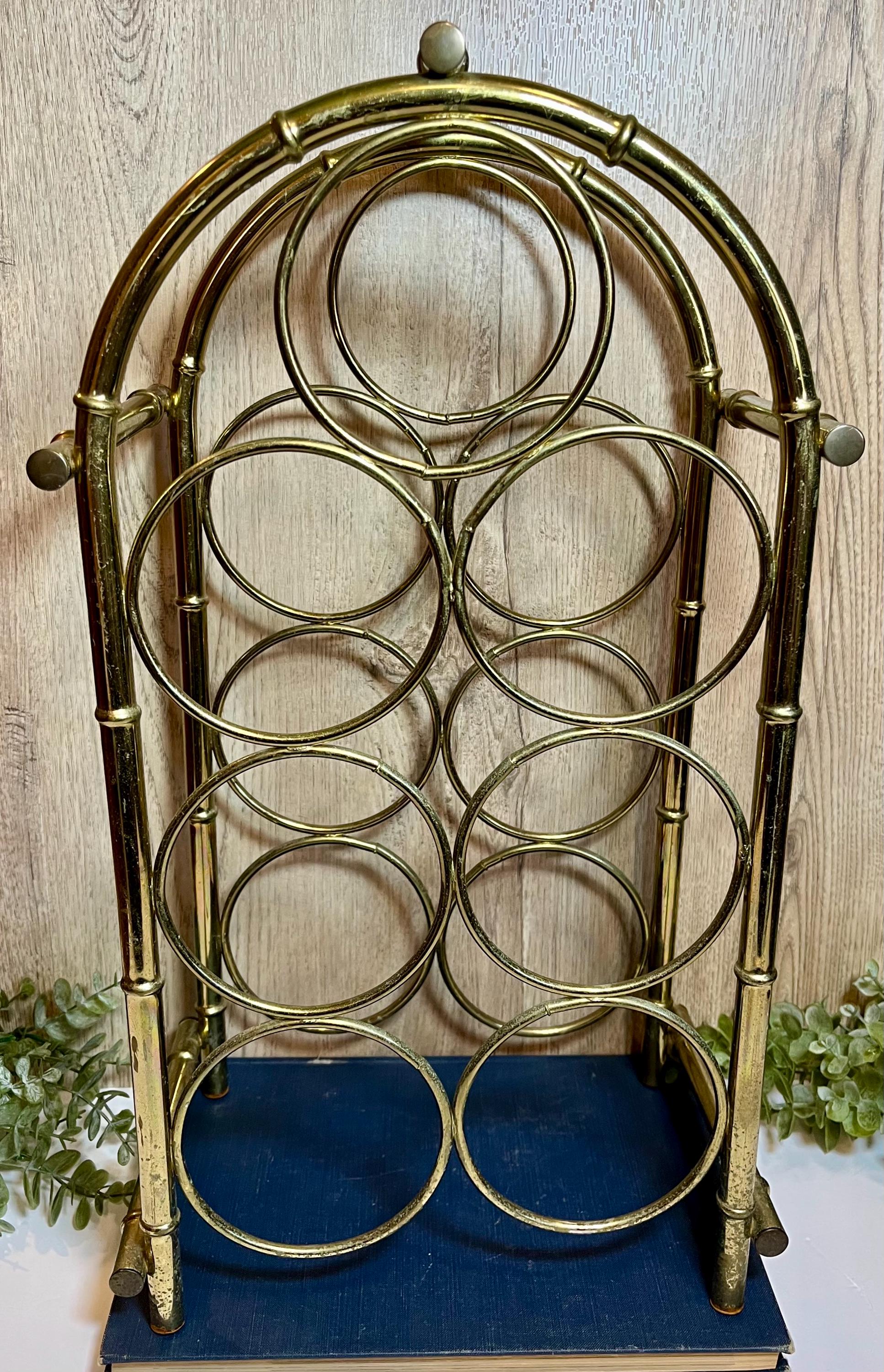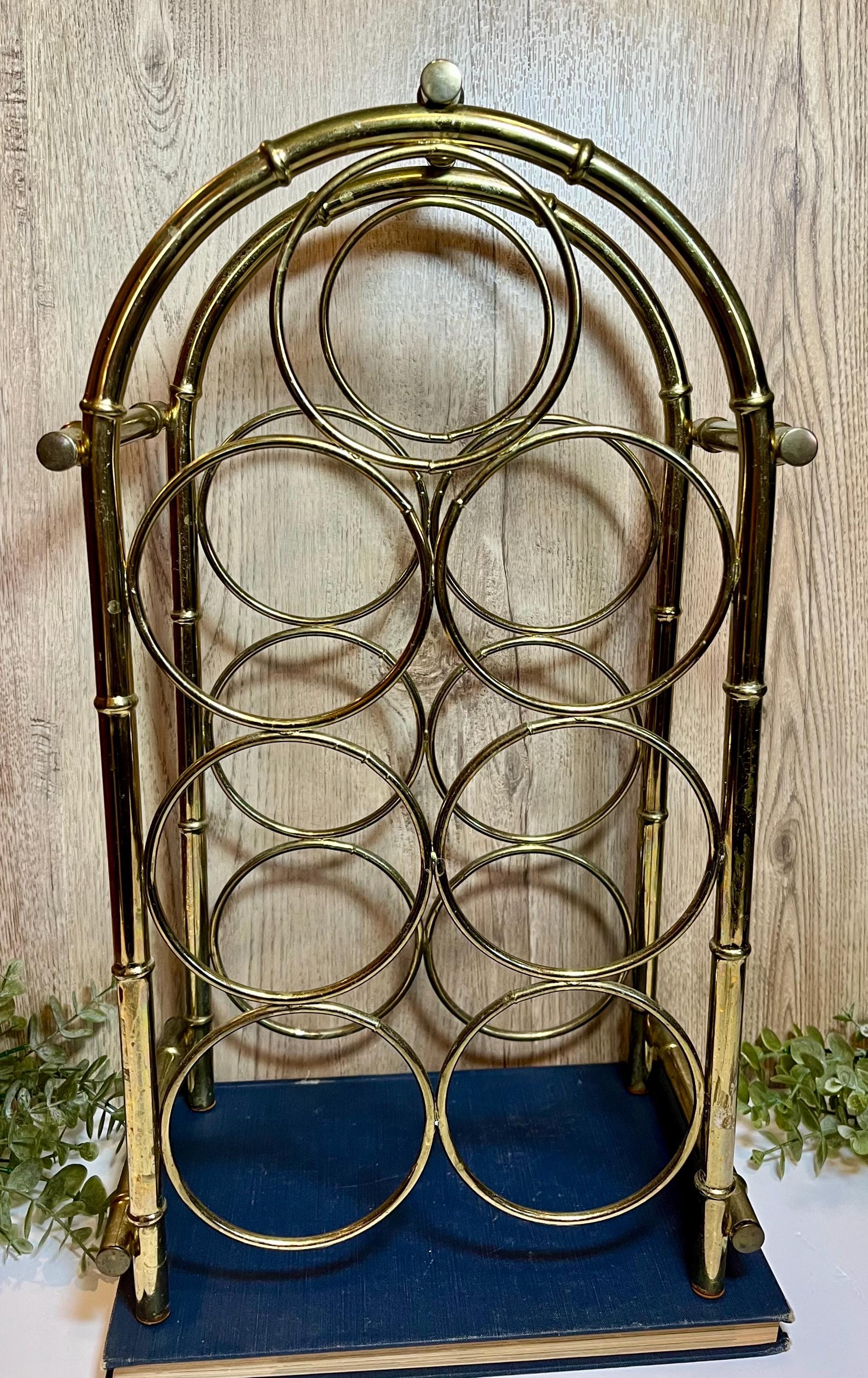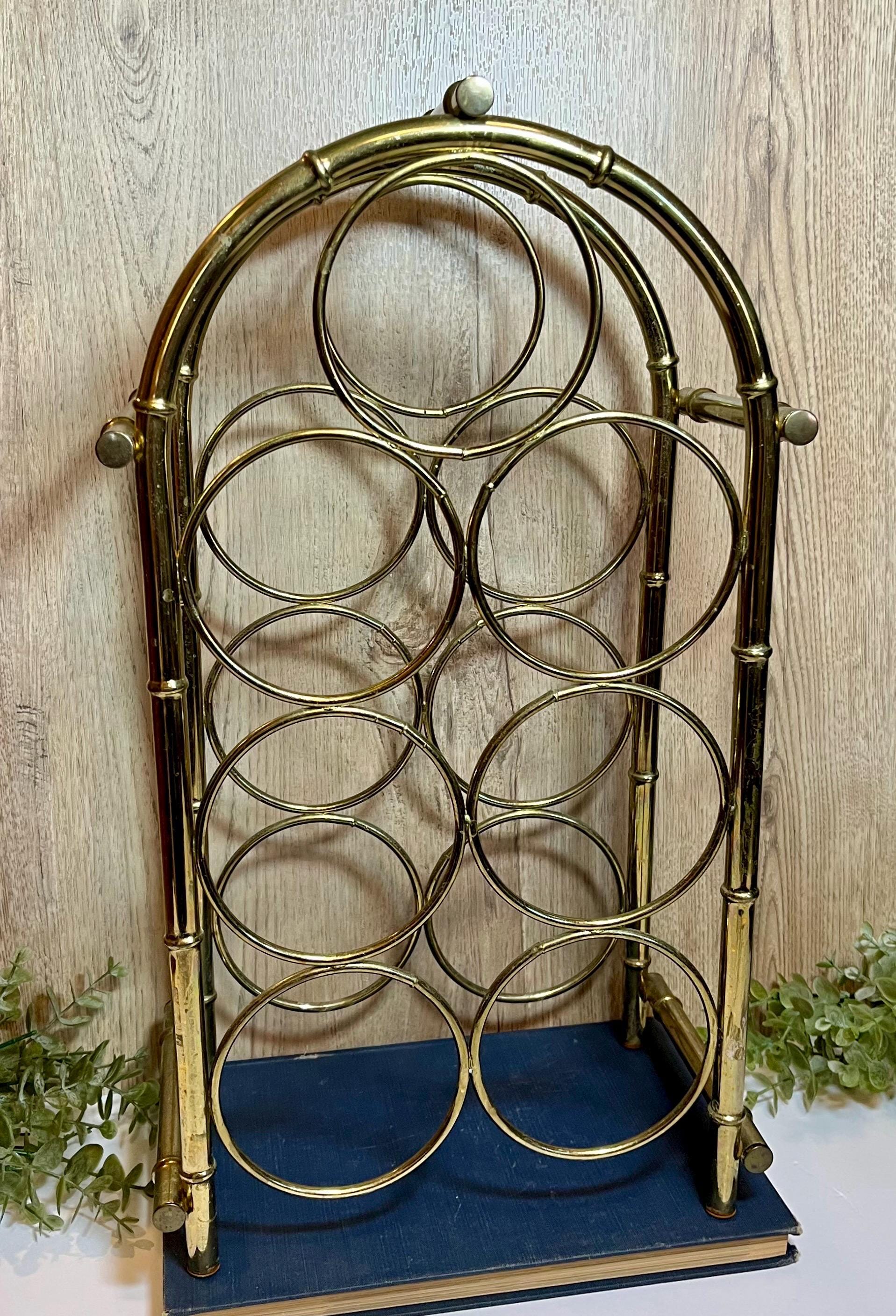 Holds up to seven bottles of wine. This item is in vintage condition with some signs of age and wear. There is a slight film on the brass that could probably be buffed out but has just had a light cleaning so far.