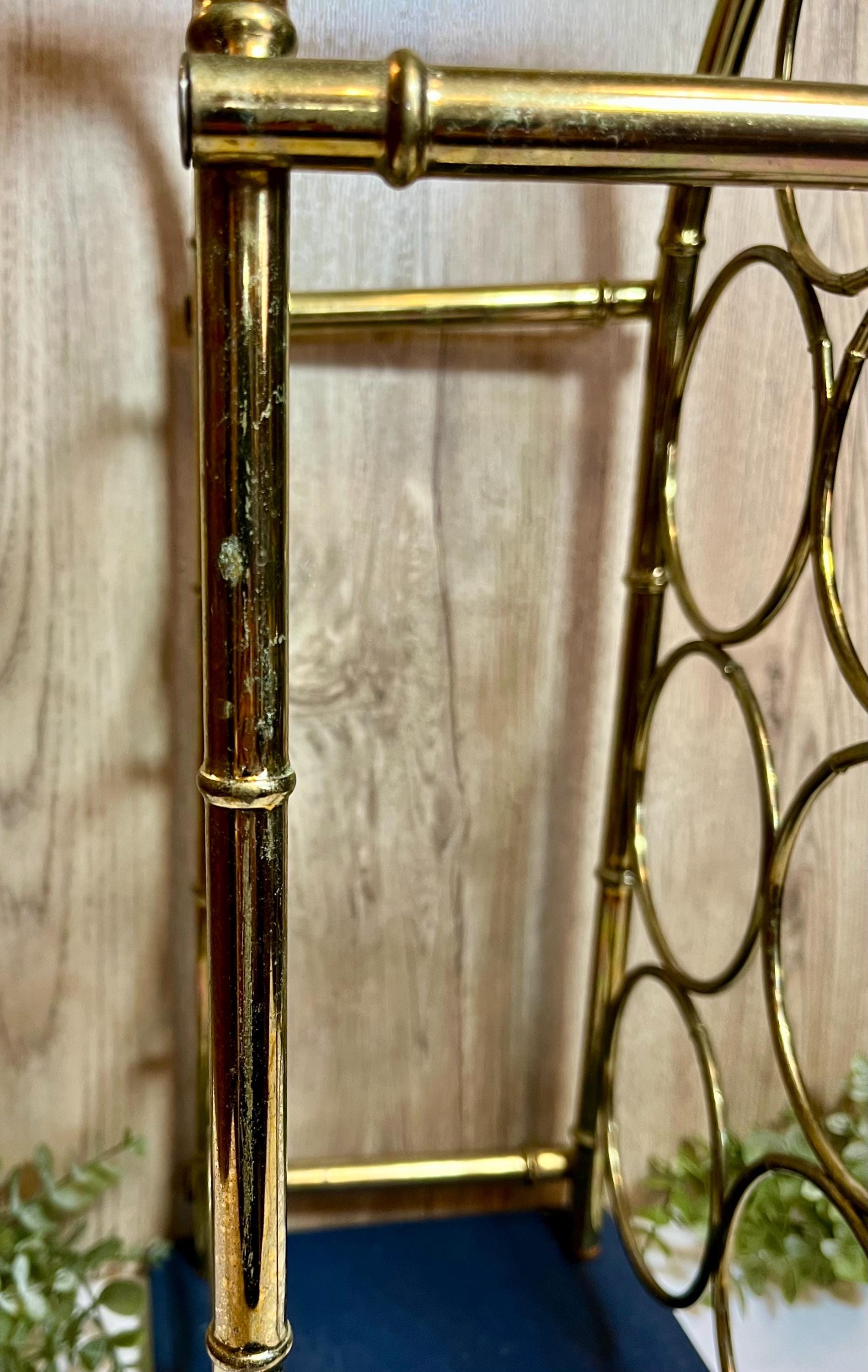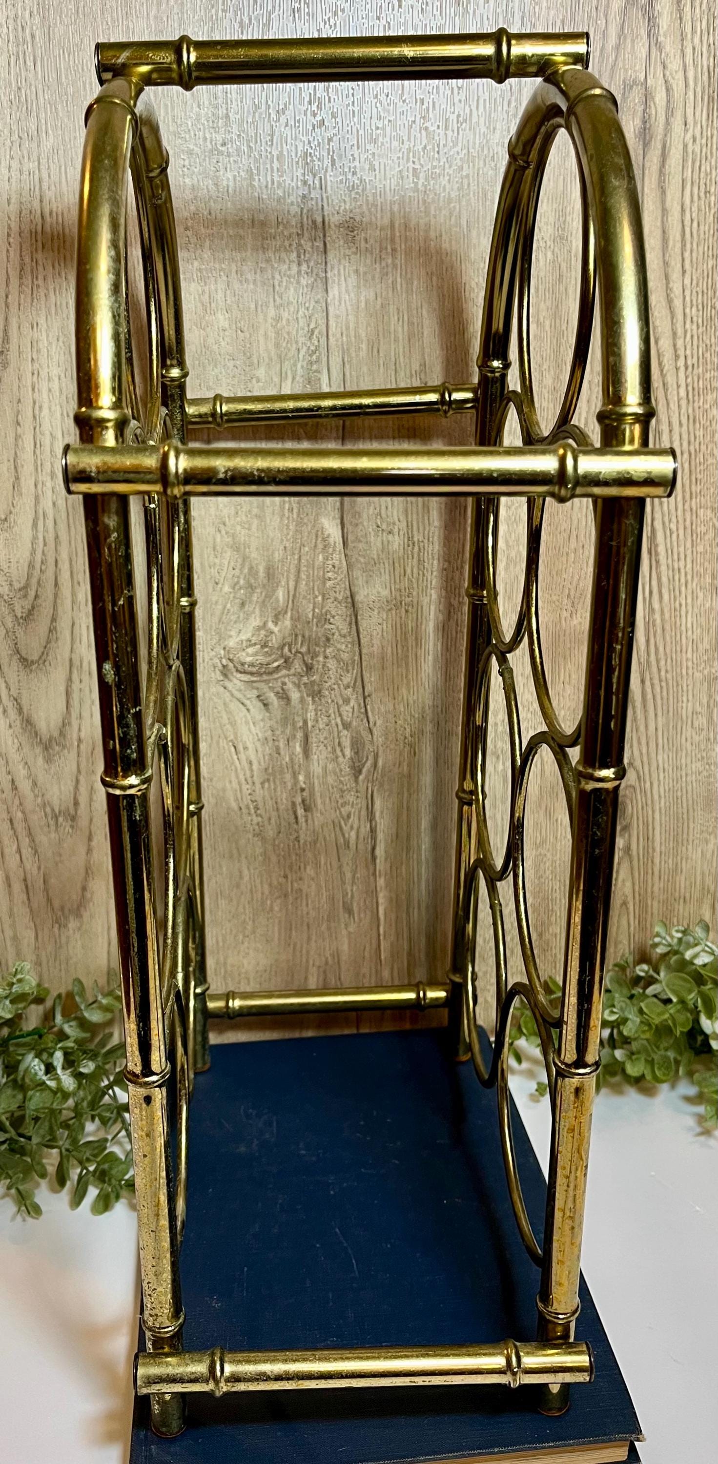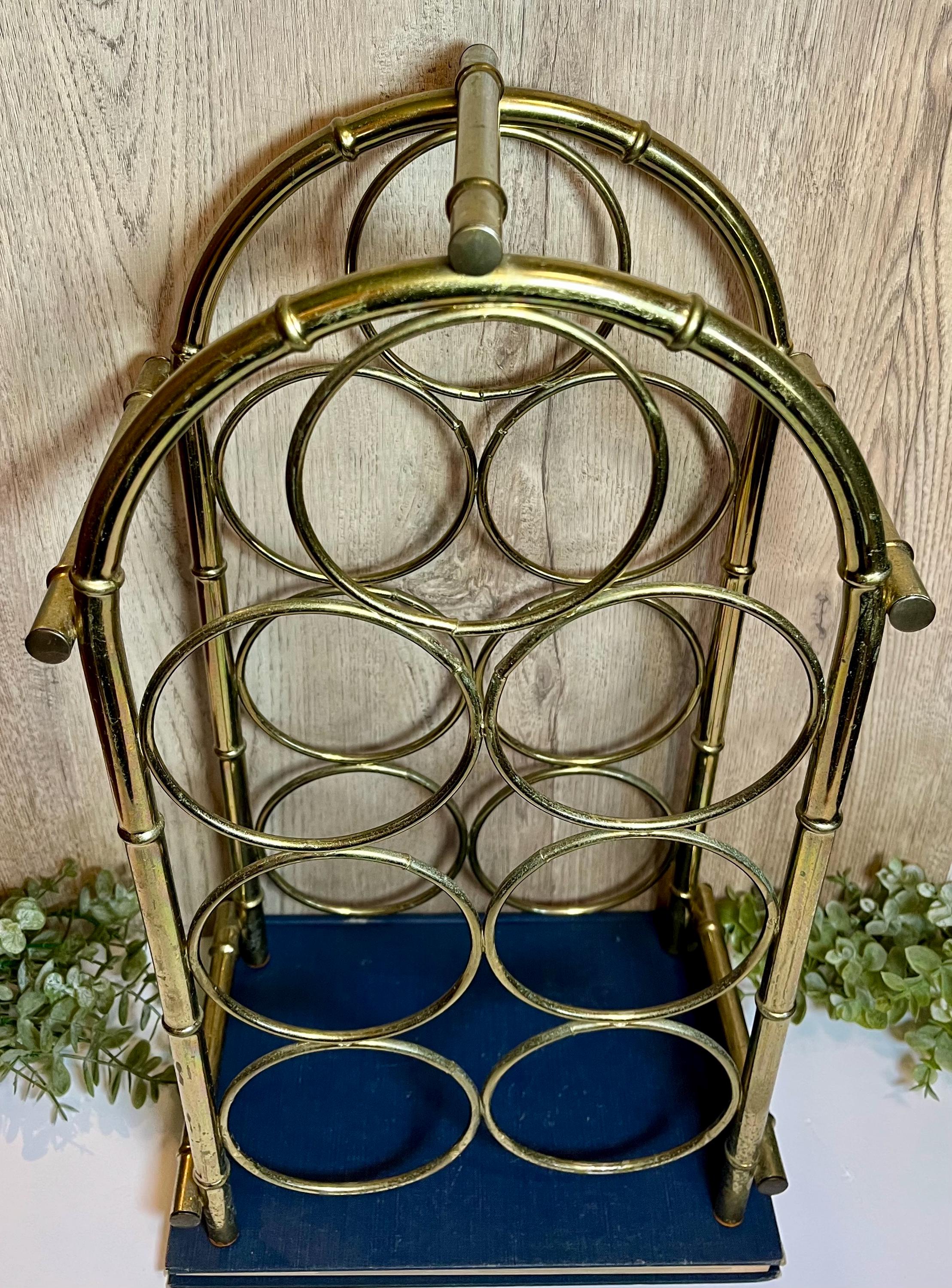 Holds up to seven bottles of wine. This item is in vintage condition with some signs of age and wear. There is a slight film on the brass that could probably be buffed out but has just had a light cleaning so far.