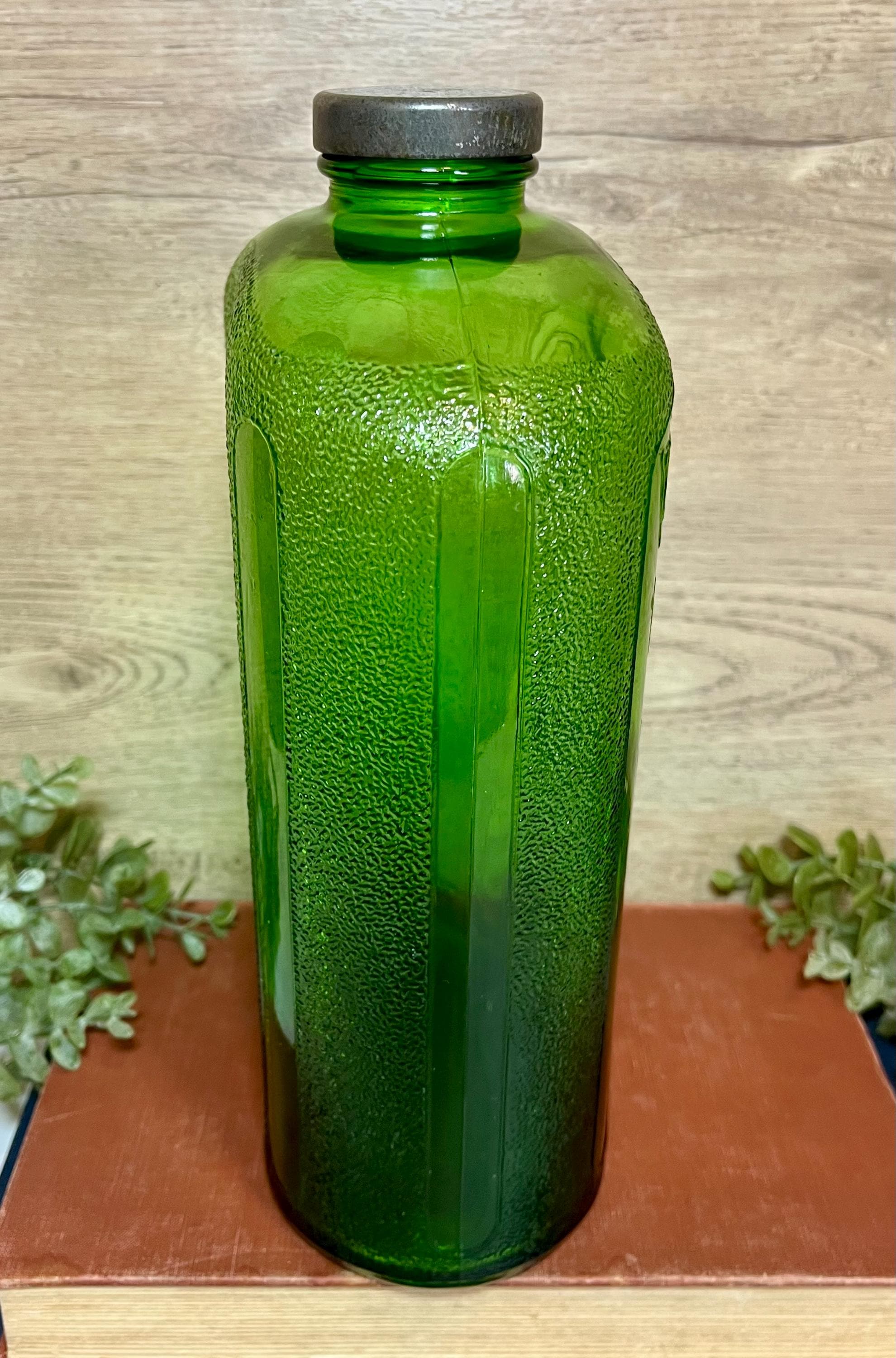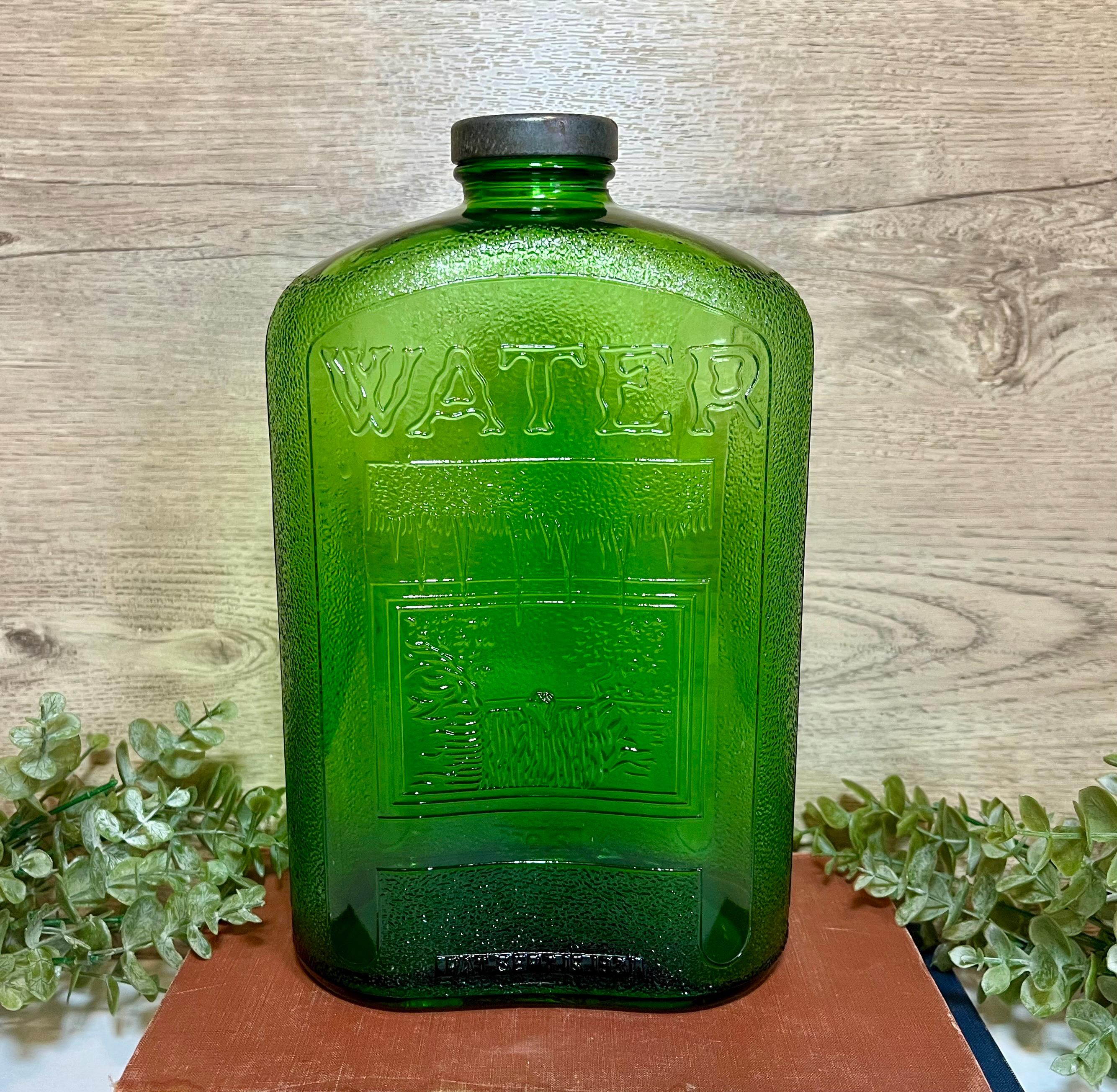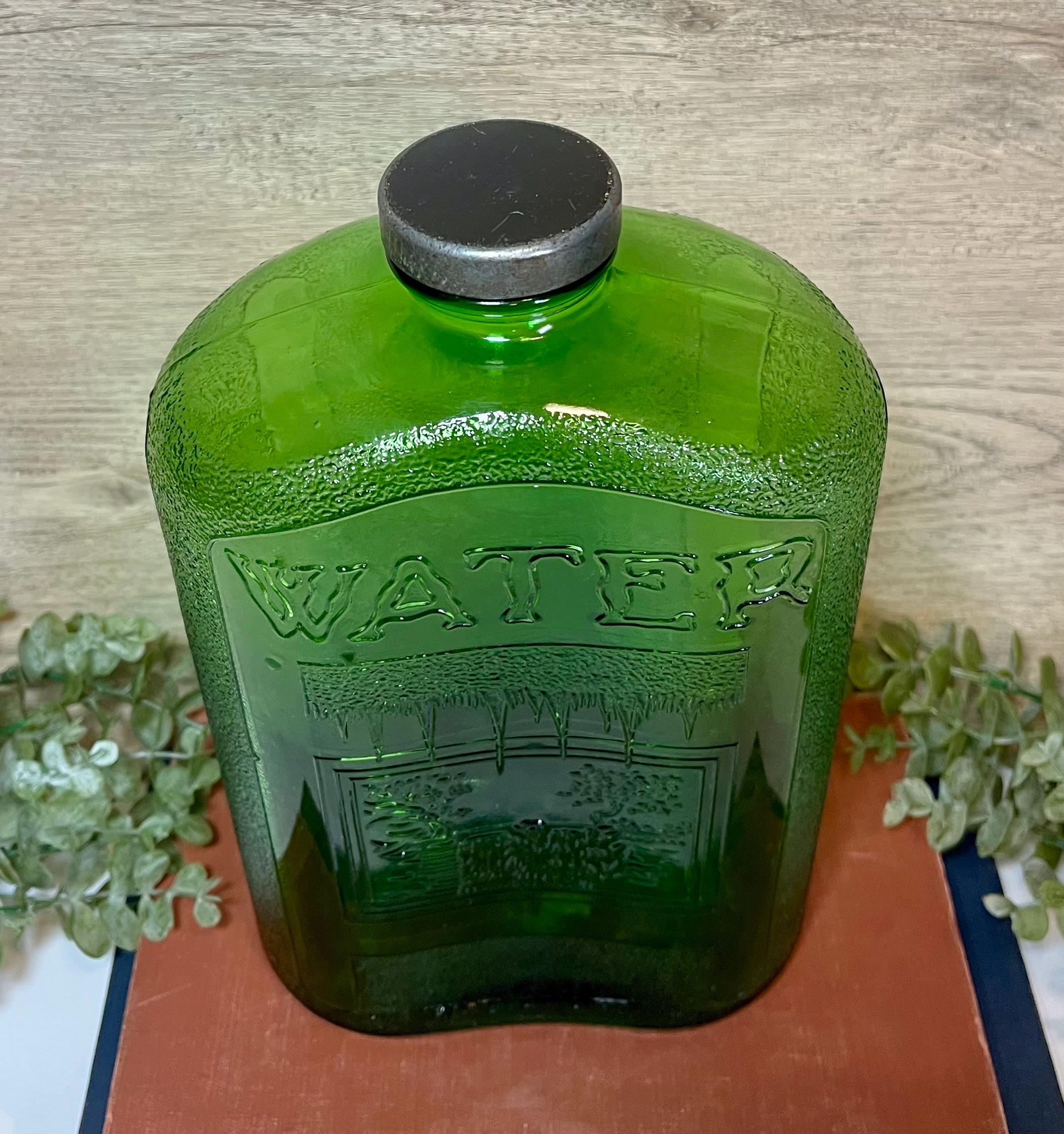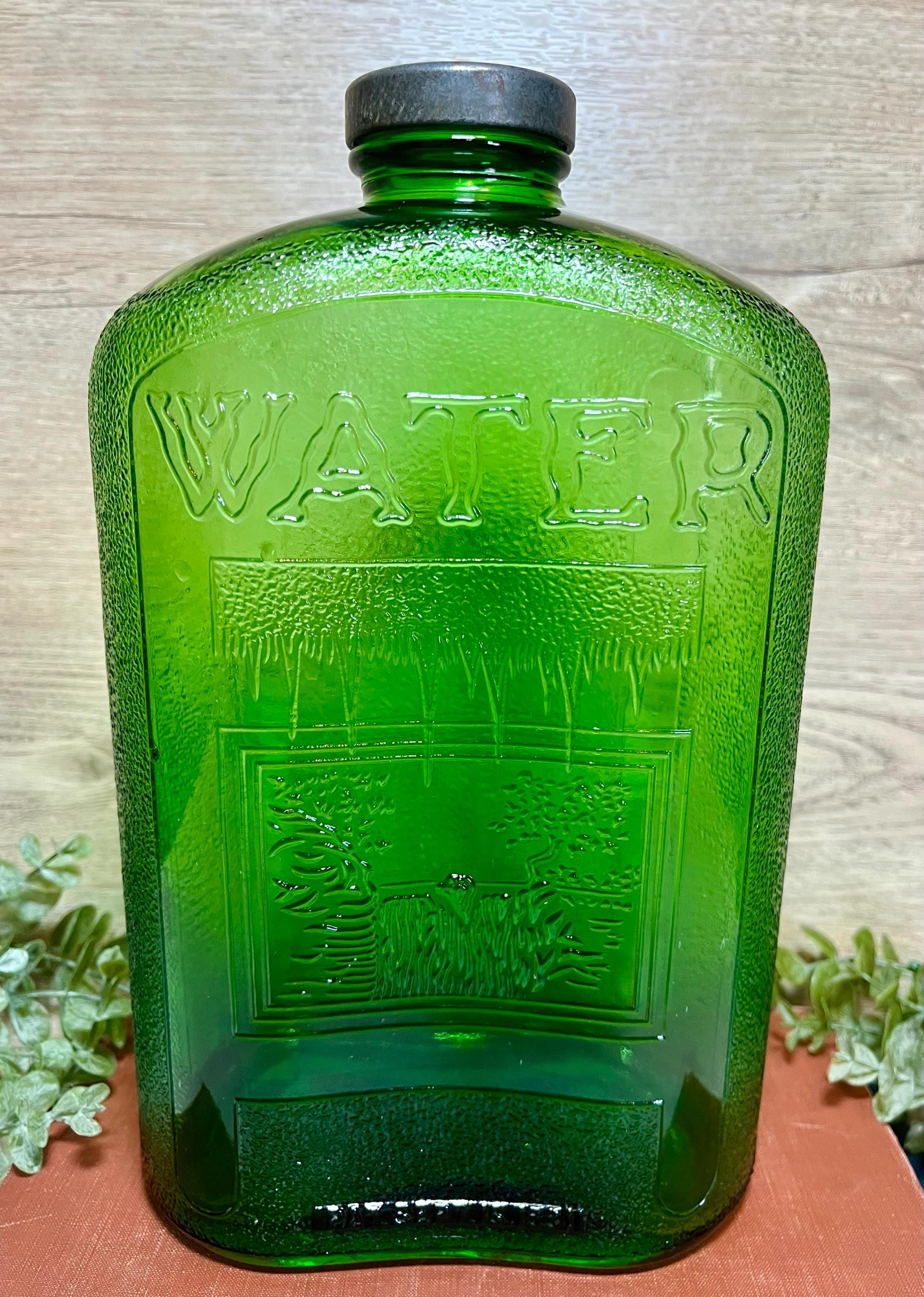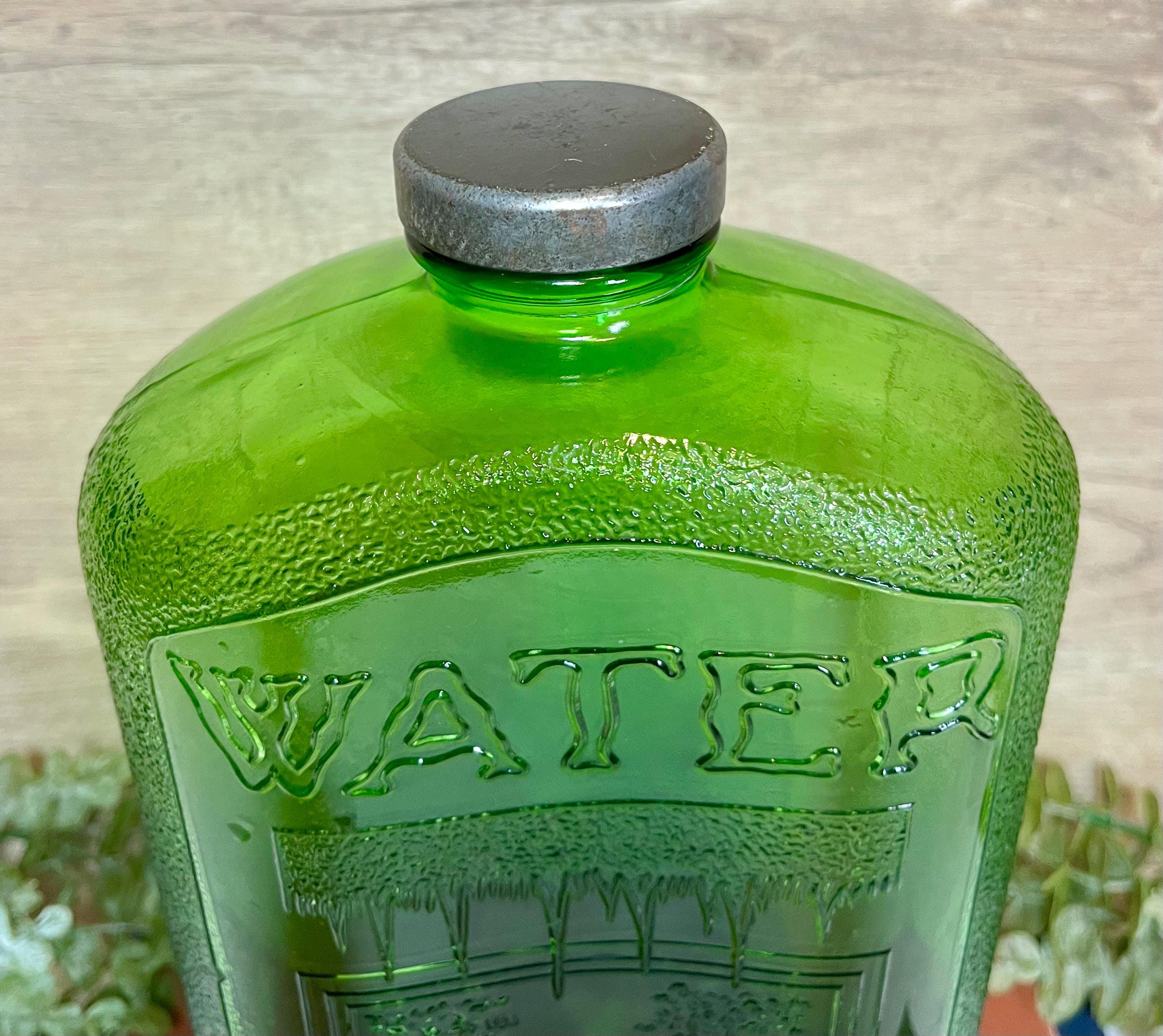 Beautiful 1930s green glass refrigerator water bottle. Beautiful Art Nuevo style with the word WATER written in wavy capital letters across the top.