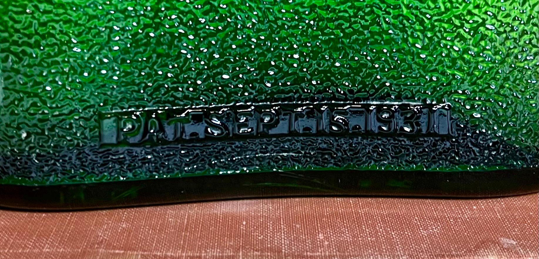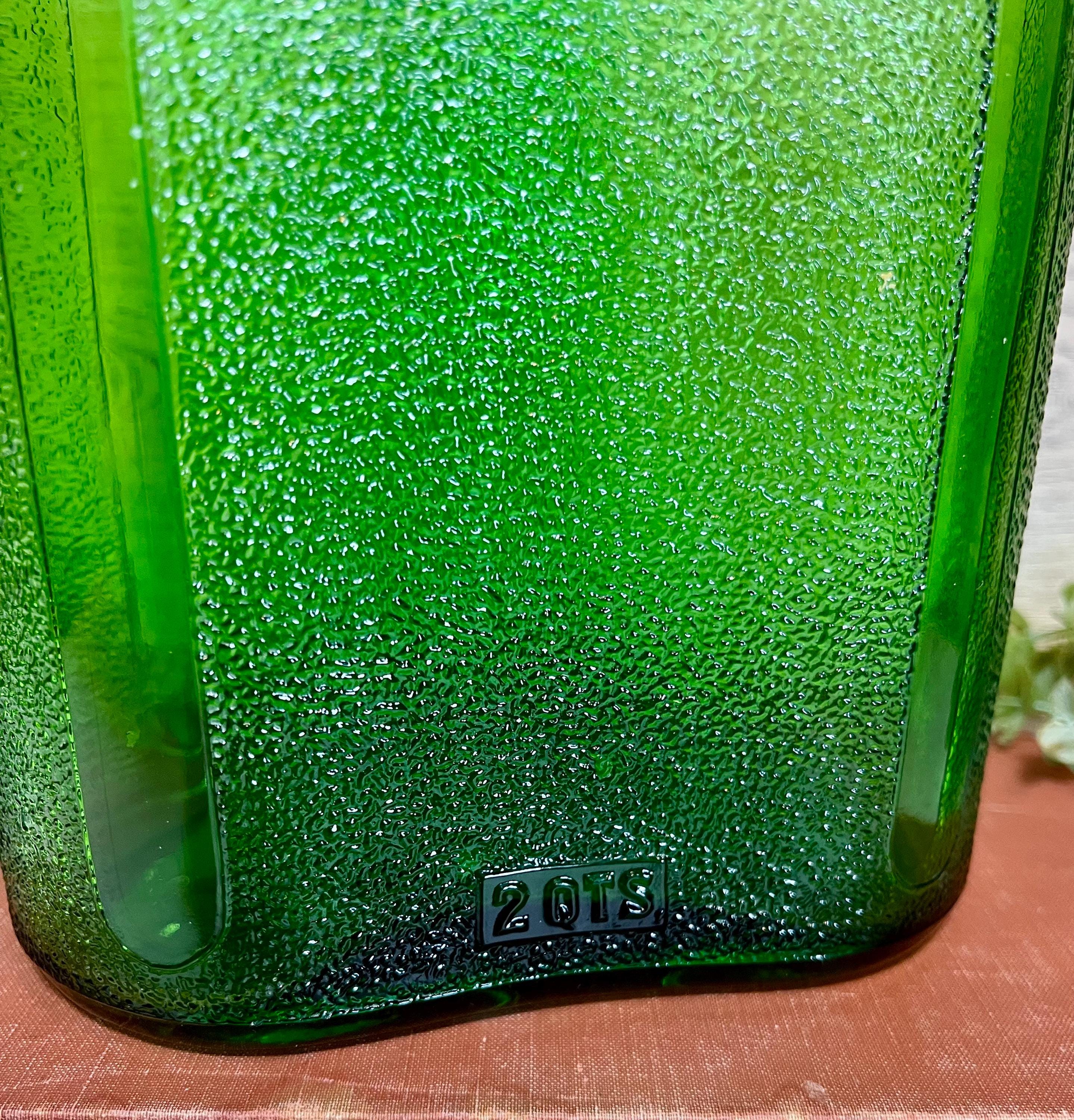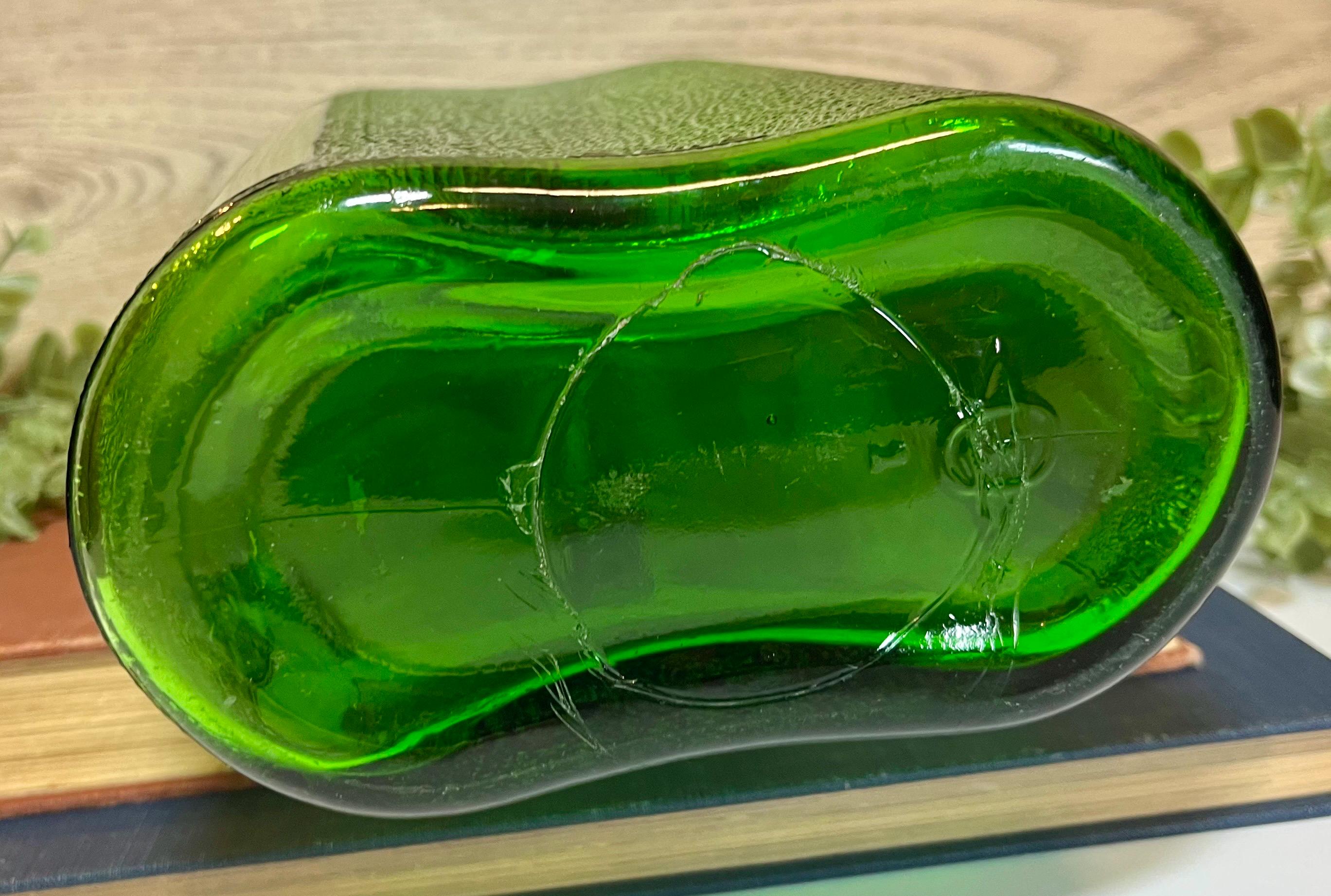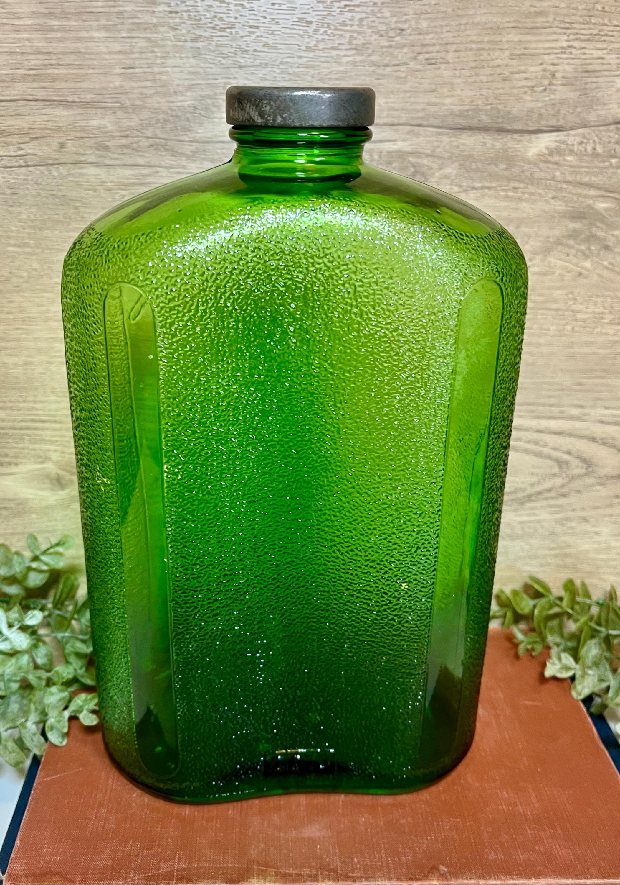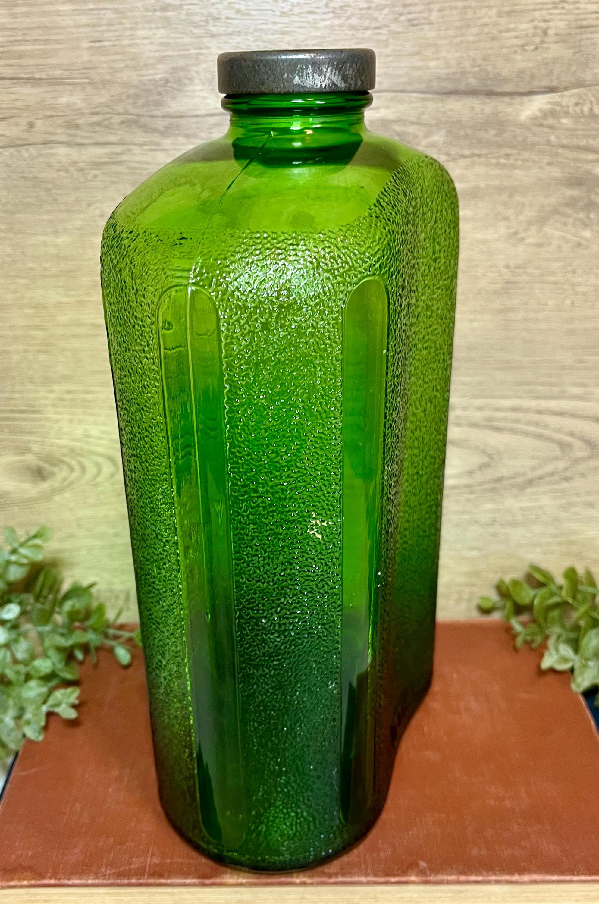 Beautiful 1930s green glass refrigerator water bottle. Beautiful Art Nuevo style with the word WATER written in wavy capital letters across the top.