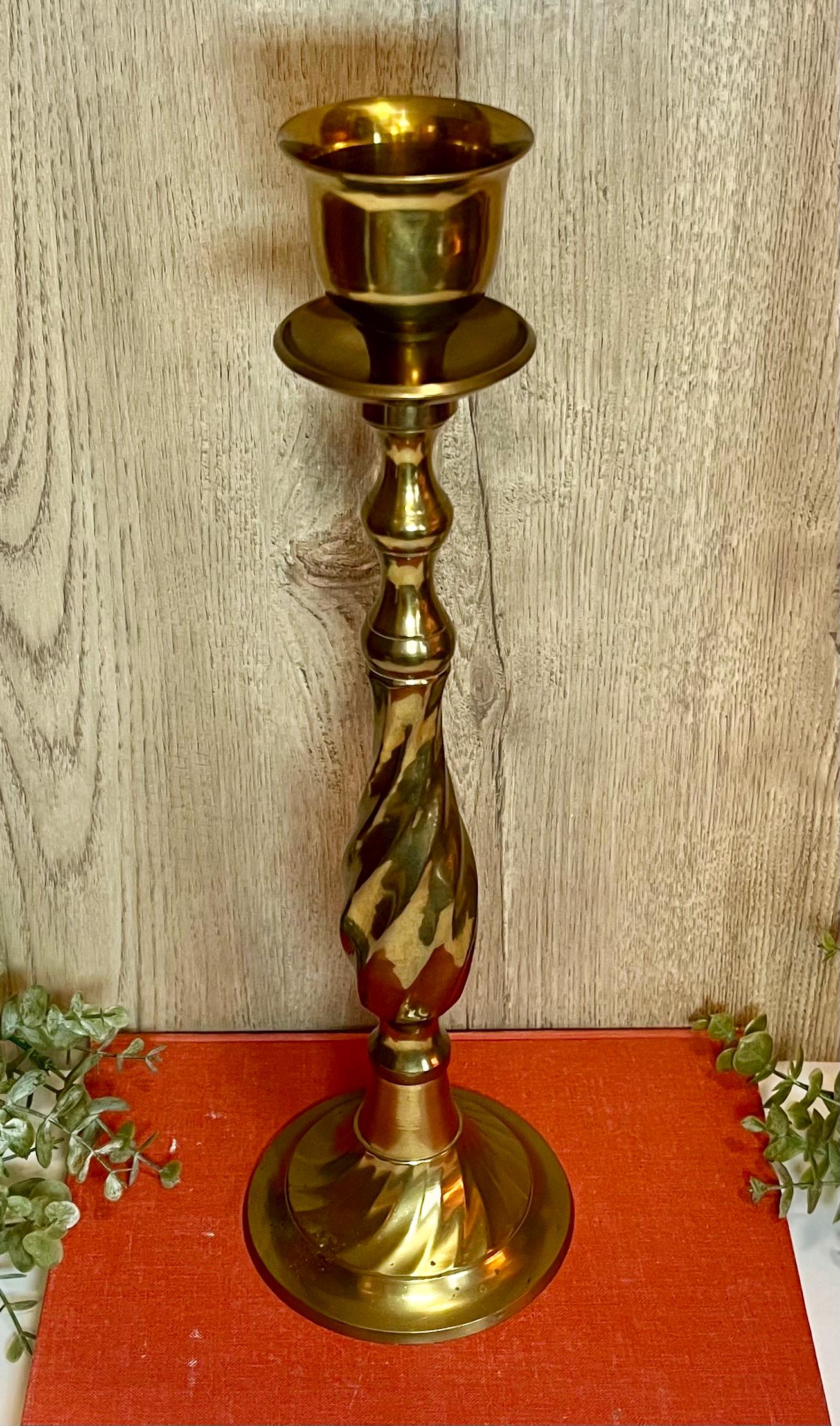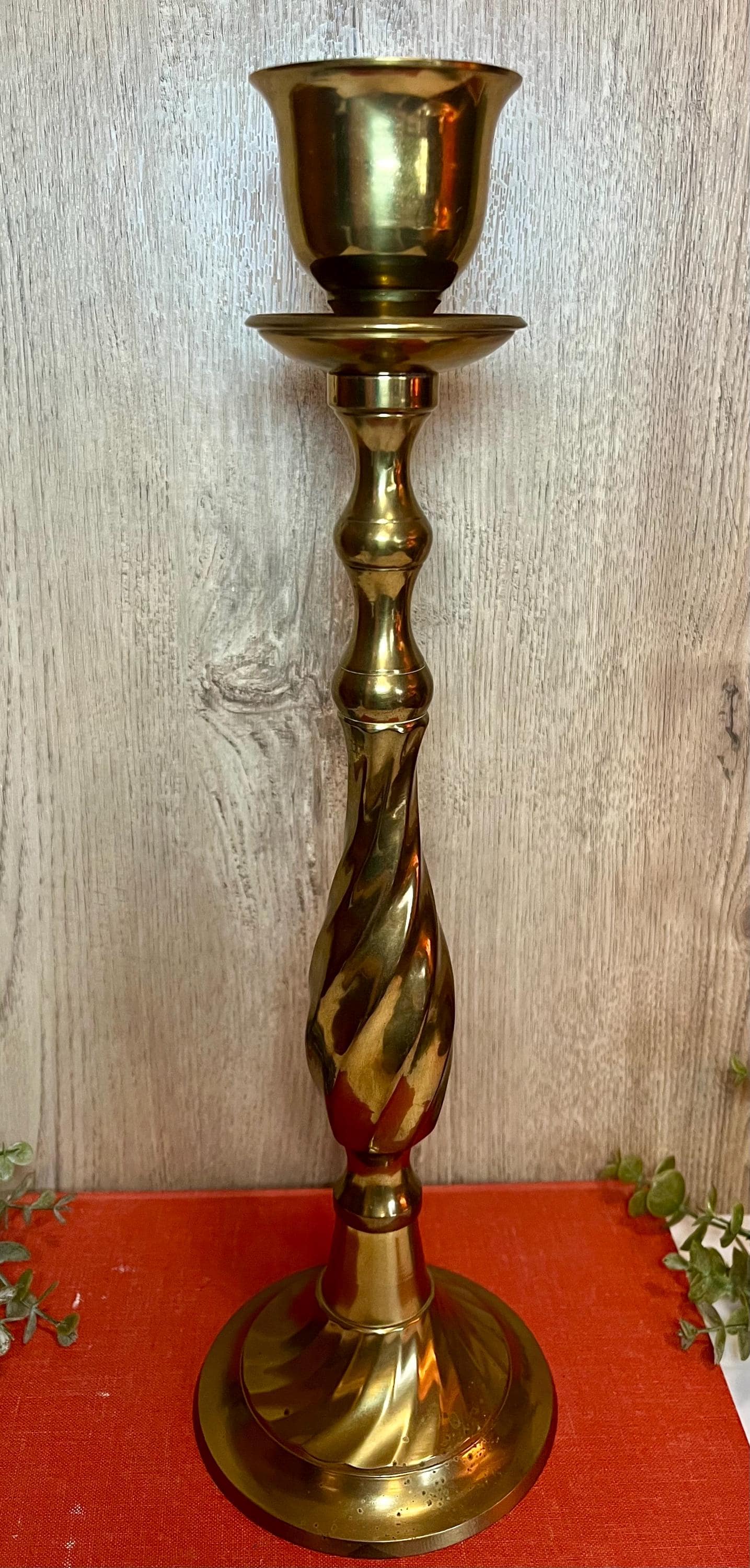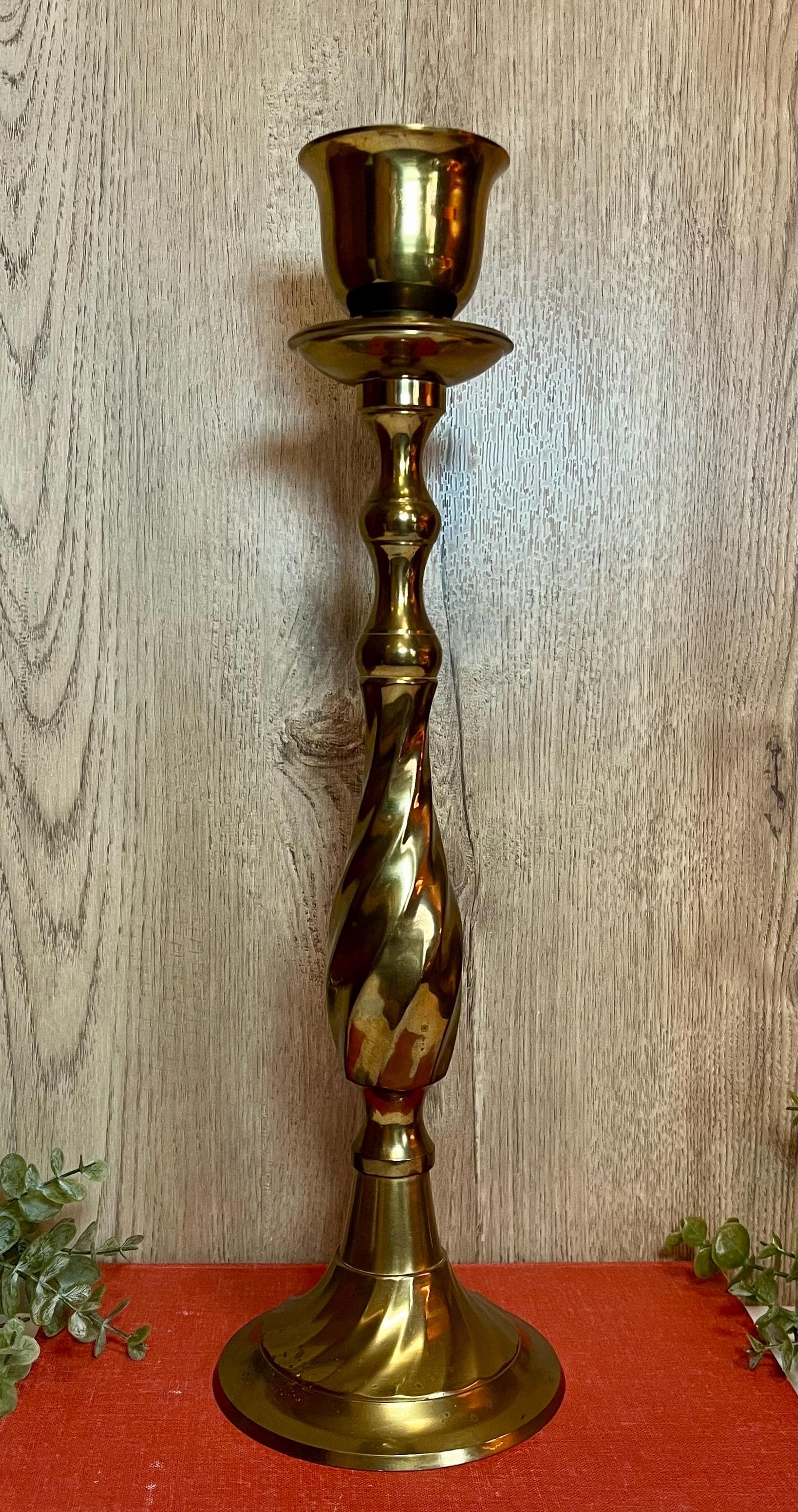 Beautiful vintage 15 1/2 inch brass swirl candlestick. A lovely aged patina with classic style. 4.5 inch base 15.5 inches tall. Holds a standard size taper candle or a tea light.