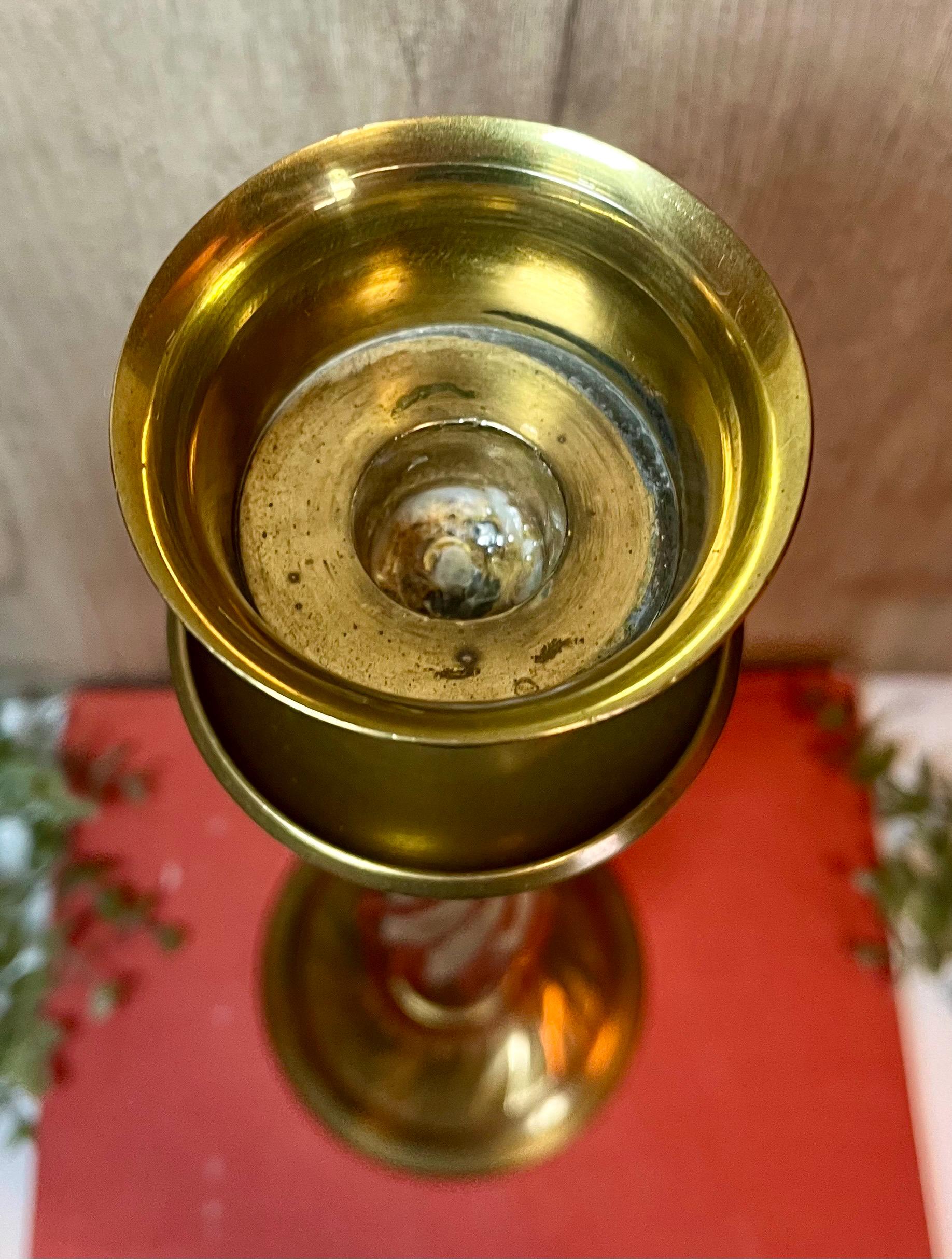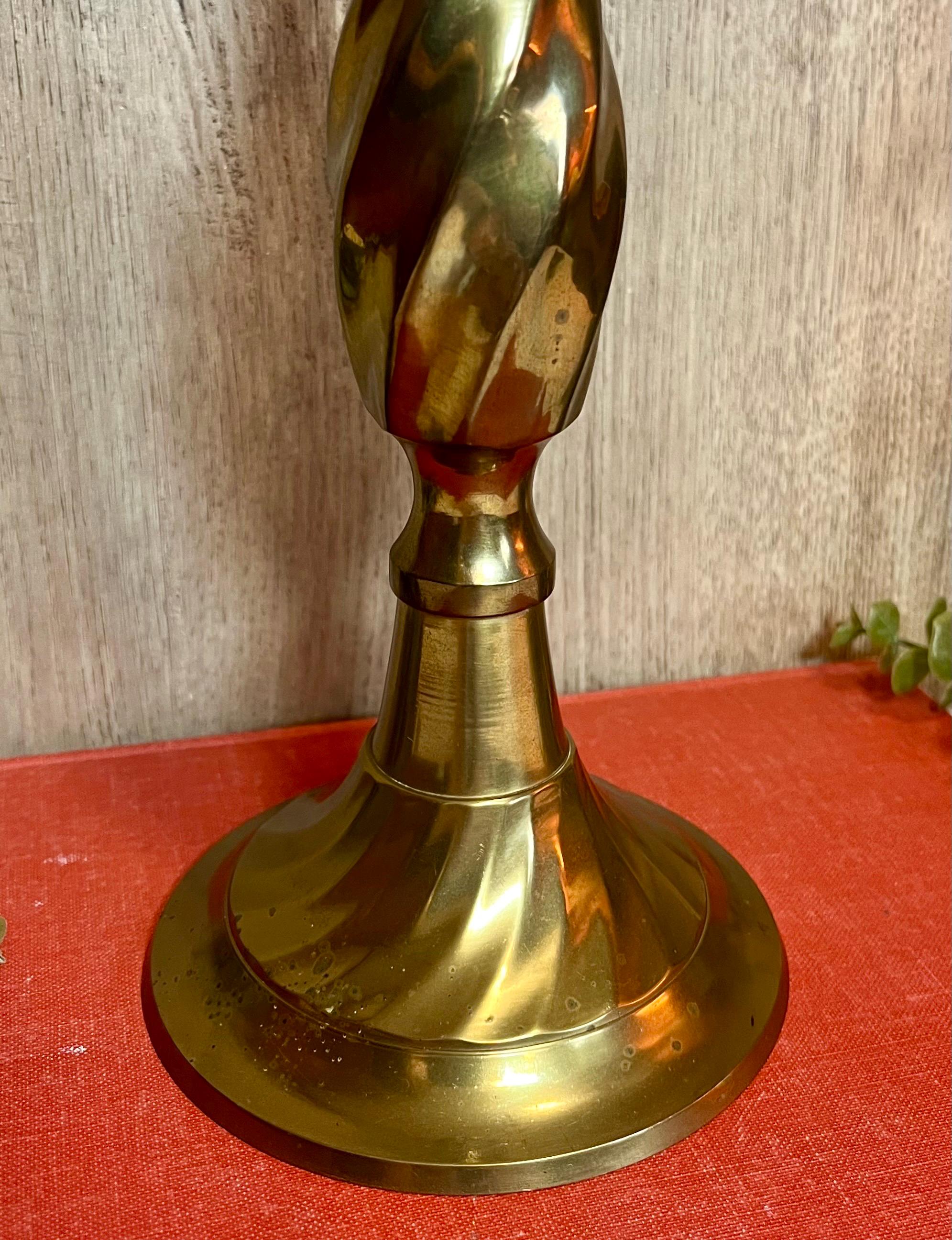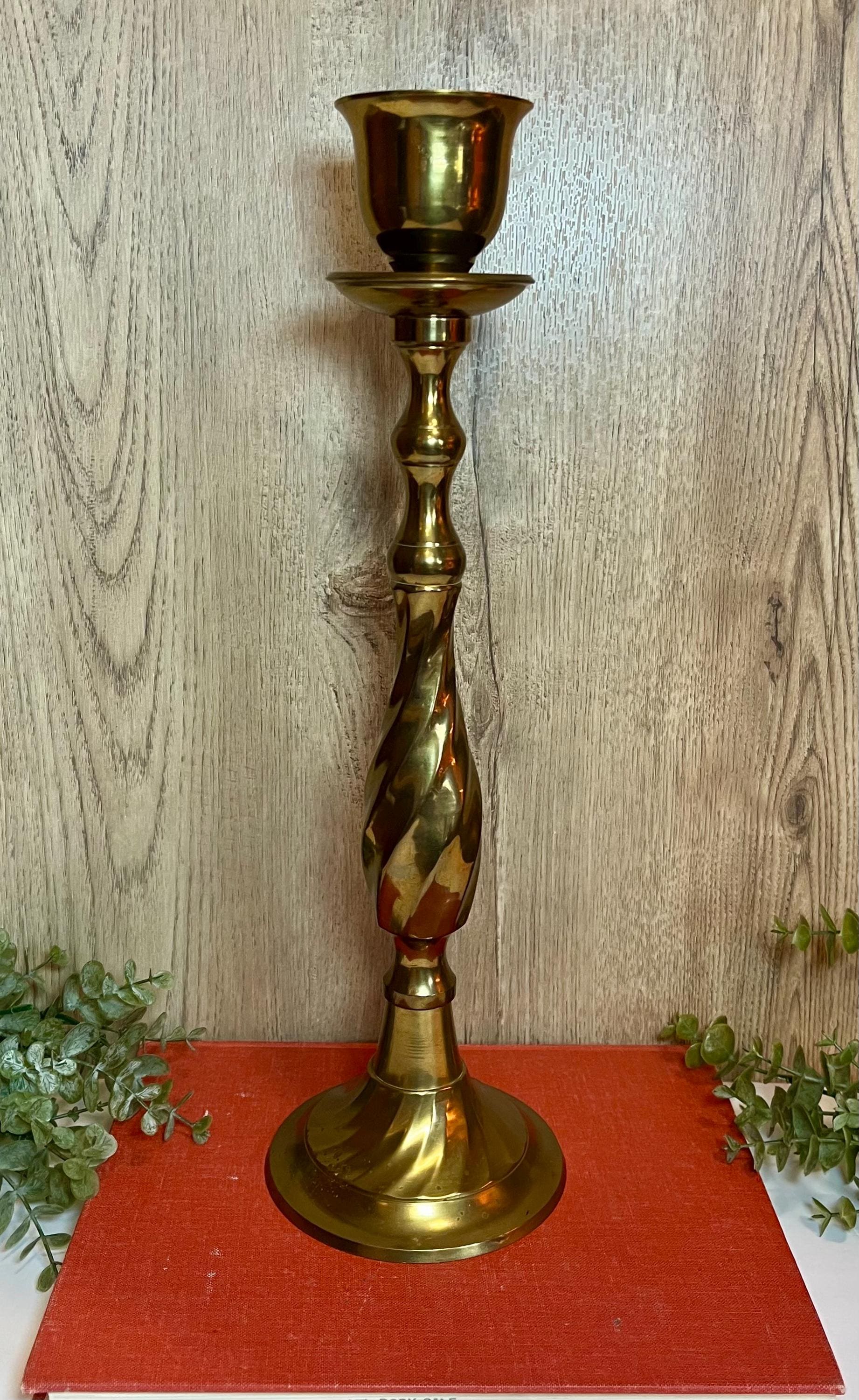 Beautiful vintage 15 1/2 inch brass swirl candlestick. A lovely aged patina with classic style. 4.5 inch base 15.5 inches tall. Holds a standard size taper candle or a tea light.