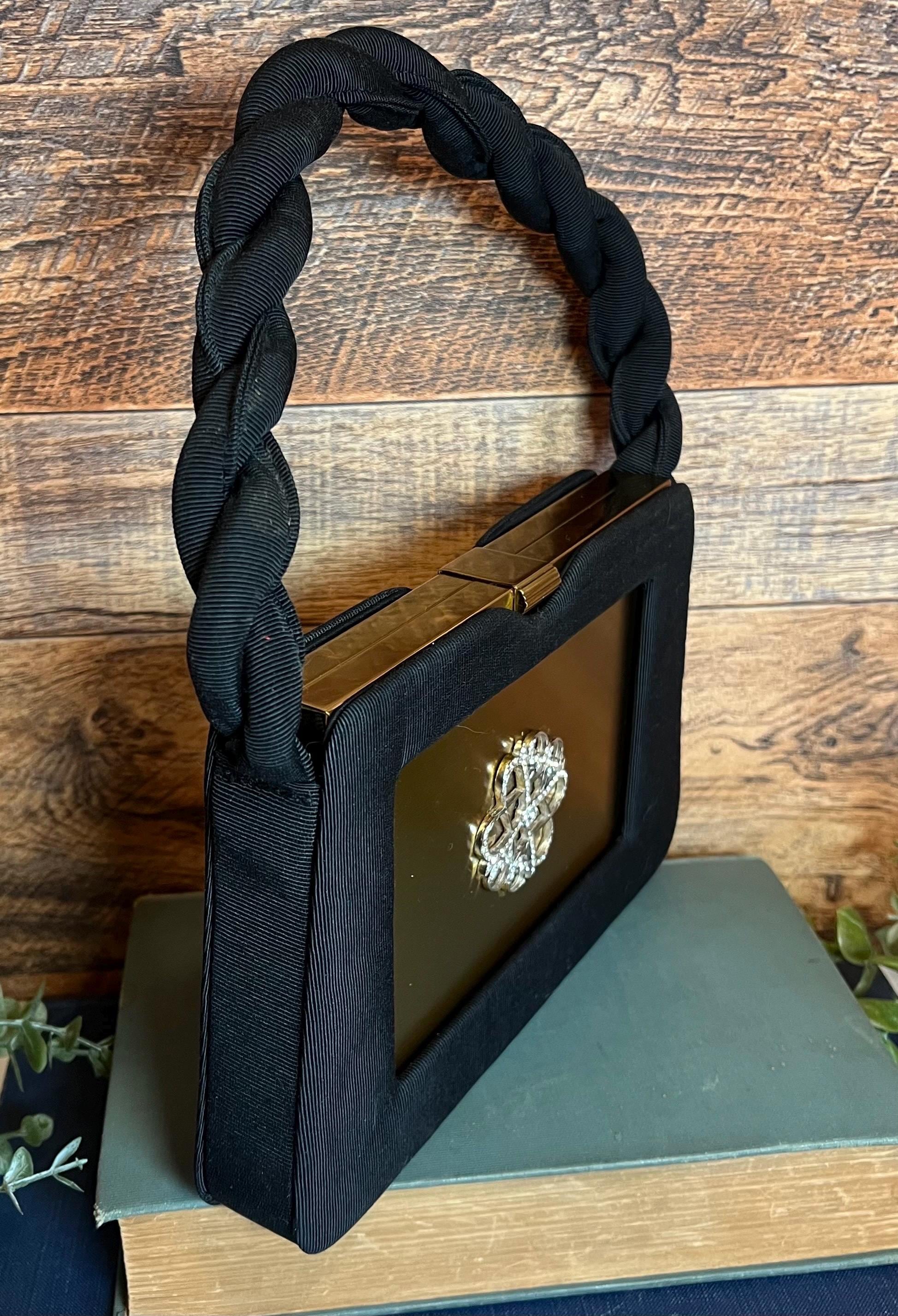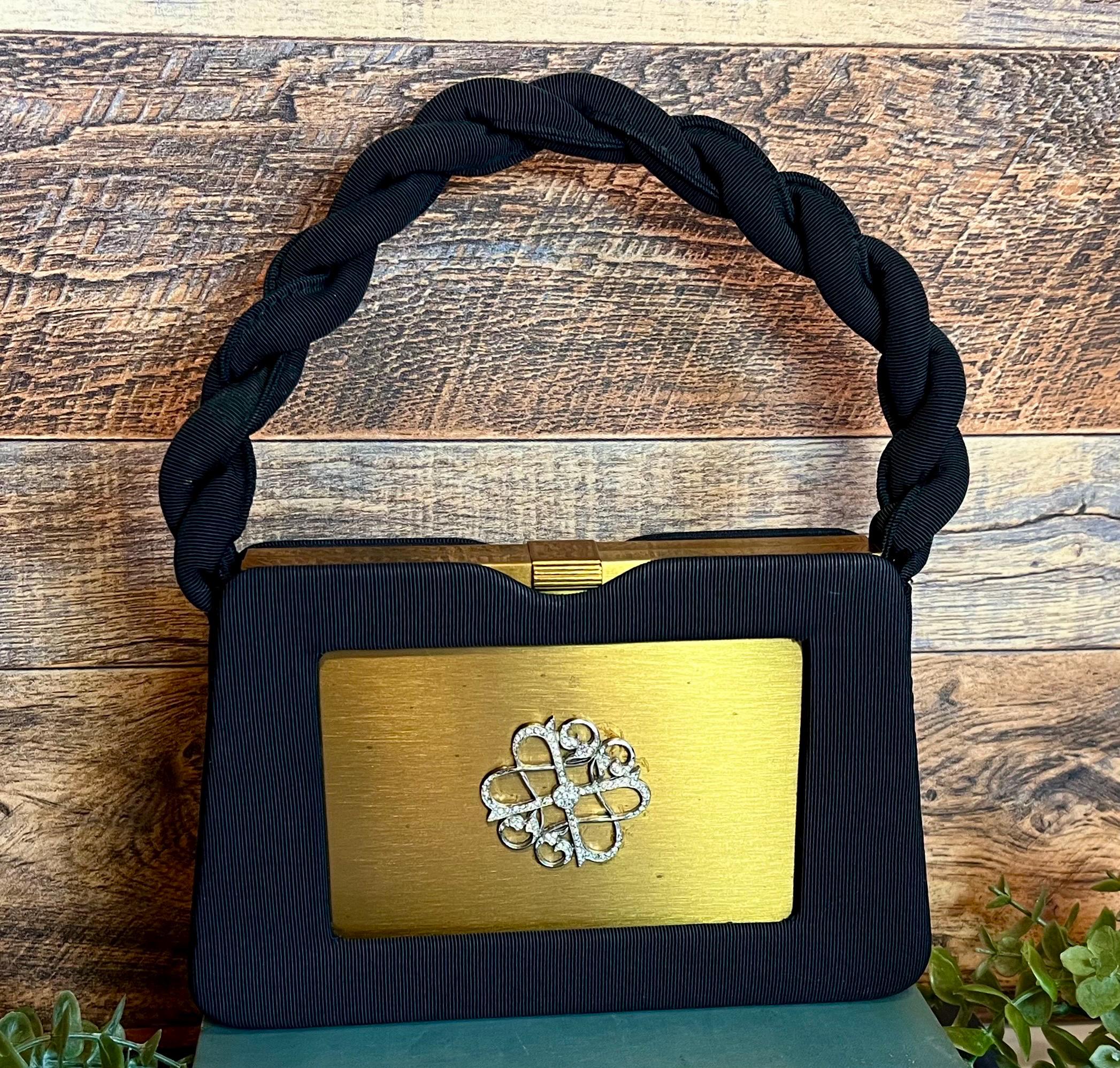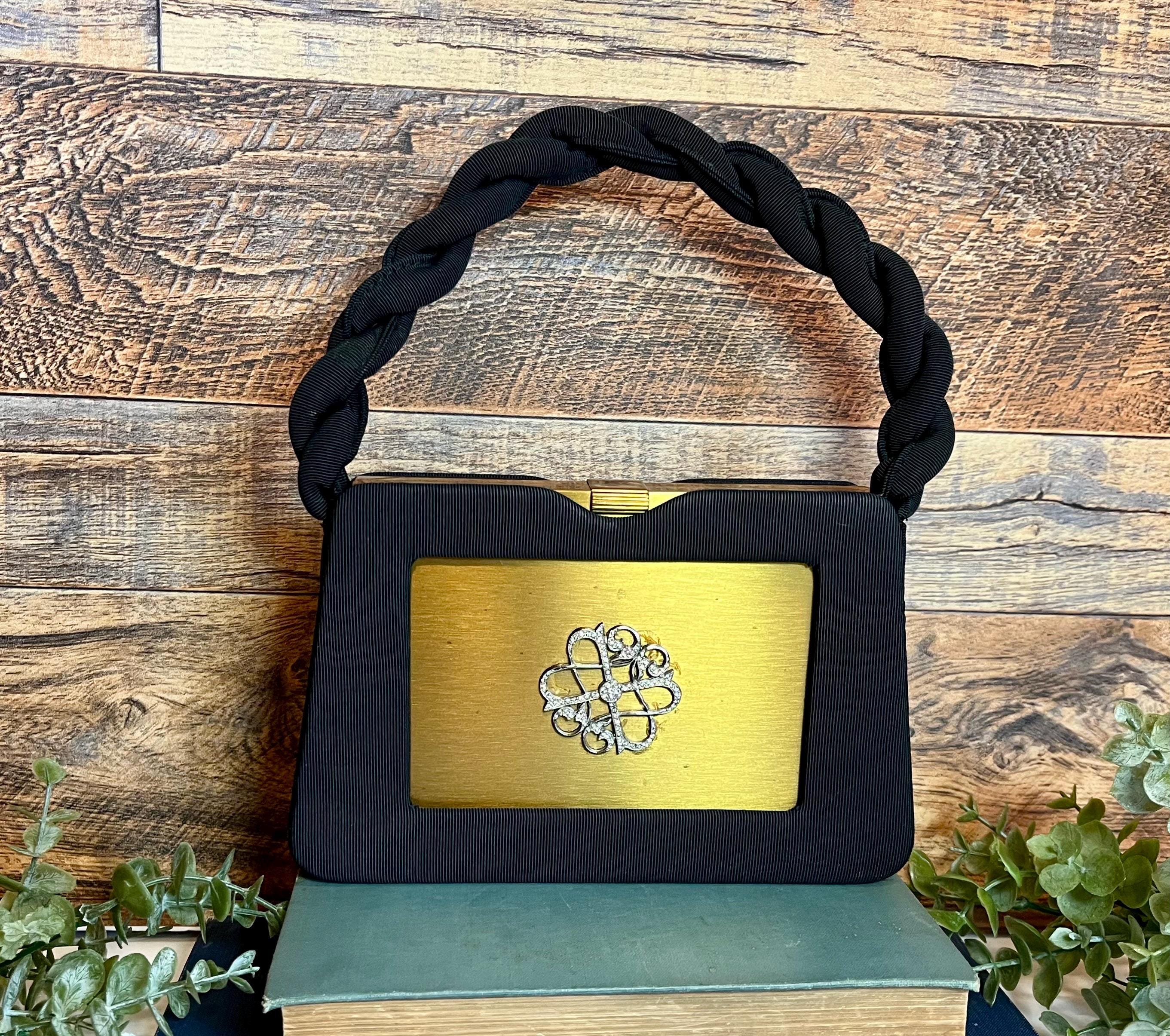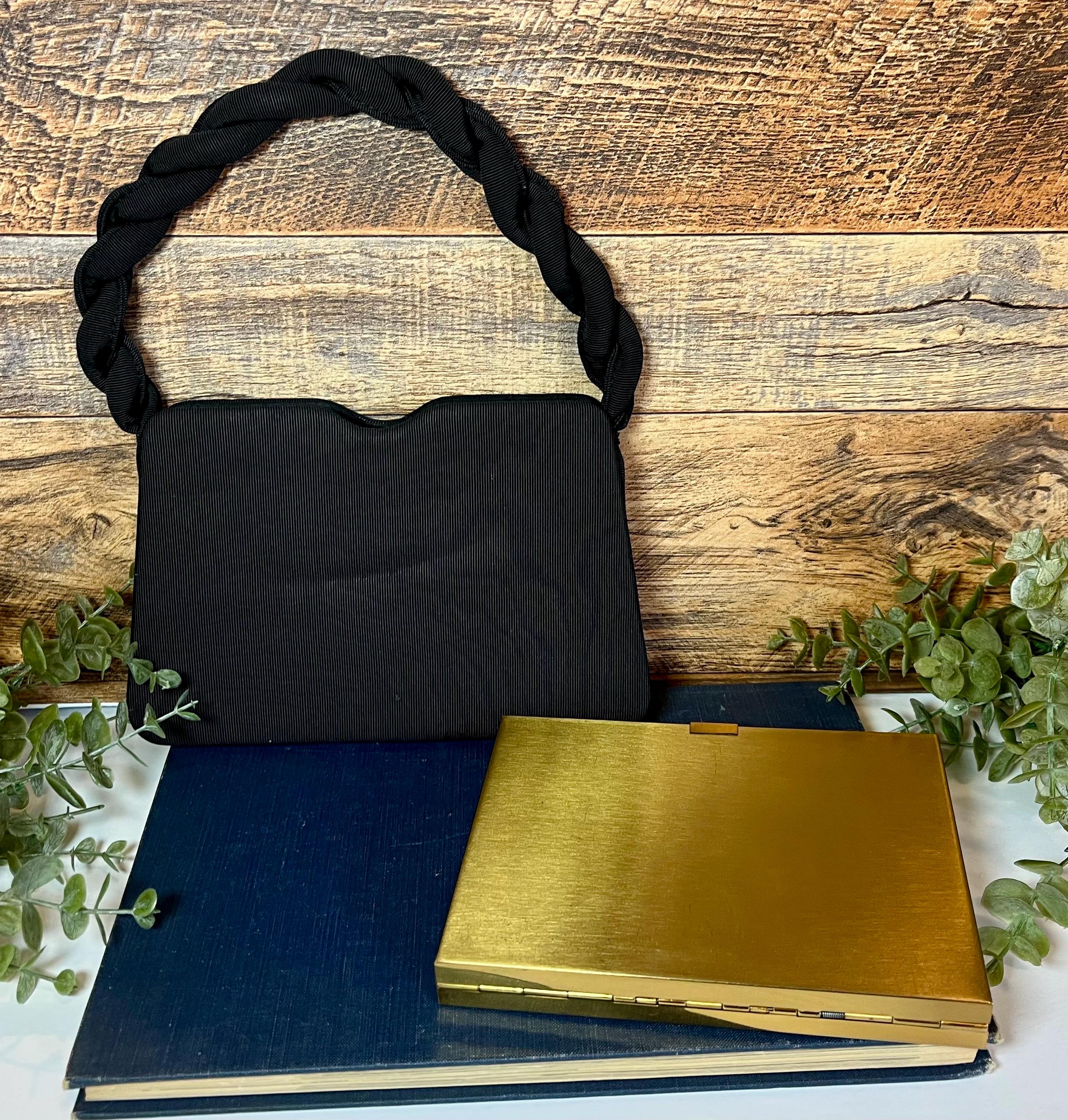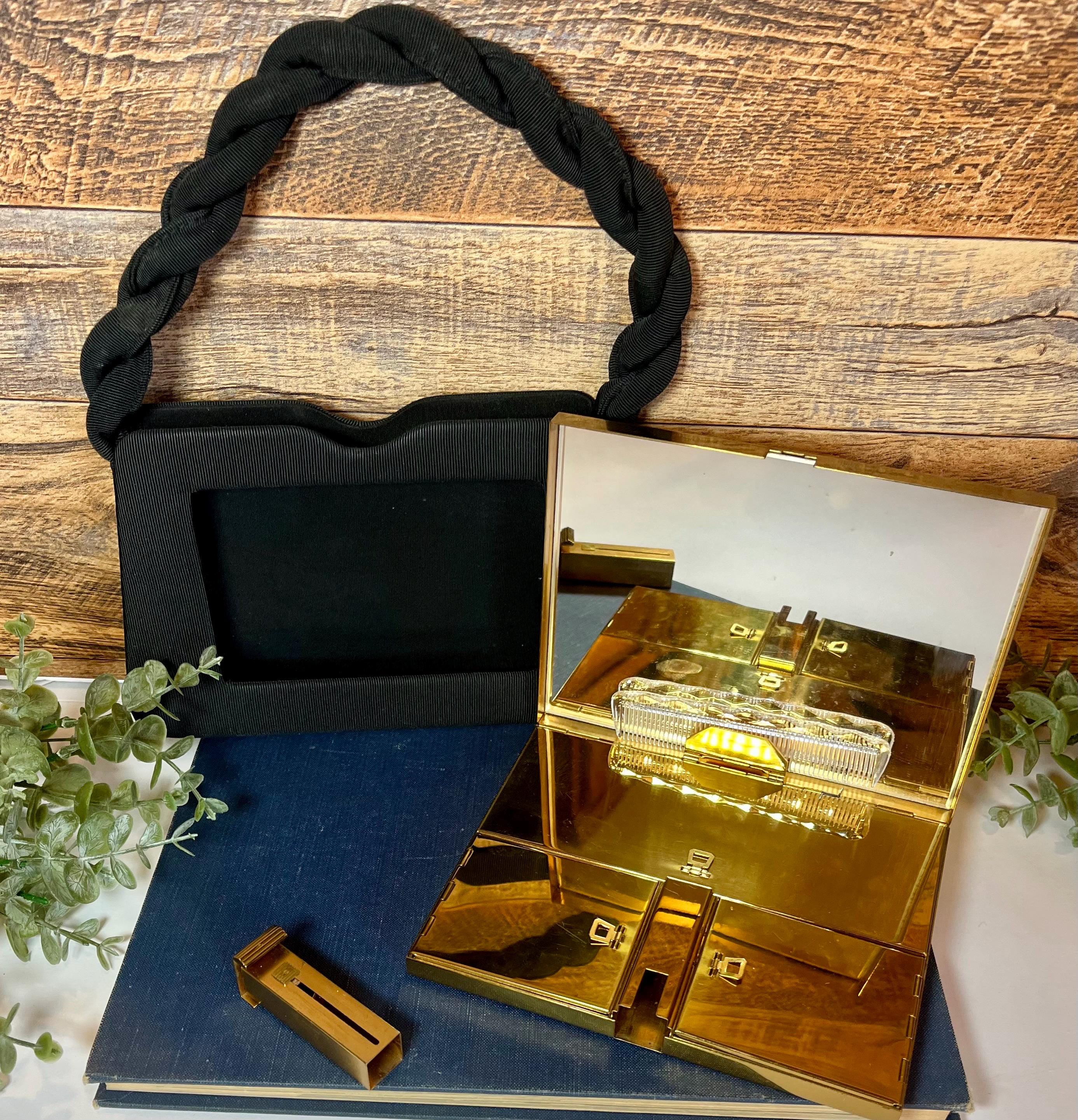 Features a black textured fabric handbag with padded twisted handle and a gold medal compact insert.