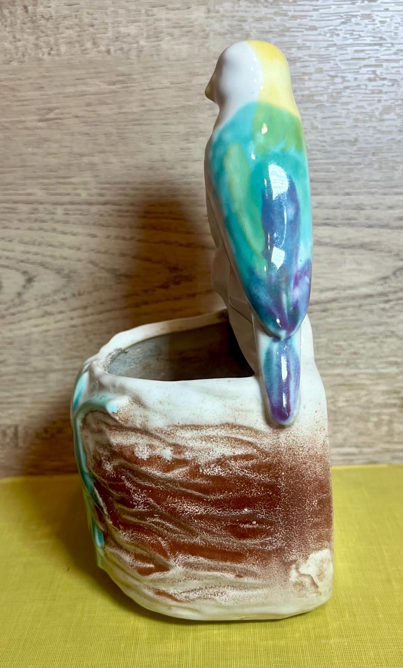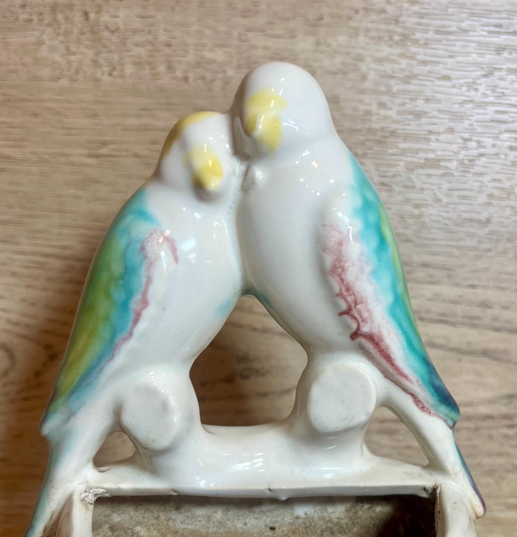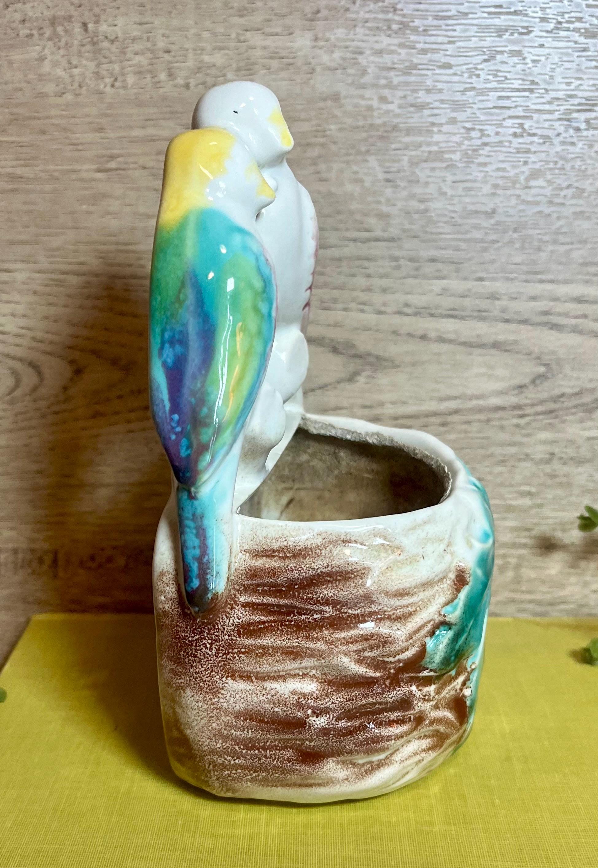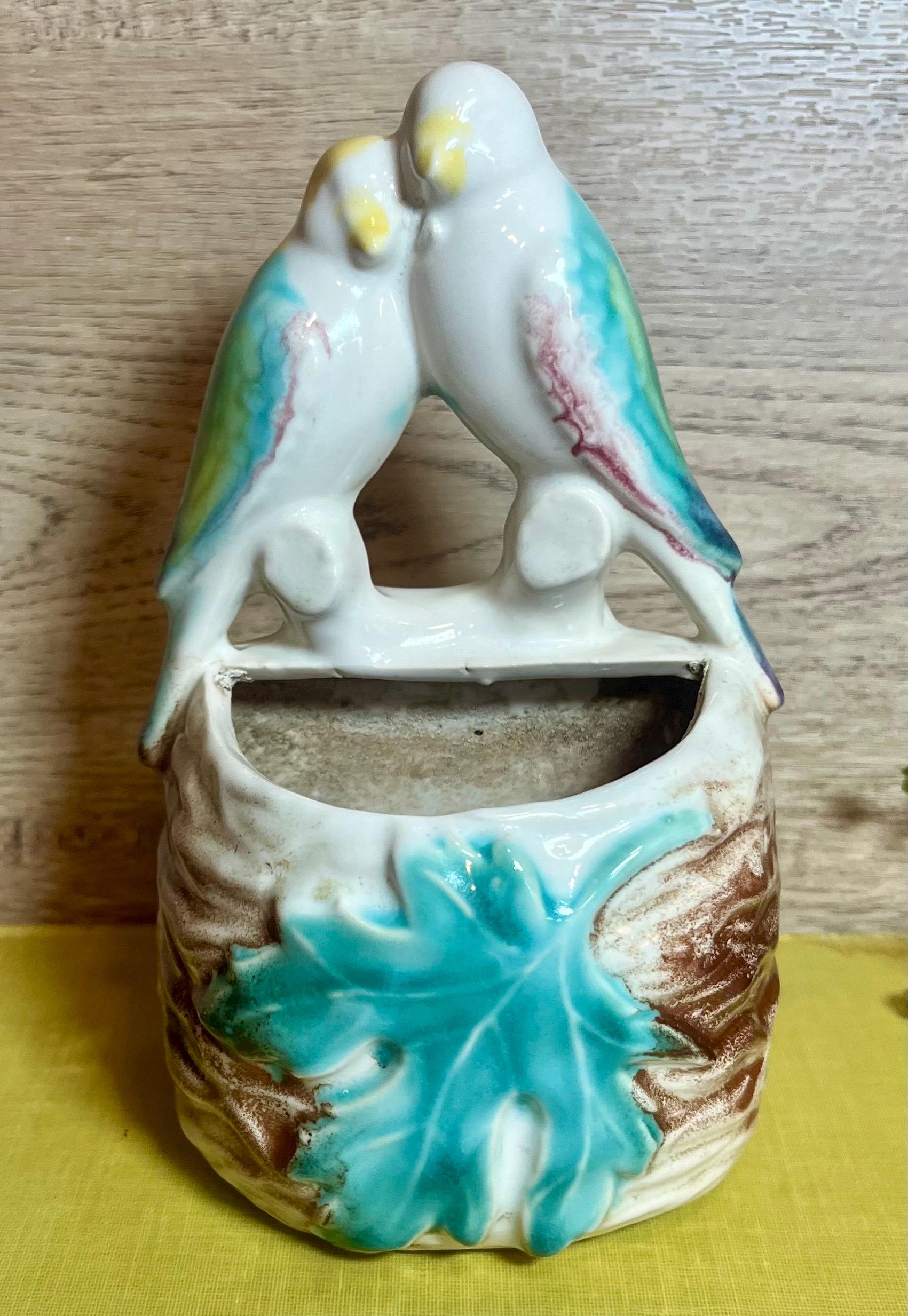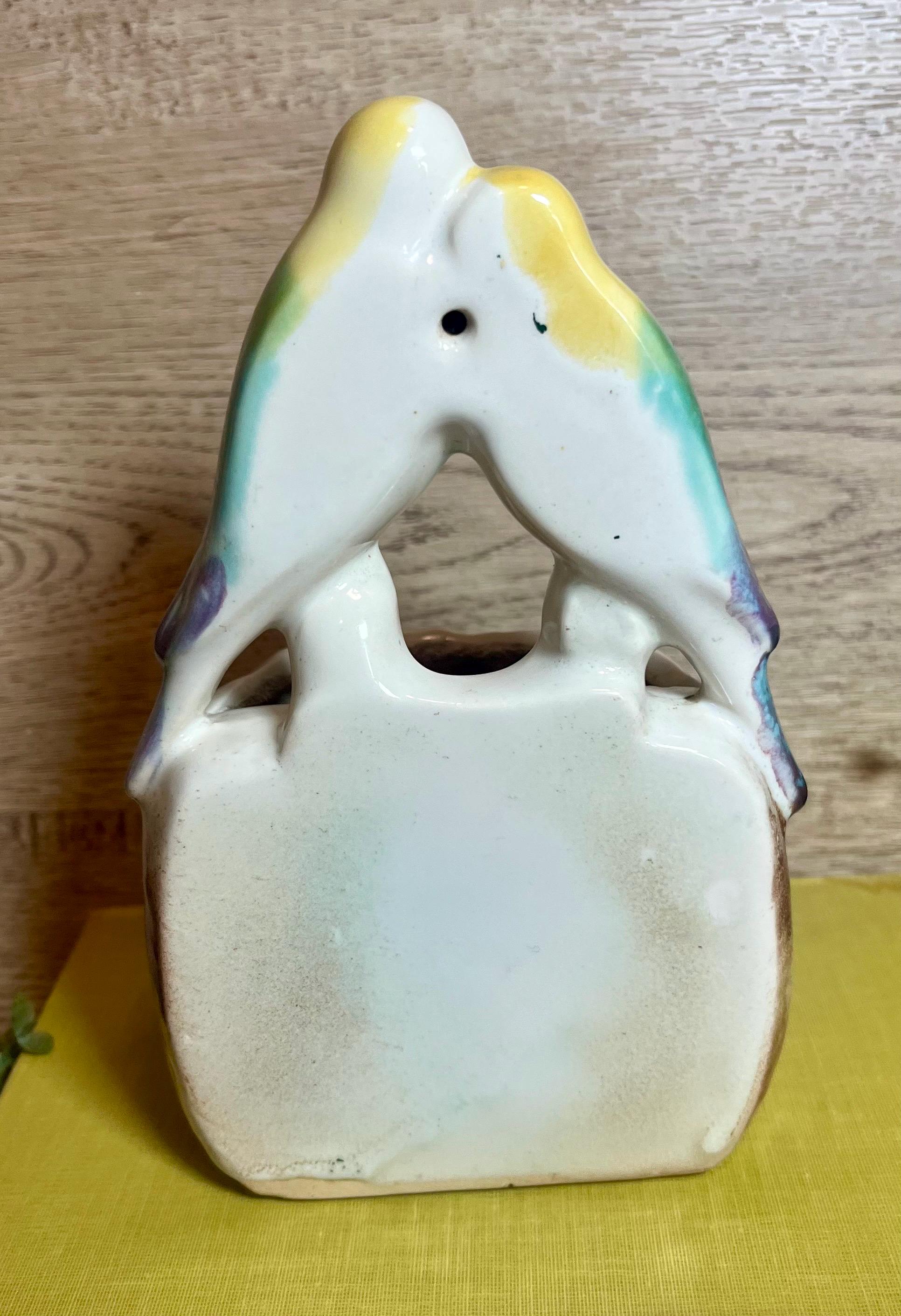 Sweet and romantic! This vintage Morton Pottery wall pocket features two colorful love birds perched above a leafy pocket. Perfect for displaying small flowers, greenery, or as a charming wall accent. A lovely collectible piece that adds a touch of mid-century whimsy to any space.