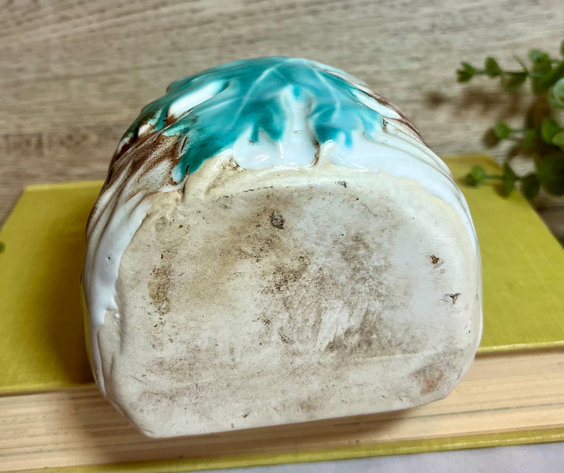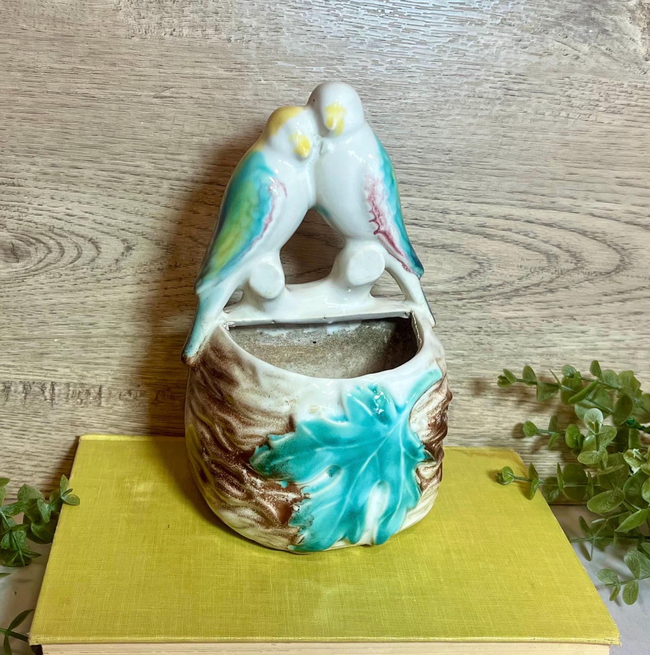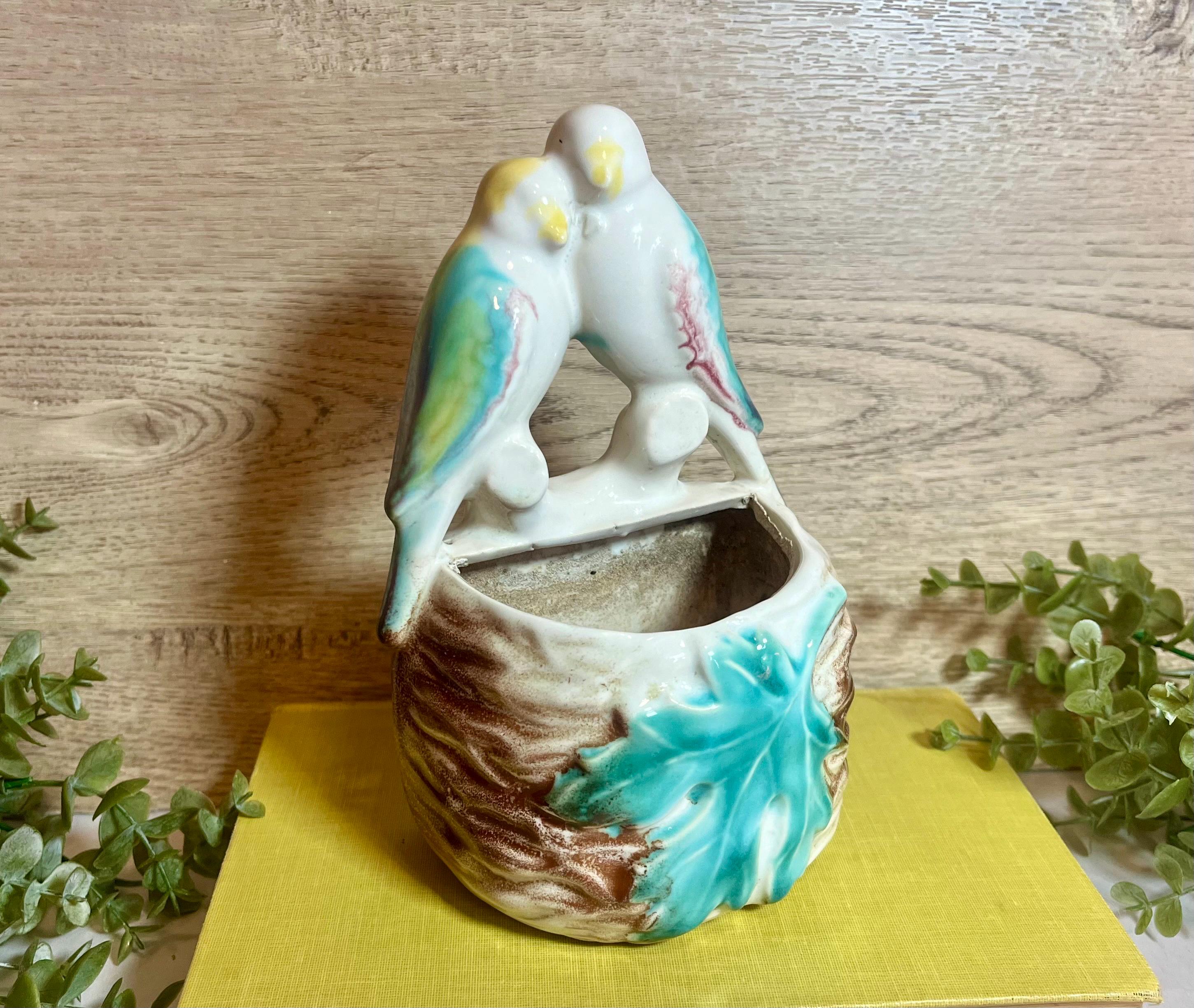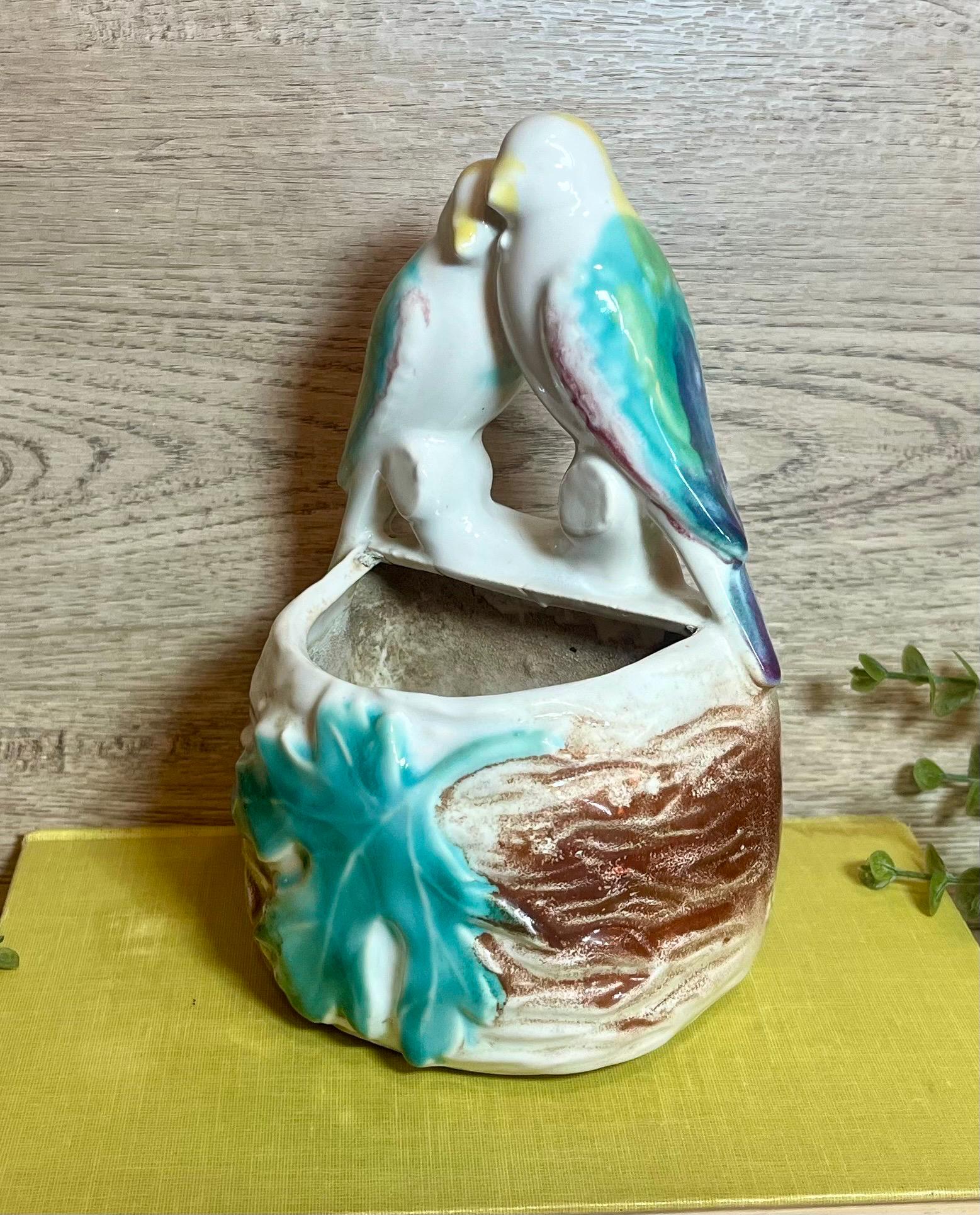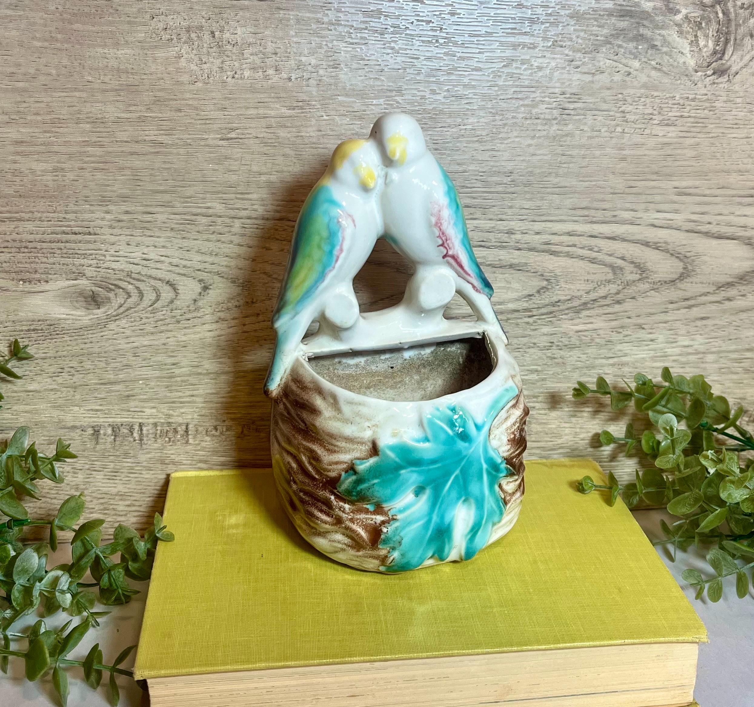 Details: • Maker: Morton Pottery • Design: Two love birds with leaf detail • Type: Wall pocket / wall vase • Dimensions: 7” tall x 4” wide x 3” deep • Condition: Vintage, with light wear consistent with age (see photos for details).