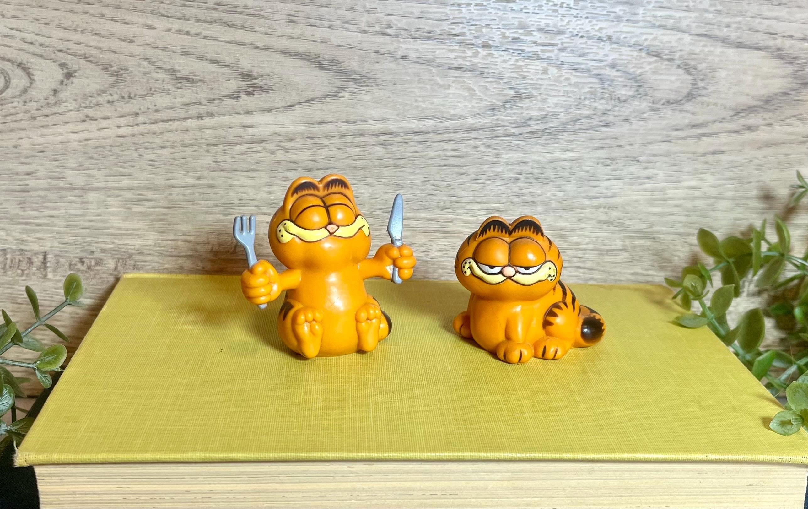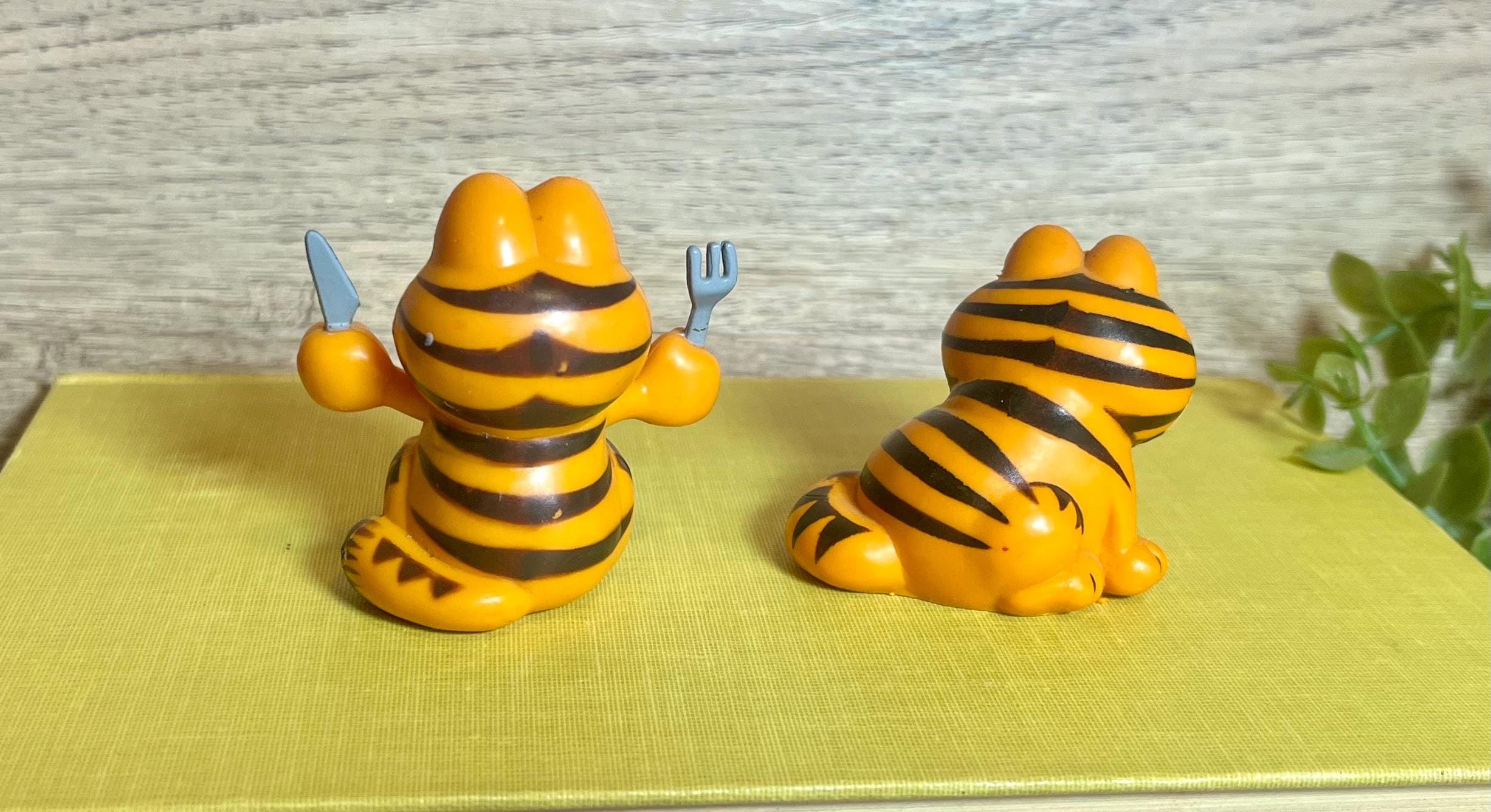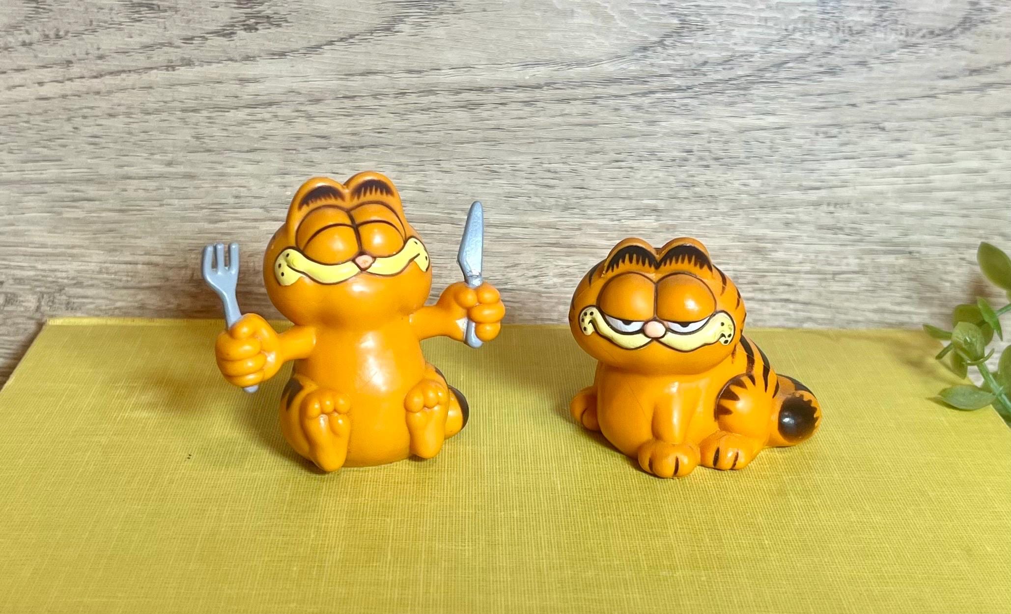 • Designs: One Garfield sitting contentedly, the other ready to eat with fork and knife in hand • Material: Hard plastic • Era: 1980s (classic Garfield style) • Condition: Good vintage condition with minor wear consistent with age (see photos for details) • Size: Approx. 2–3 inches tall