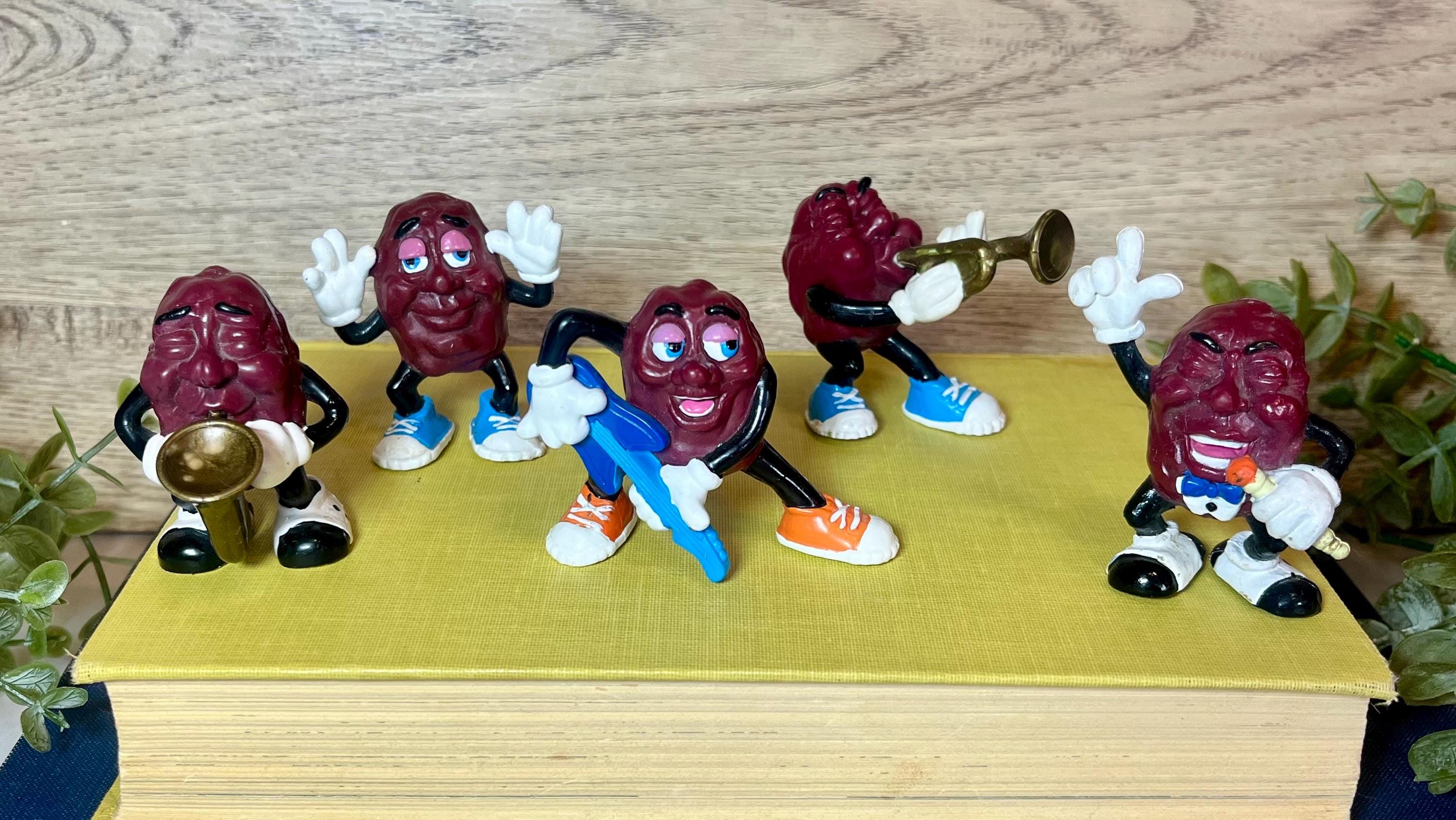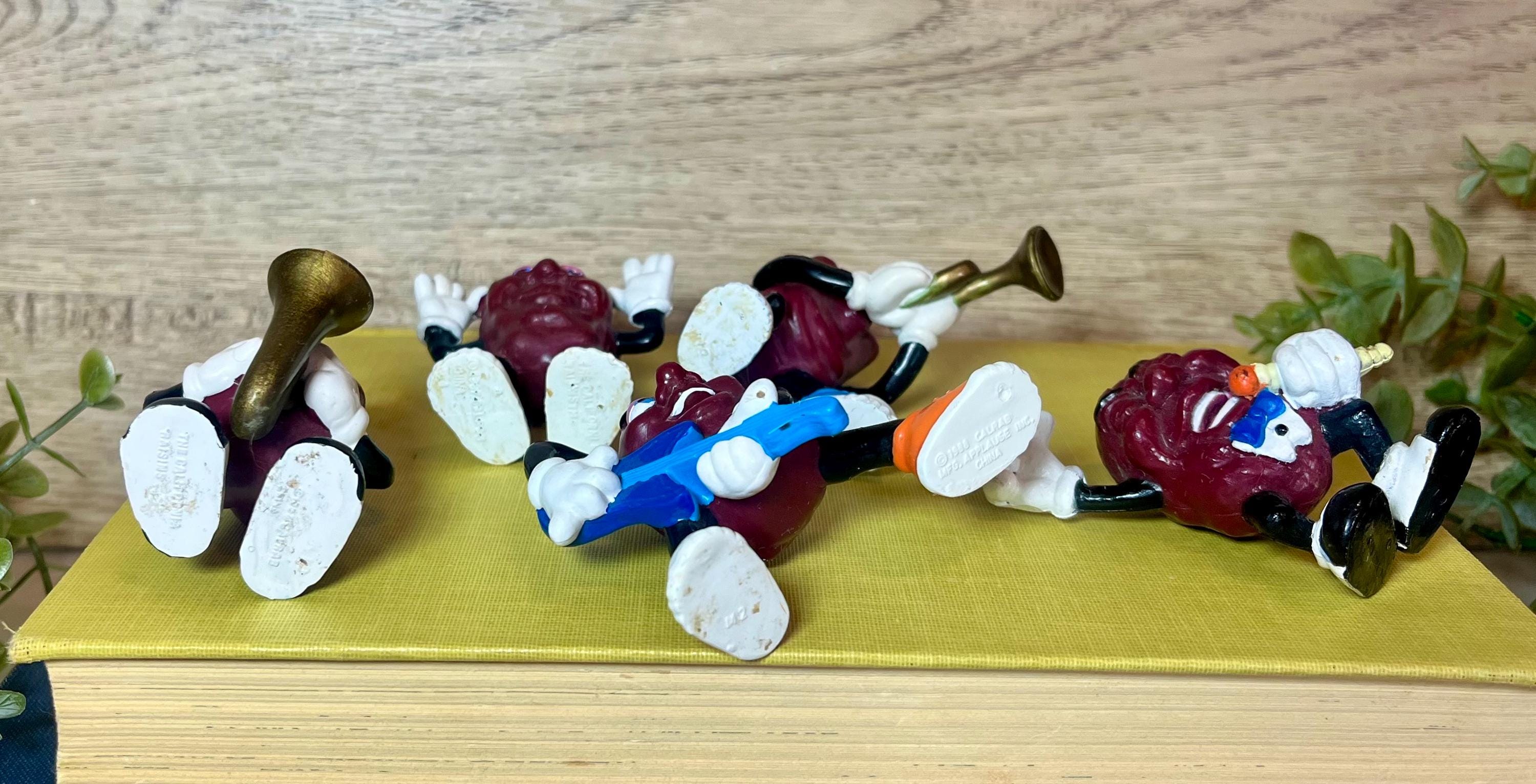 Bring a touch of retro charm to your collection with this set of 5 vintage California Raisins figurines! These iconic 1980s collectibles feature the beloved raisin characters in fun band poses—singing, playing instruments, and rocking out with their cool sneakers and classic expressions.