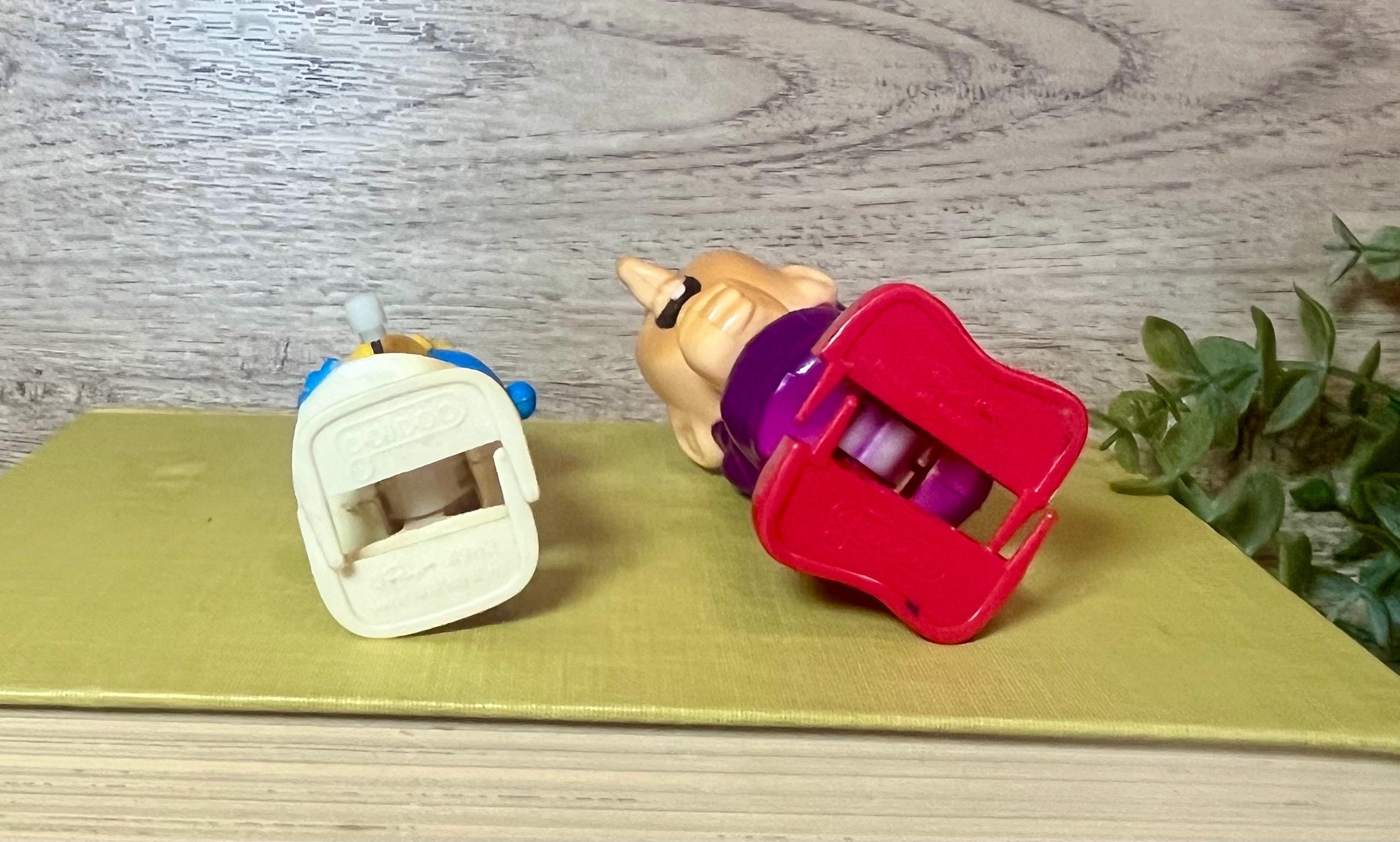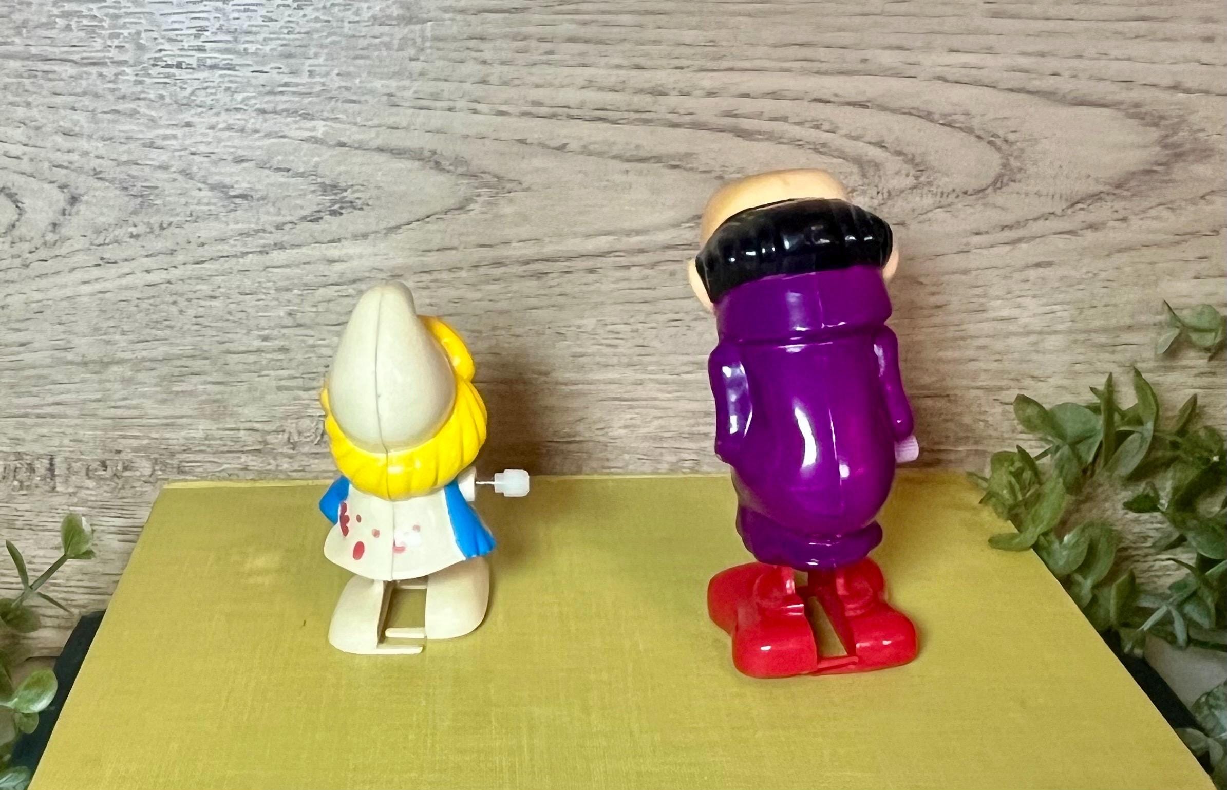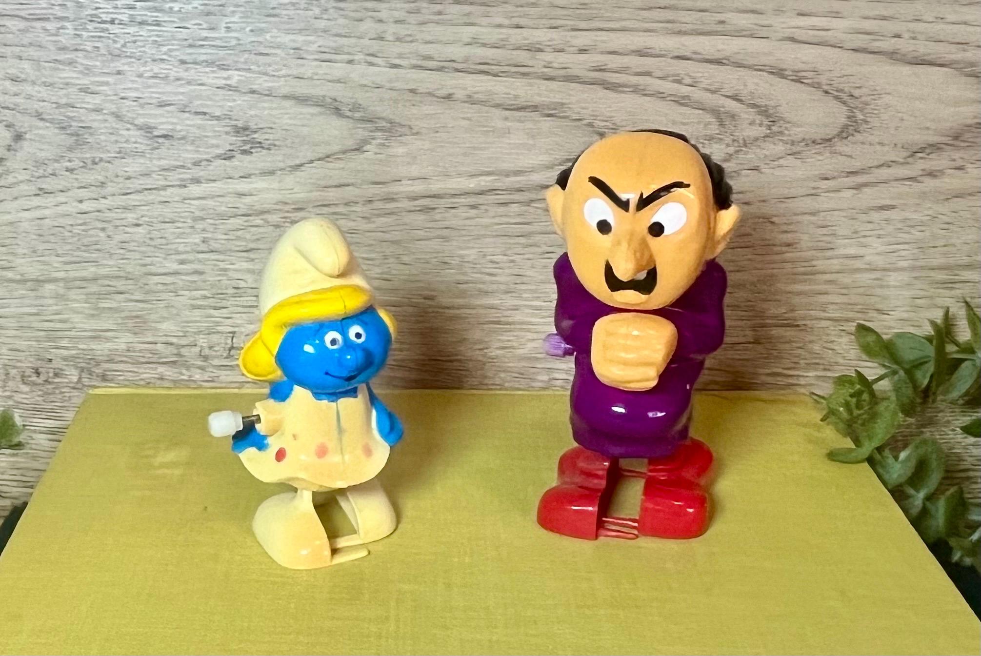 Included in this set: • Smurfette in a cream-colored dress with polka dots and blonde hair (wind-up walking toy) • Gargamel in his signature purple robe with red shoes (wind-up walking toy)