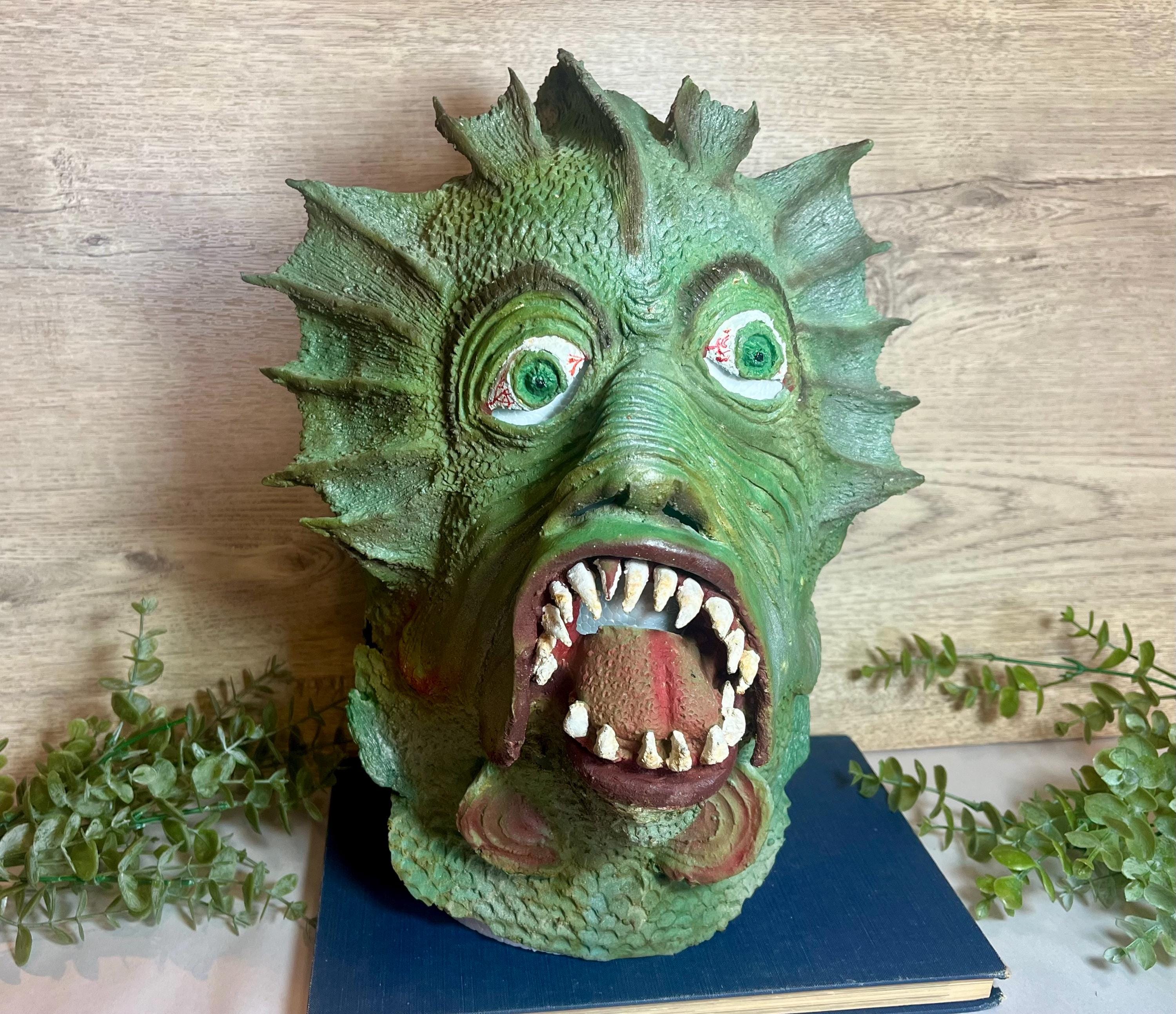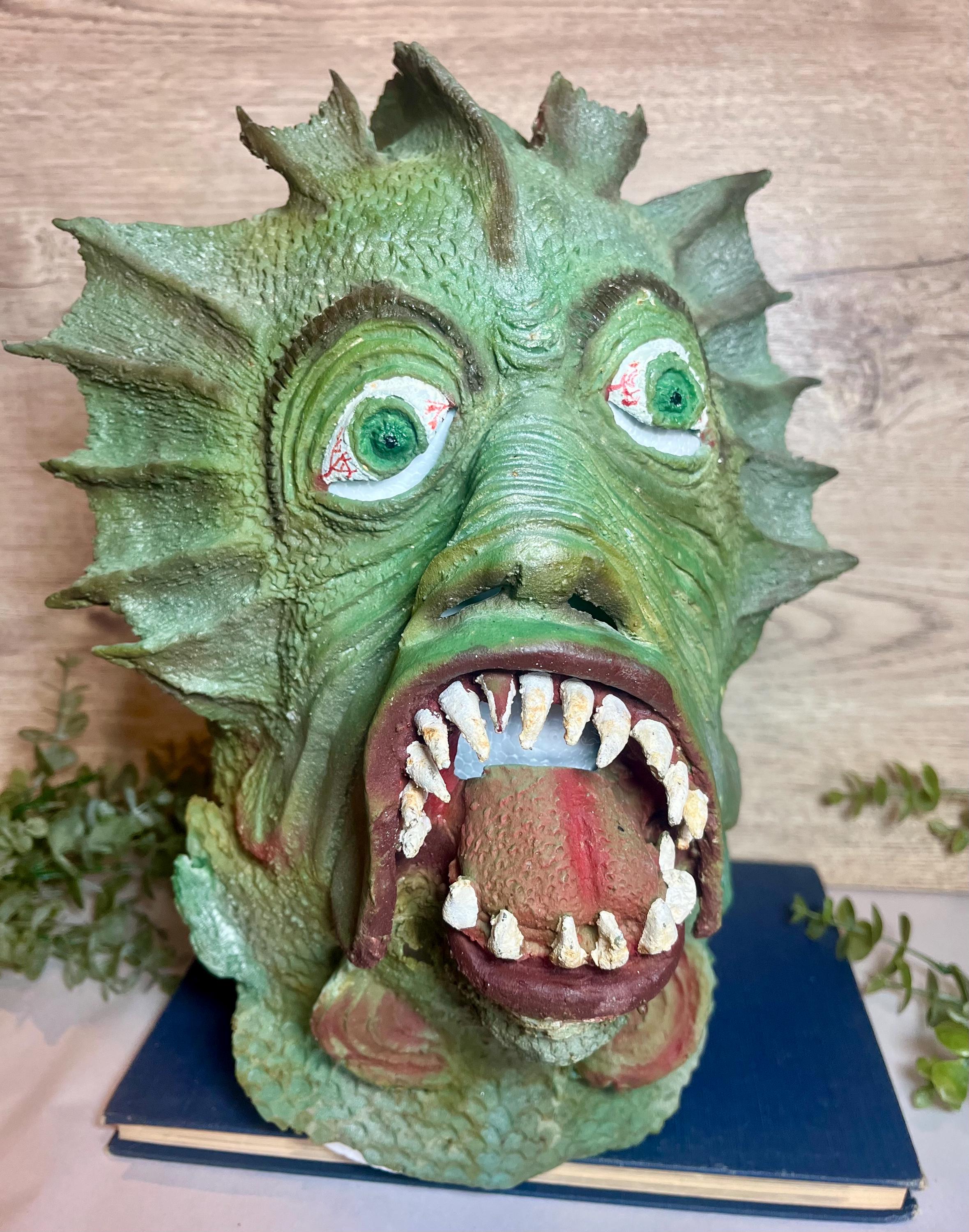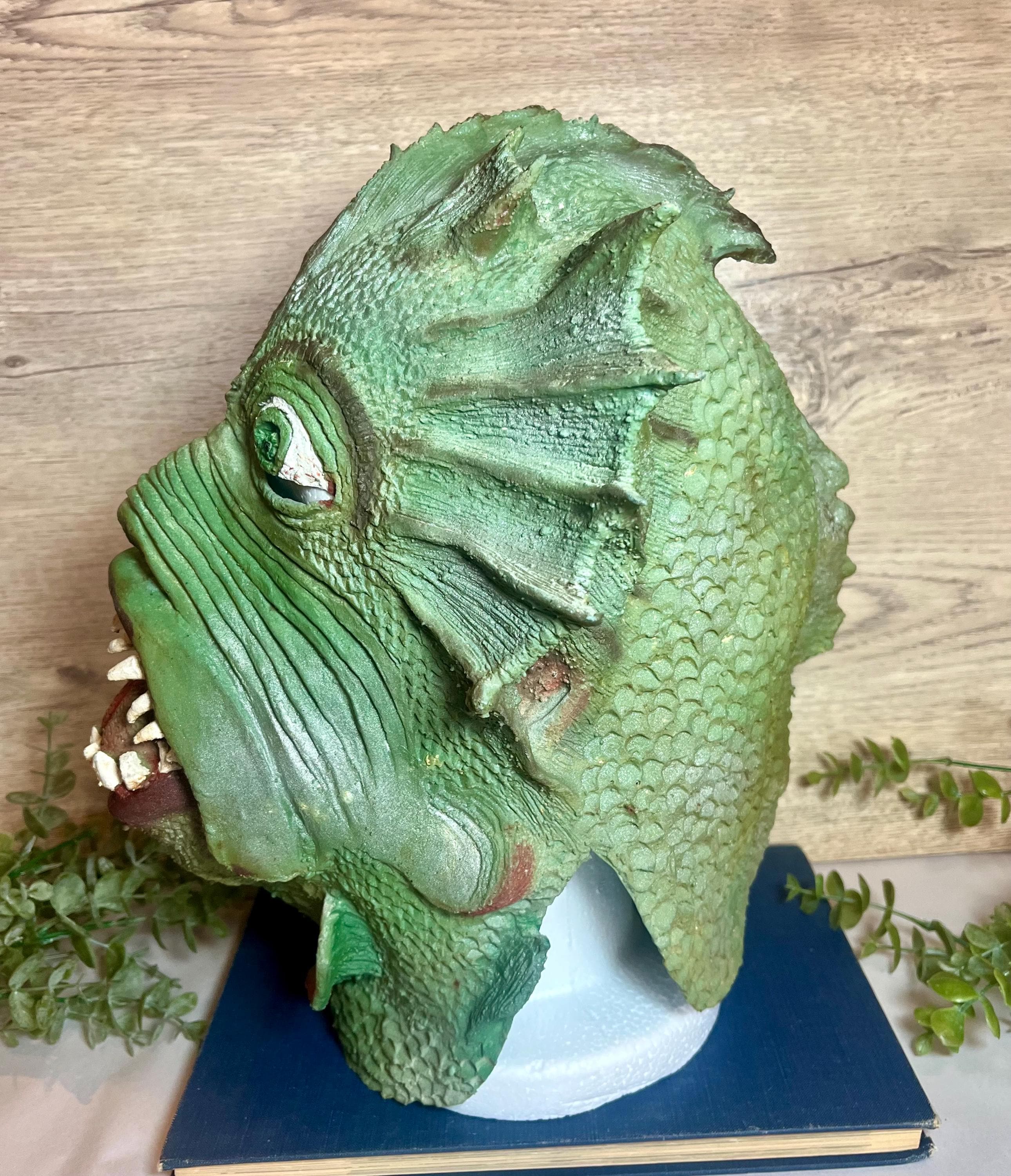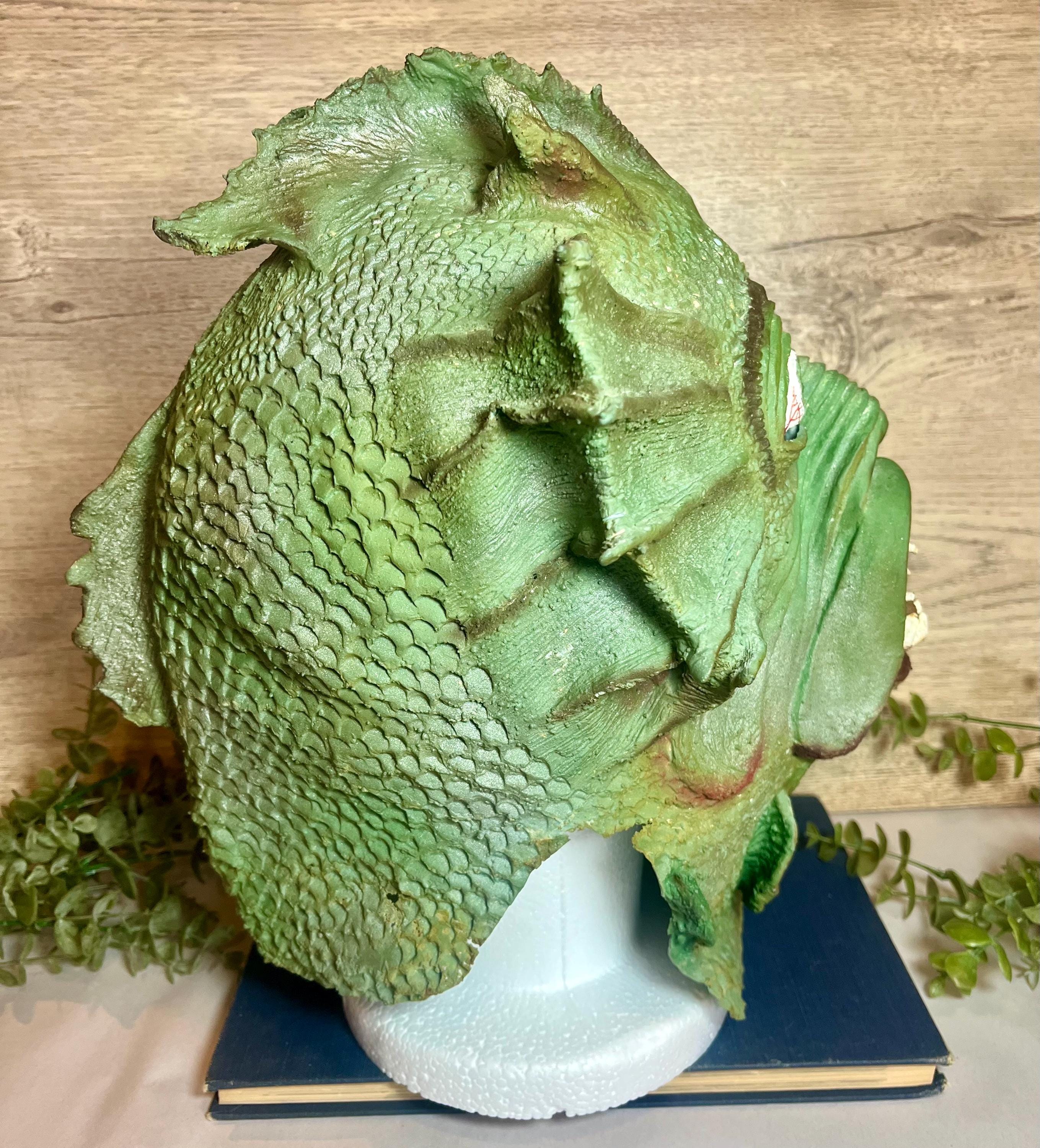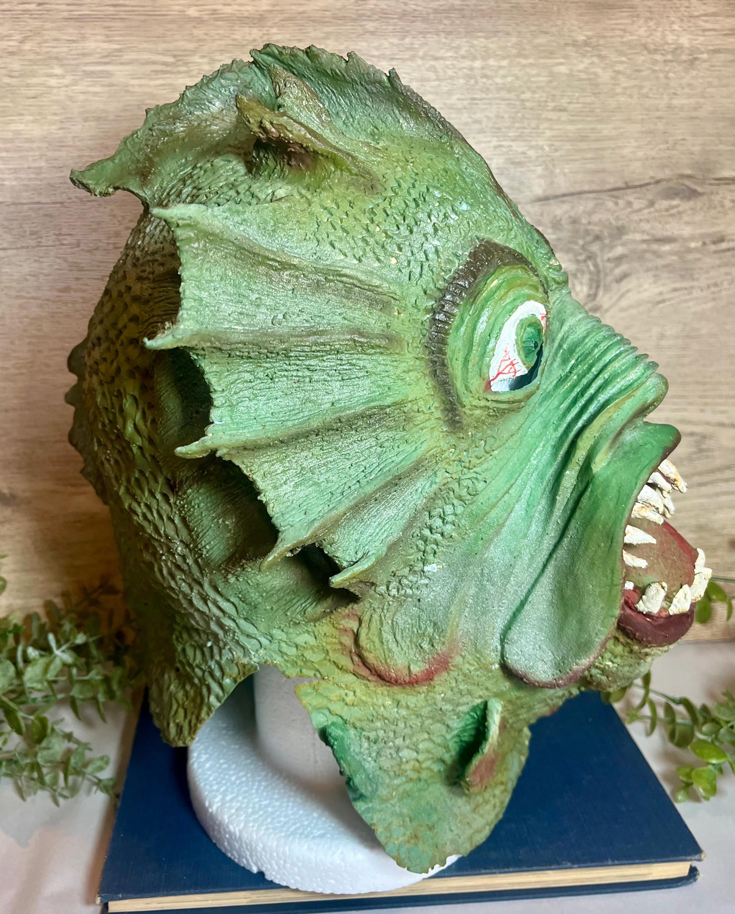 Bring a frightful touch of retro horror to your collection with this vintage Creature from the Black Lagoon monster mask! Featuring bulging green eyes, scaly skin texture, and sharp fang-like teeth, this latex mask is both eerie and unique — perfect for collectors of classic monster memorabilia, Halloween enthusiasts, or as a display piece.