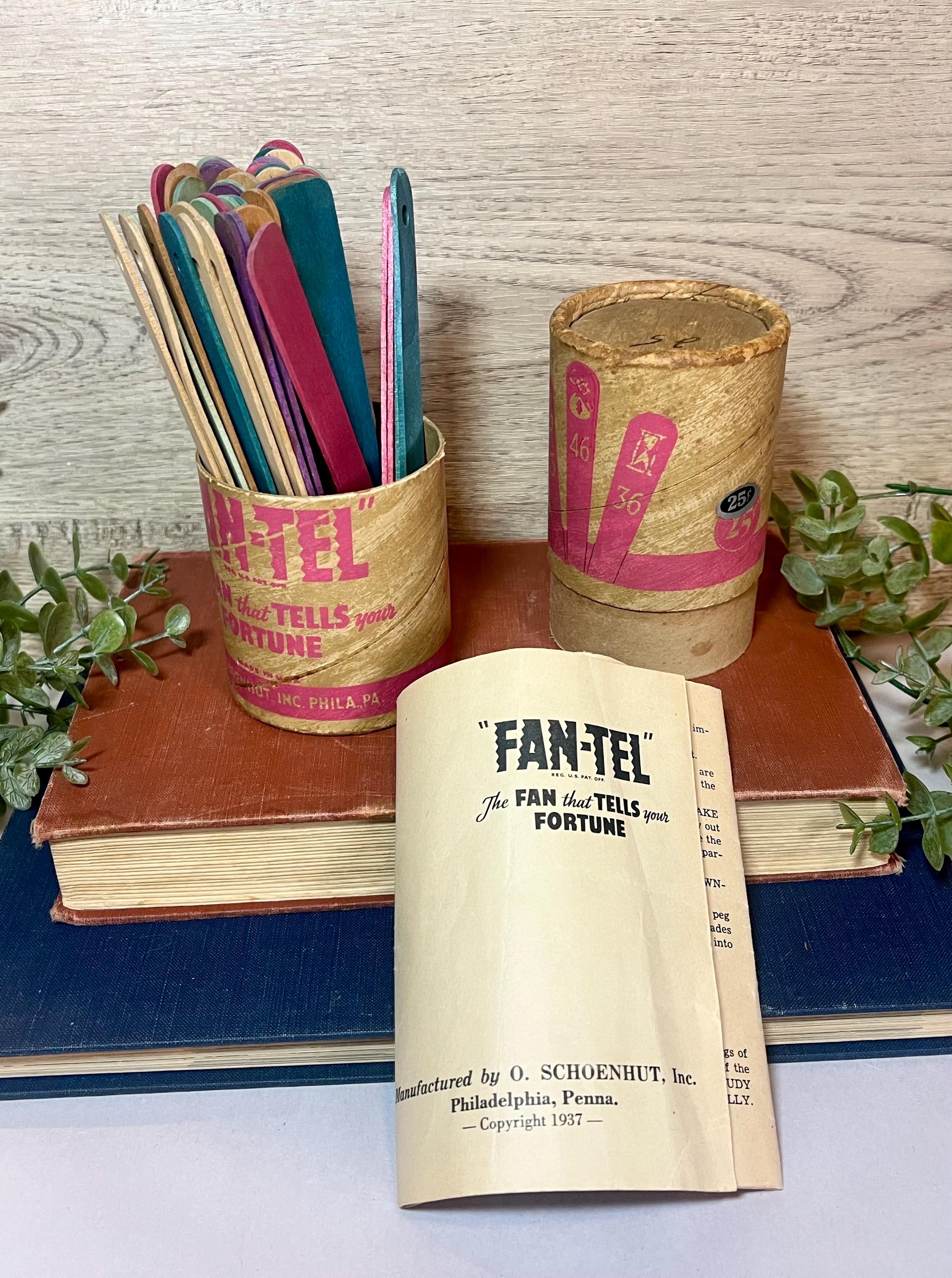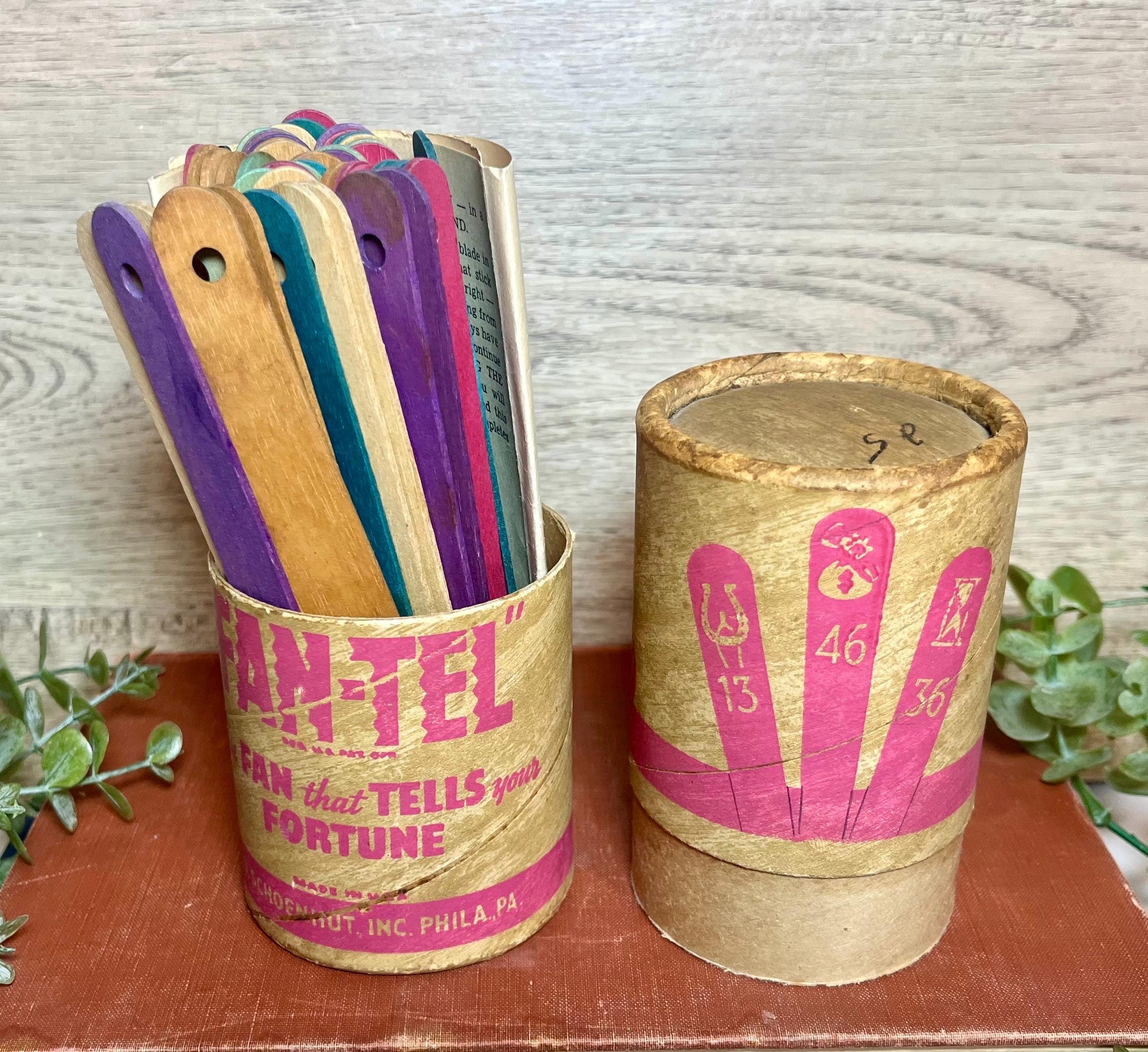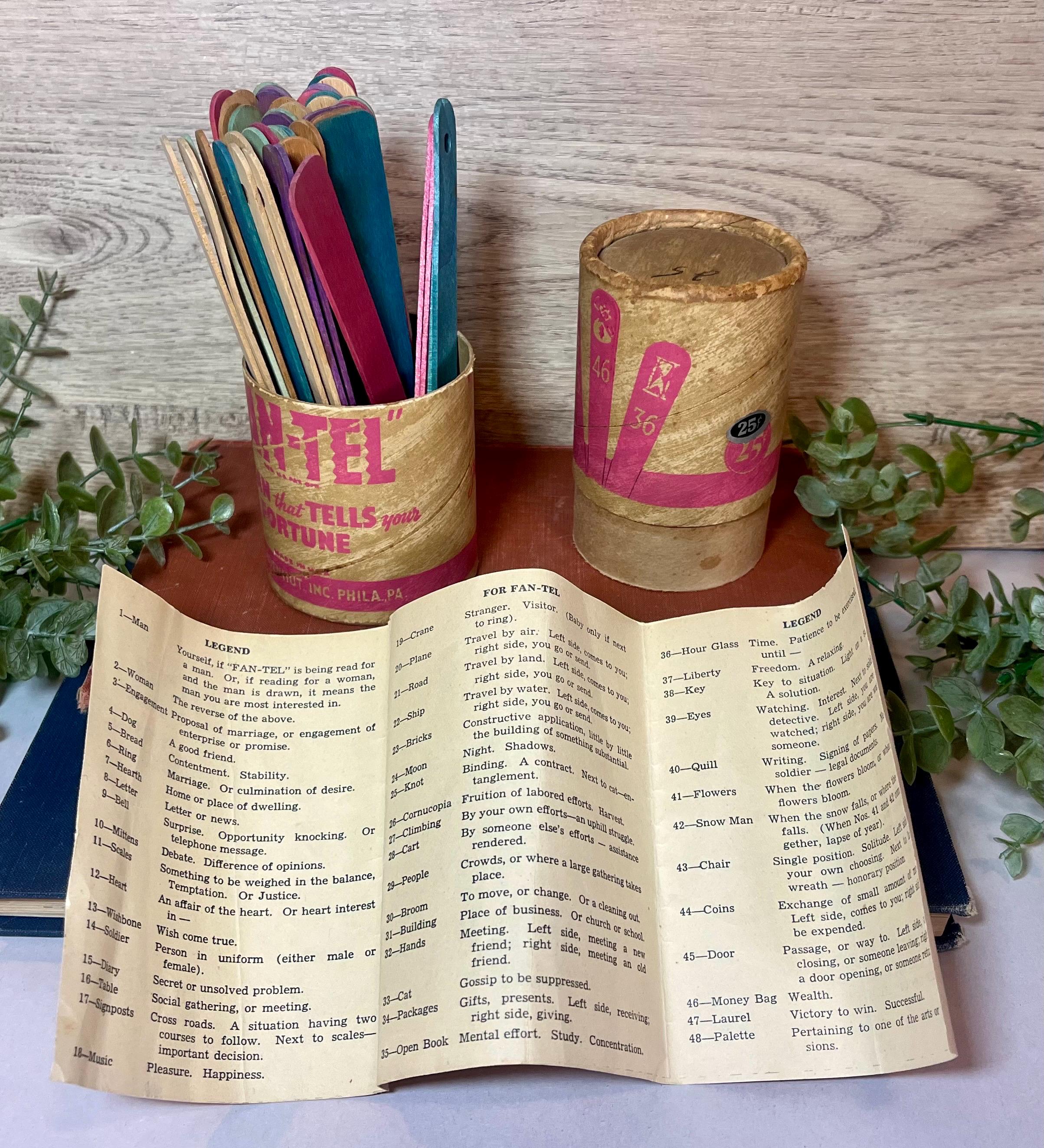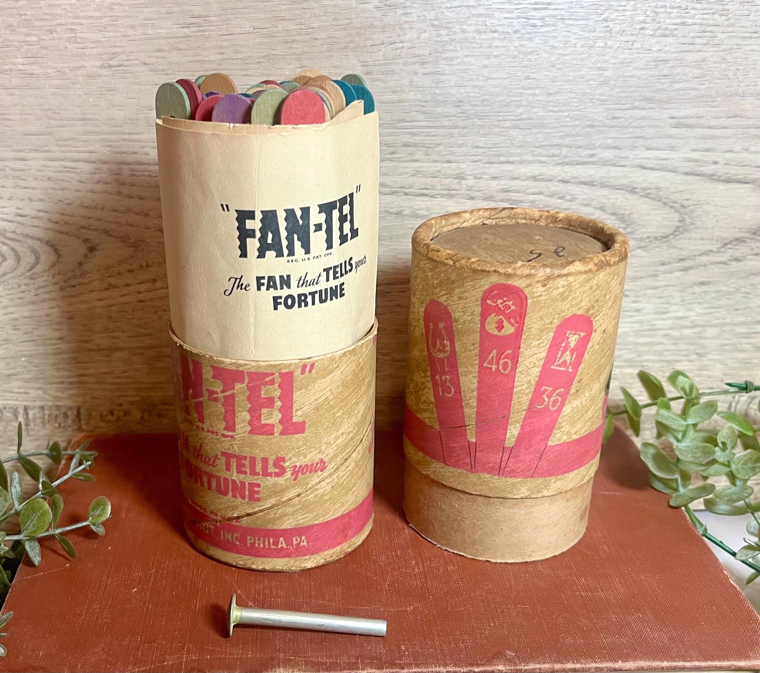 ✨ Details: • Authentic vintage Fan-Tel set (circa 1930s) • Includes: original cardboard tube, colorful numbered fortune sticks, metal rod, and printed instructions • Condition: Excellent vintage condition with light wear consistent with age • Tube graphics remain vivid, sticks are colorful and sturdy • Dimensions: Tube approx. 4.5” tall × 2.5” wide; sticks approx. 5.5” long