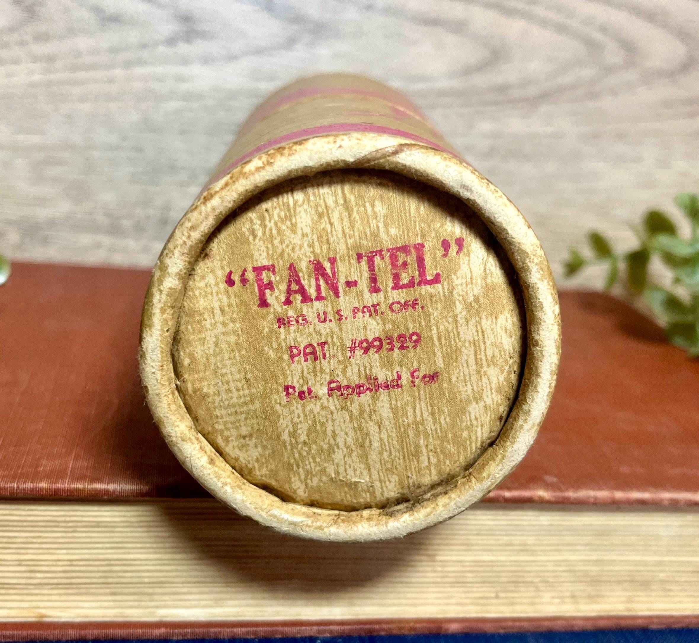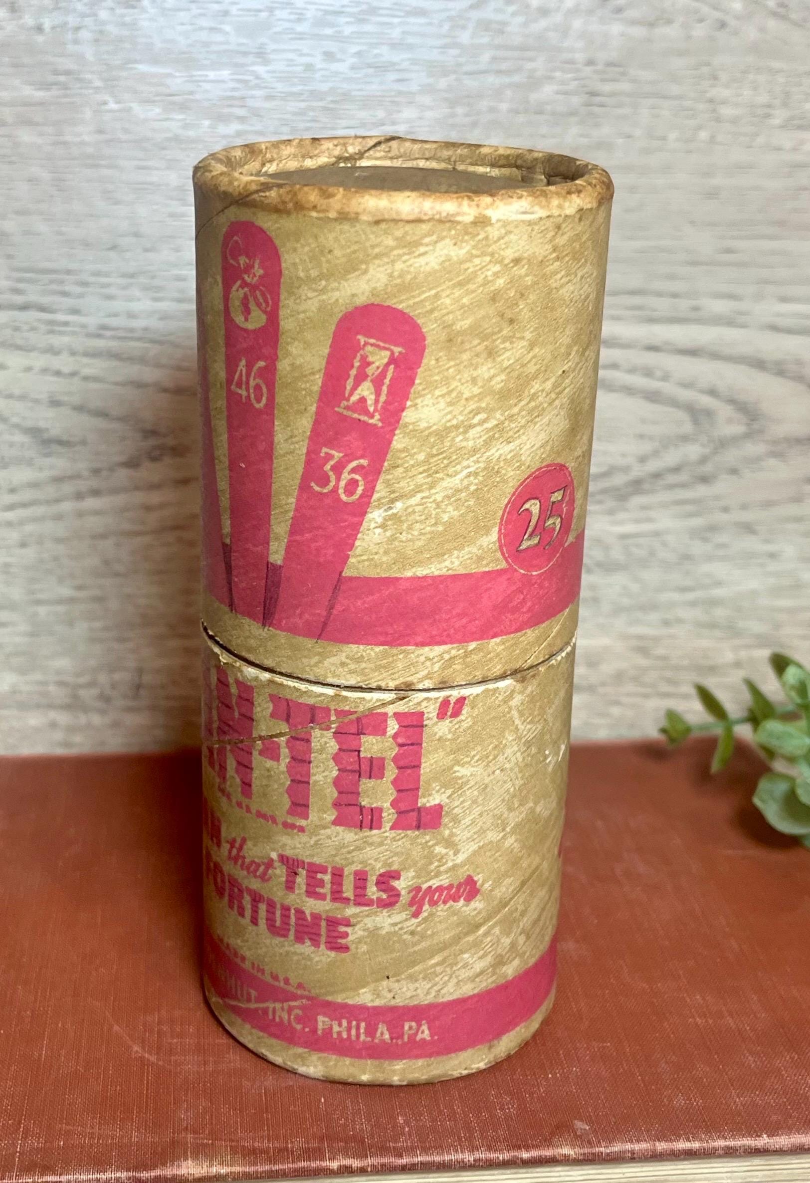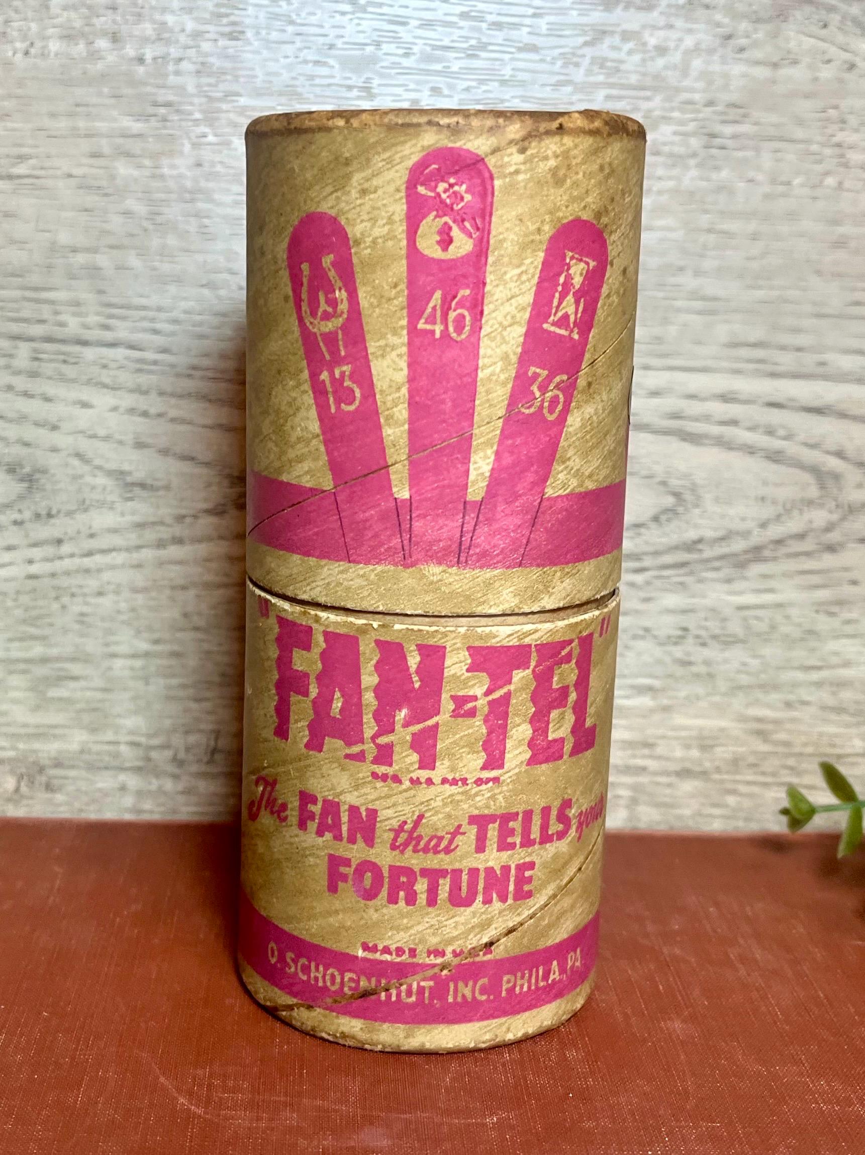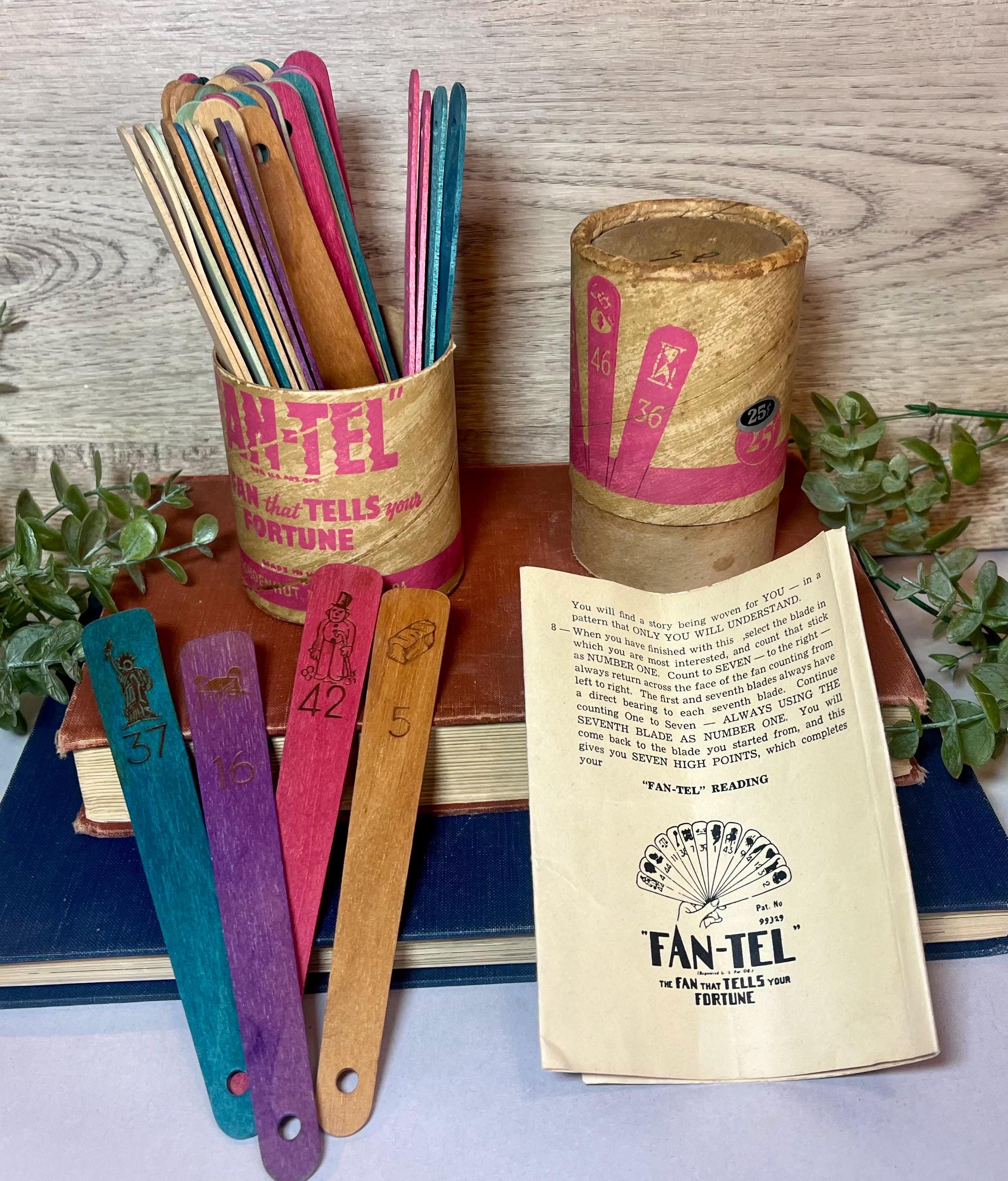 ✨ Details: • Authentic vintage Fan-Tel set (circa 1930s) • Includes: original cardboard tube, colorful numbered fortune sticks, metal rod, and printed instructions • Condition: Excellent vintage condition with light wear consistent with age • Tube graphics remain vivid, sticks are colorful and sturdy • Dimensions: Tube approx. 4.5” tall × 2.5” wide; sticks approx. 5.5” long