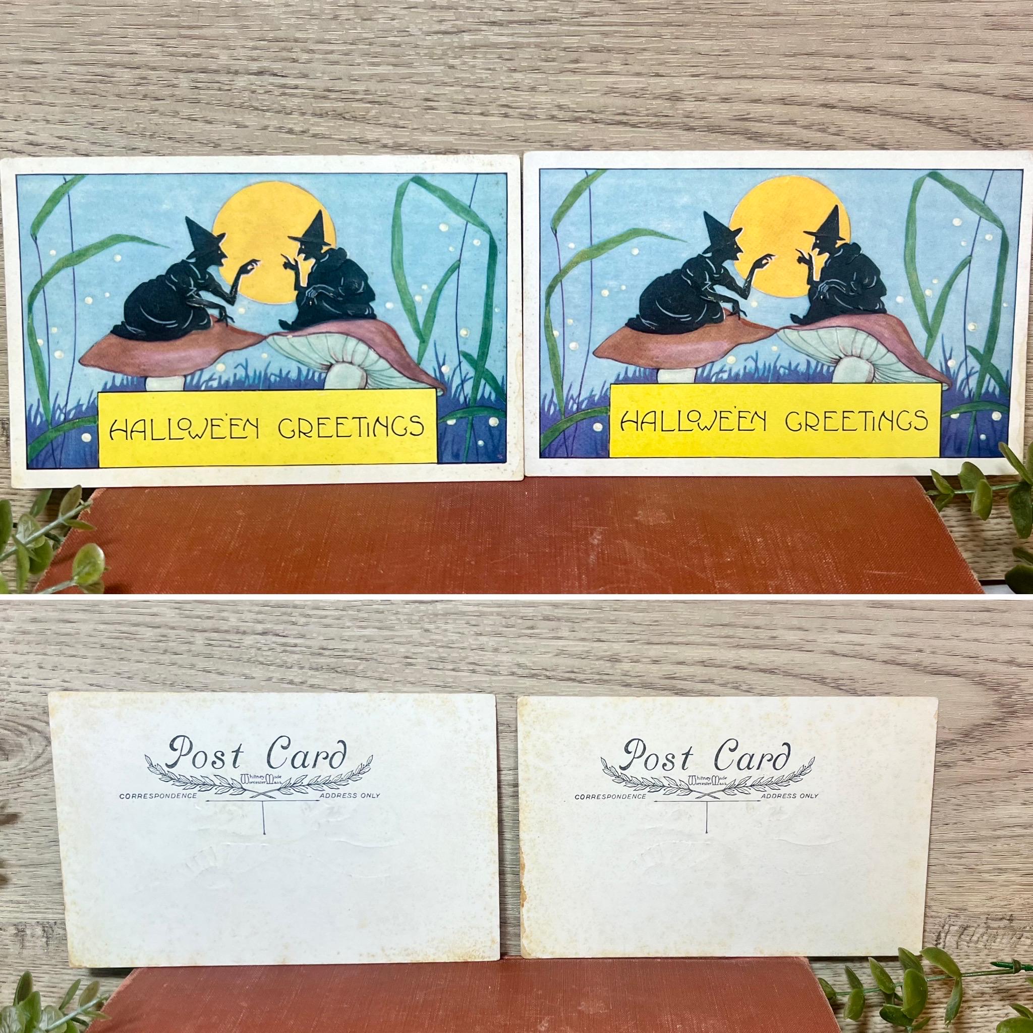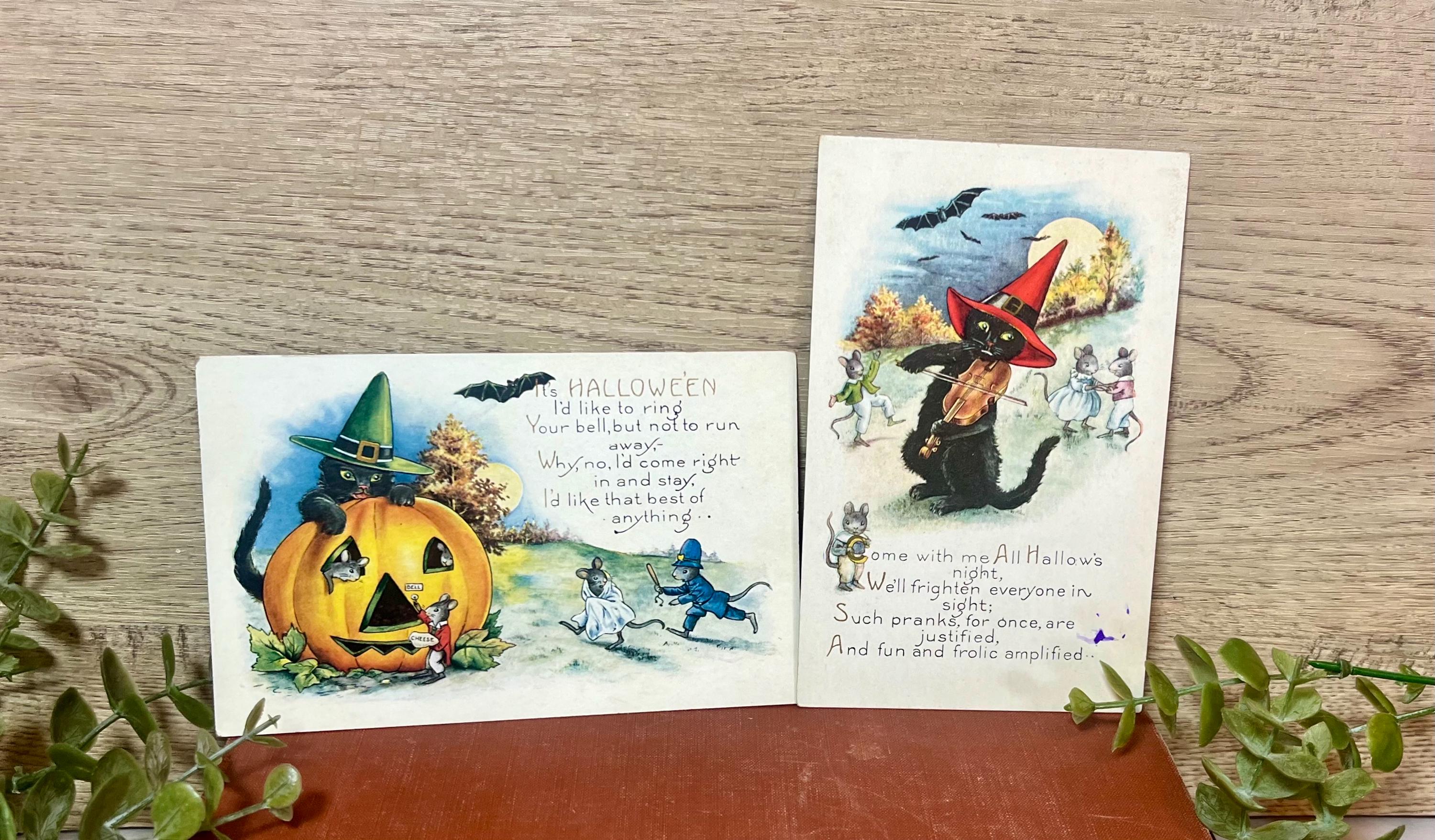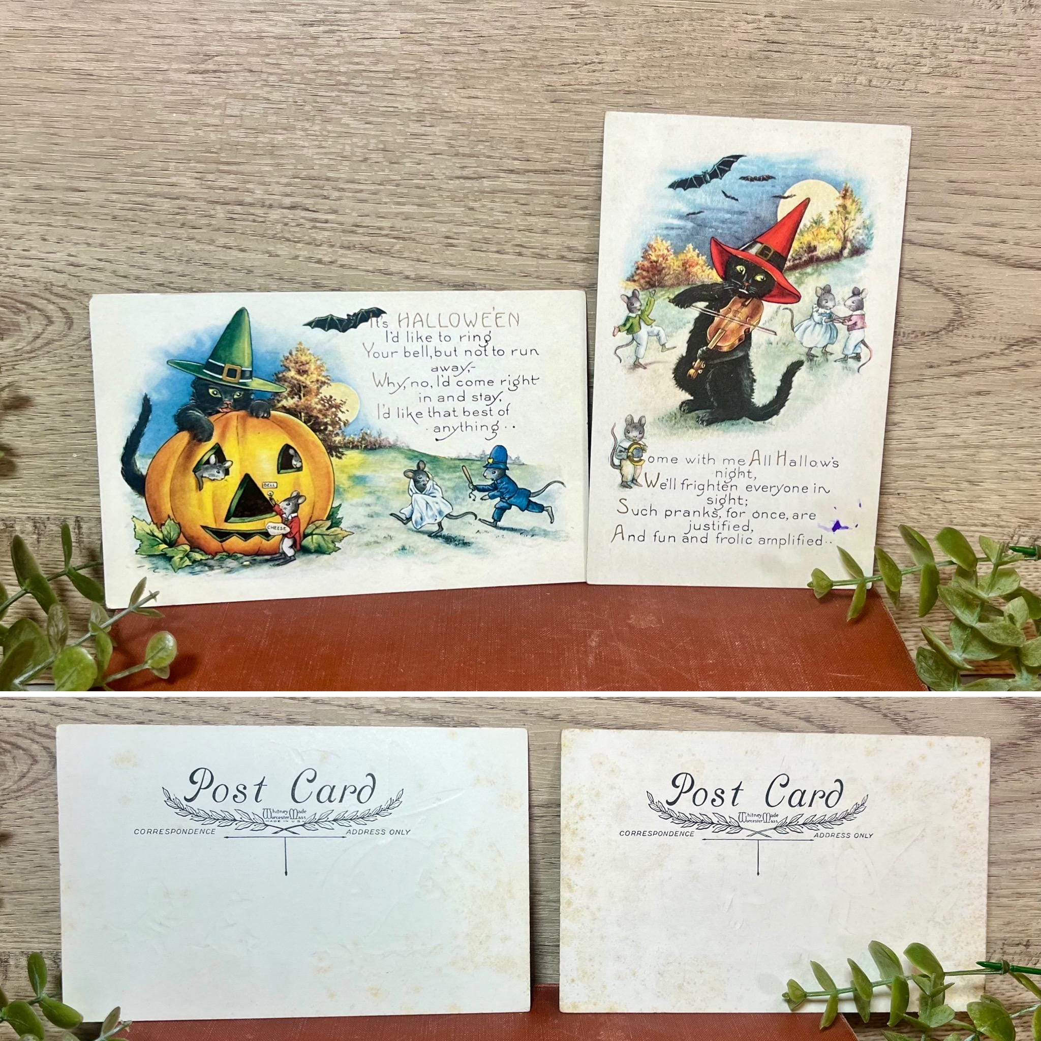 🎃 Available Sets (choose from dropdown at checkout): 1. Children with Candlelight (Set of 2) • Little girl with black cat and candle (“A Happy Halloween”) • Girl in blue cloak with candle and pumpkin, with rhyme (“Beware! Take care!”) 2. Black Cats & Mice (Set of 2) • Black cat in green witch hat peeking from jack-o’-lantern with mice • Black cat in red hat playing fiddle, mice dancing under full moon 3. Witches on Toadstools (Set of 2) • Two witches in silhouette under harvest moon, text “Halloween Greetings” (two available)