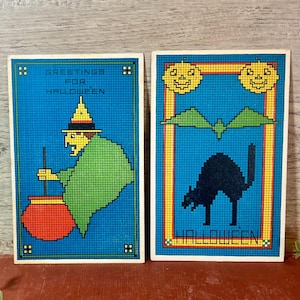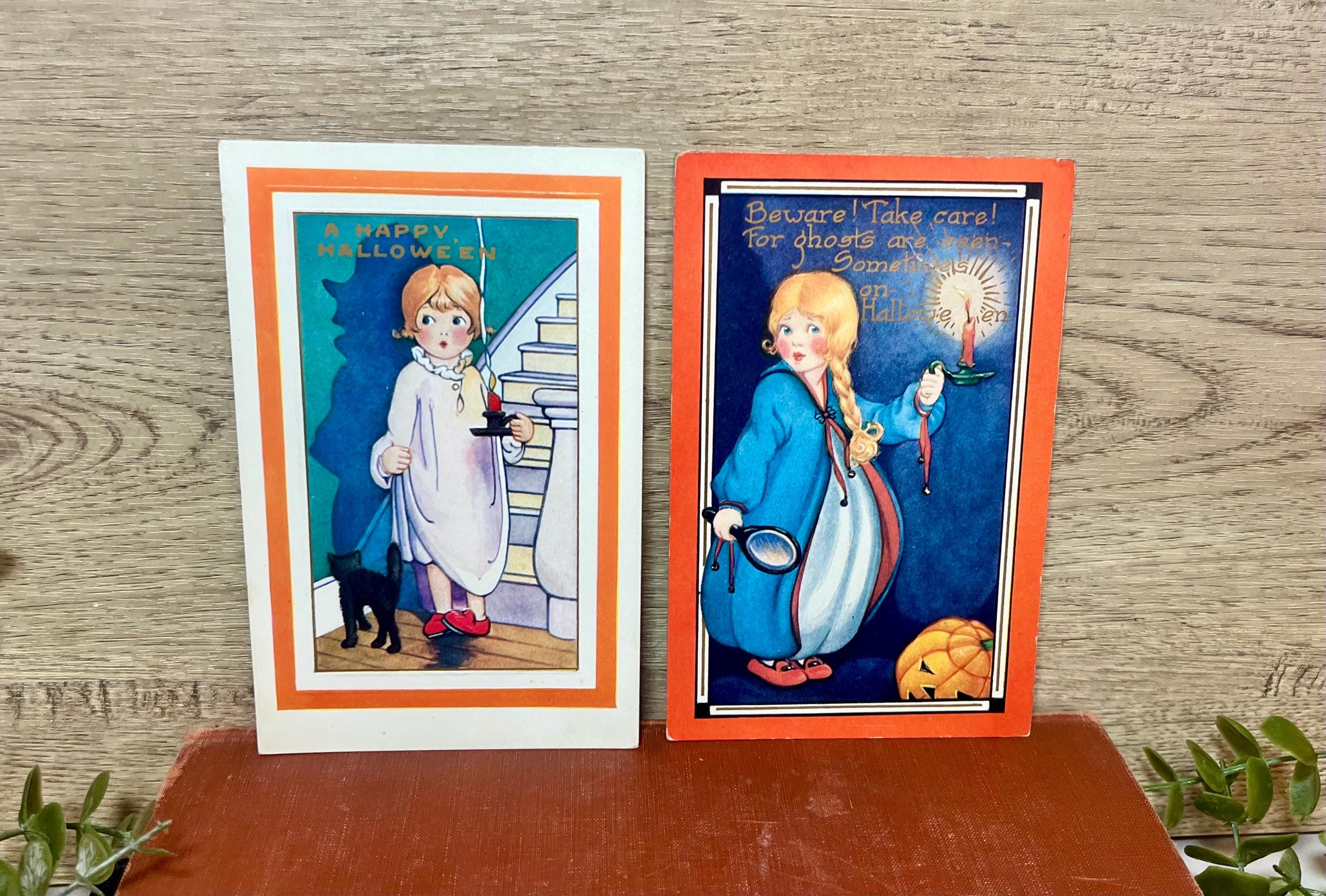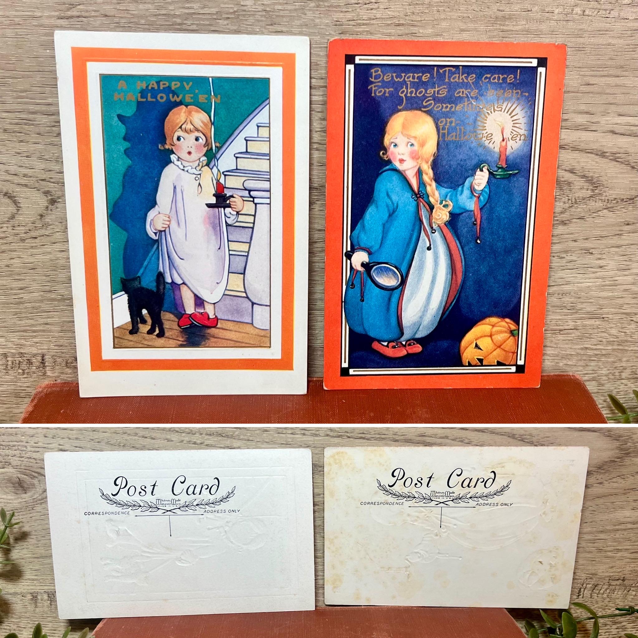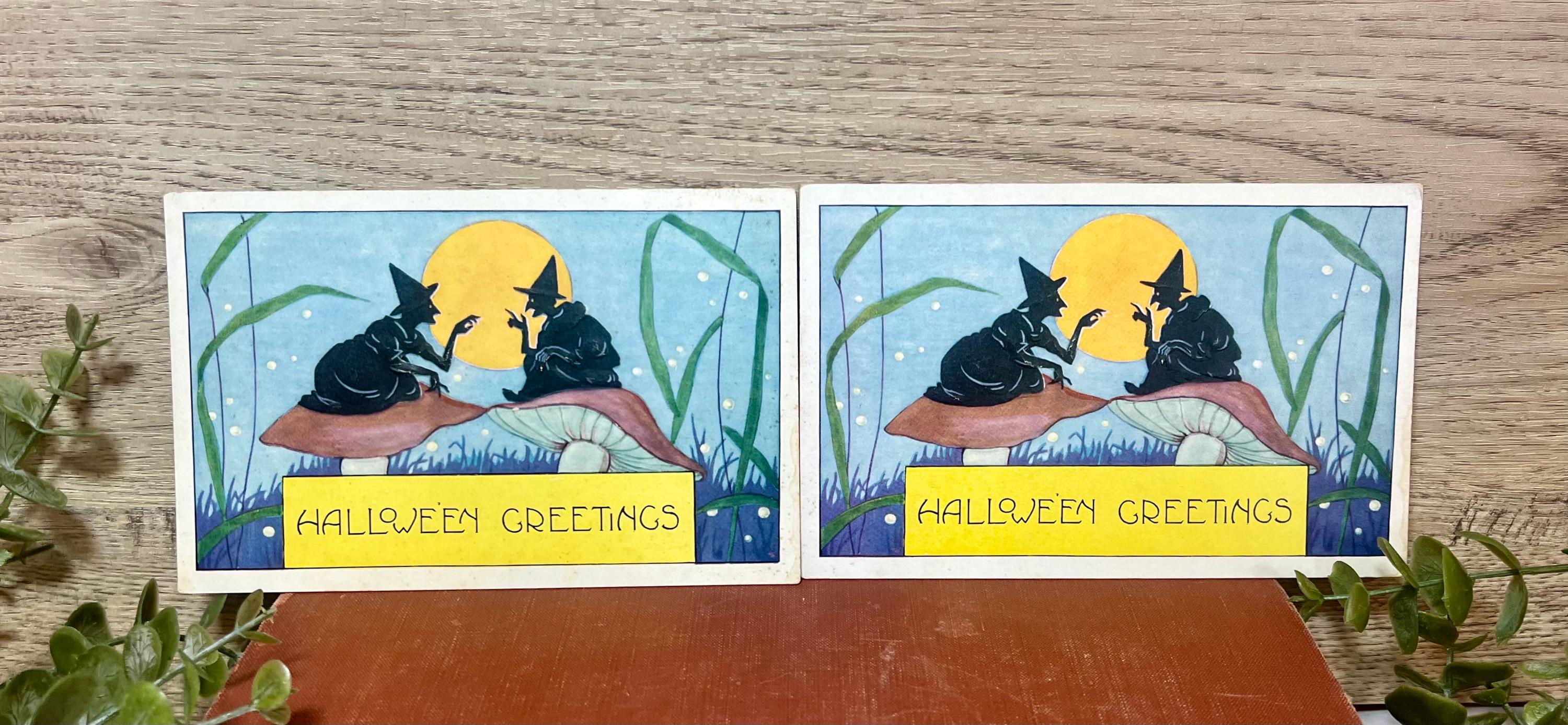 🎃 Available Sets (choose from dropdown at checkout): 1. Children with Candlelight (Set of 2) • Little girl with black cat and candle (“A Happy Halloween”) • Girl in blue cloak with candle and pumpkin, with rhyme (“Beware! Take care!”) 2. Black Cats & Mice (Set of 2) • Black cat in green witch hat peeking from jack-o’-lantern with mice • Black cat in red hat playing fiddle, mice dancing under full moon 3. Witches on Toadstools (Set of 2) • Two witches in silhouette under harvest moon, text “Halloween Greetings” (two available)