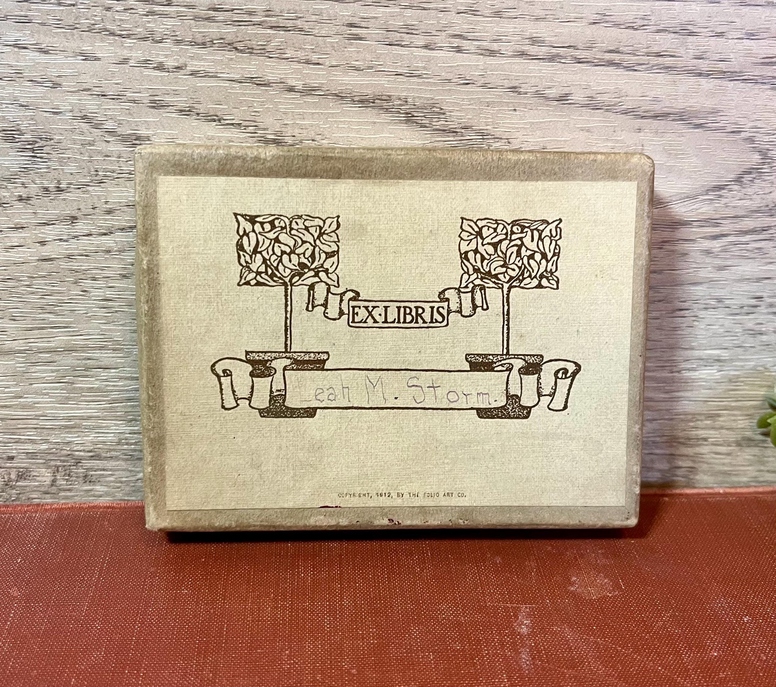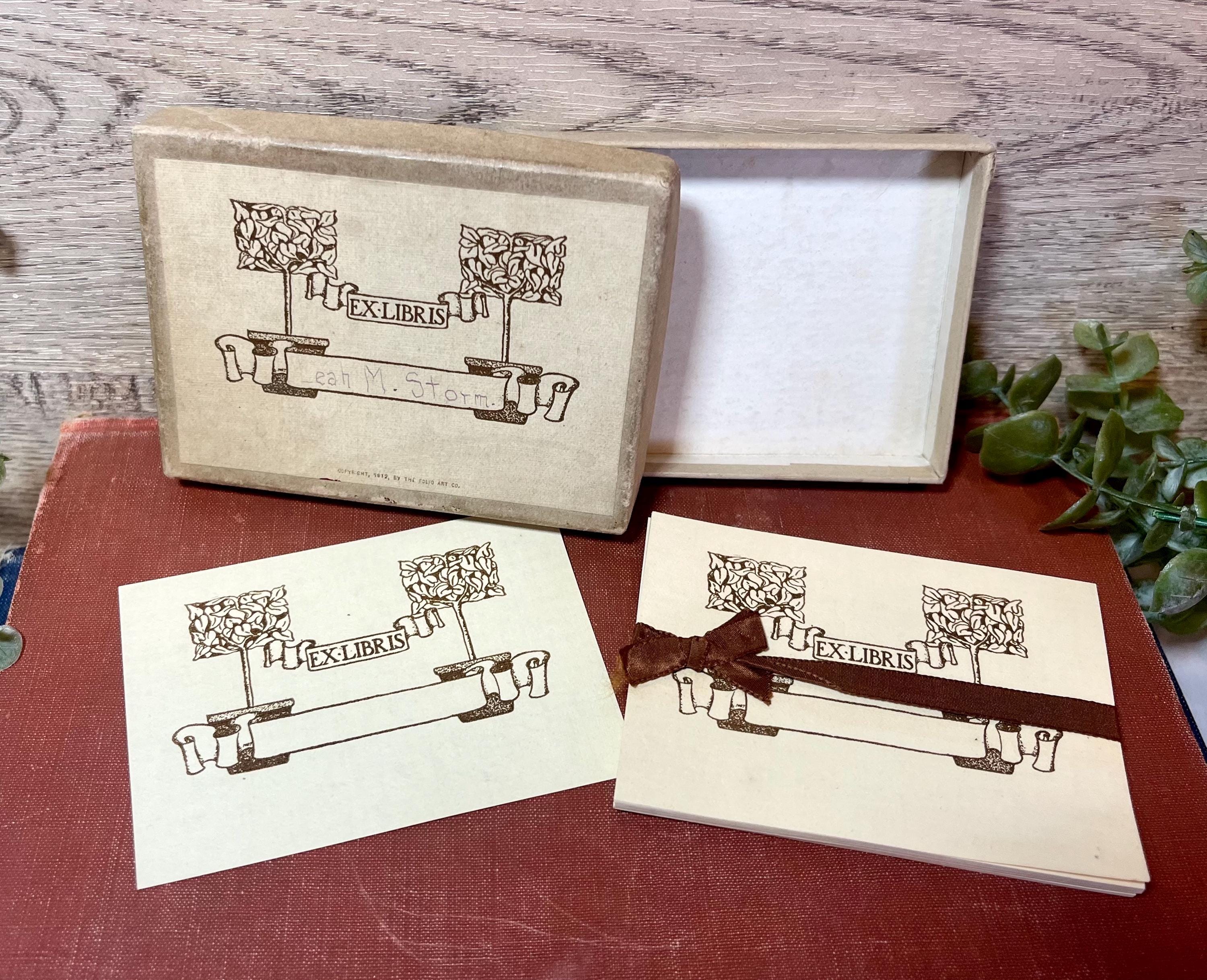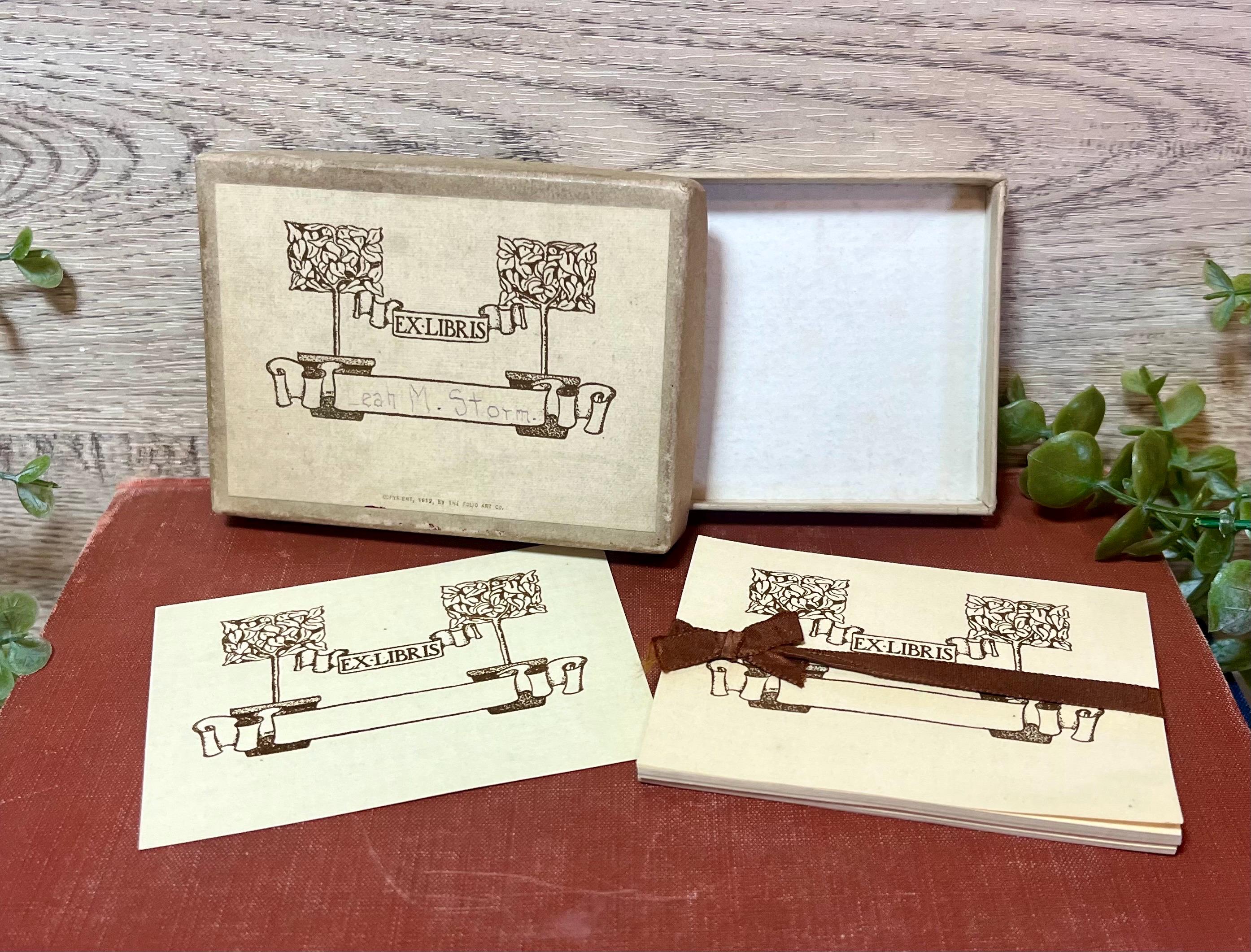 Step back into the charm of early 20th-century reading culture with this beautiful vintage set of “Ex Libris” bookplates. Each label features an elegant Arts and Crafts–style design printed in rich brown ink, complete in its original box from The Fine Arts Co.. A rare collectible for bibliophiles and stationery lovers alike, these classic bookplates embody timeless craftsmanship and literary elegance.