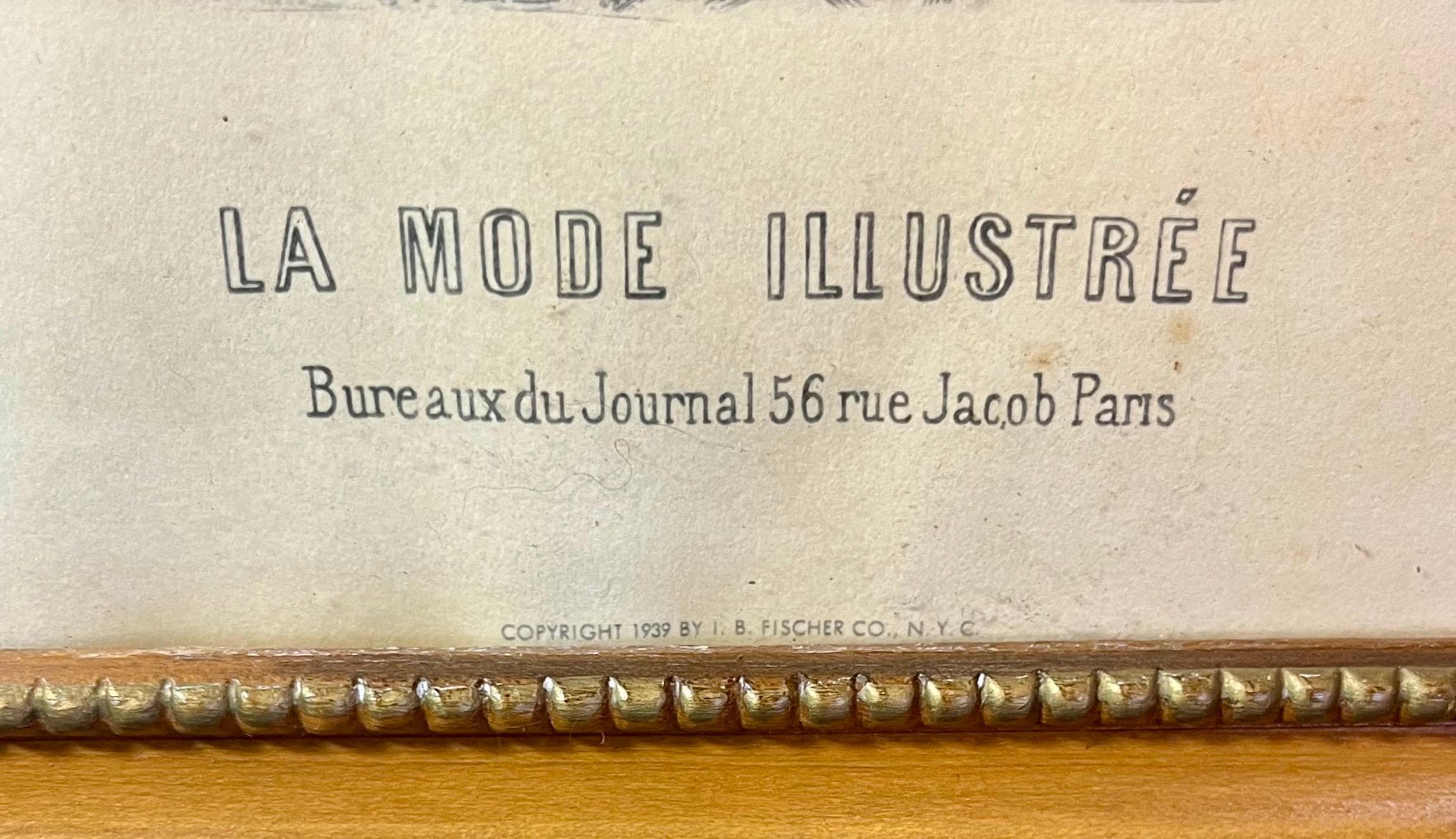 📜 Details • Title: La Mode Illustrée • Origin: Paris, France • Text on print: “La Mode Illustrée – Bureaux du Journal, 56 rue Jacob, Paris” • Style: Victorian fashion plate • Era: 1930s (original illustration published mid-to-late 1800s) • Frame: Mid-century wooden frame with scalloped edges and gold beaded inner border • Frame size: Approx. 14” x 10.5” • Condition: Excellent vintage condition. Print shows light age toning consistent with age; frame is sturdy with minimal wear.