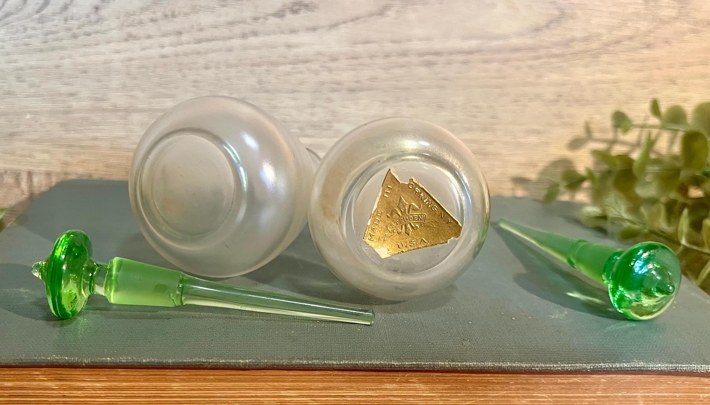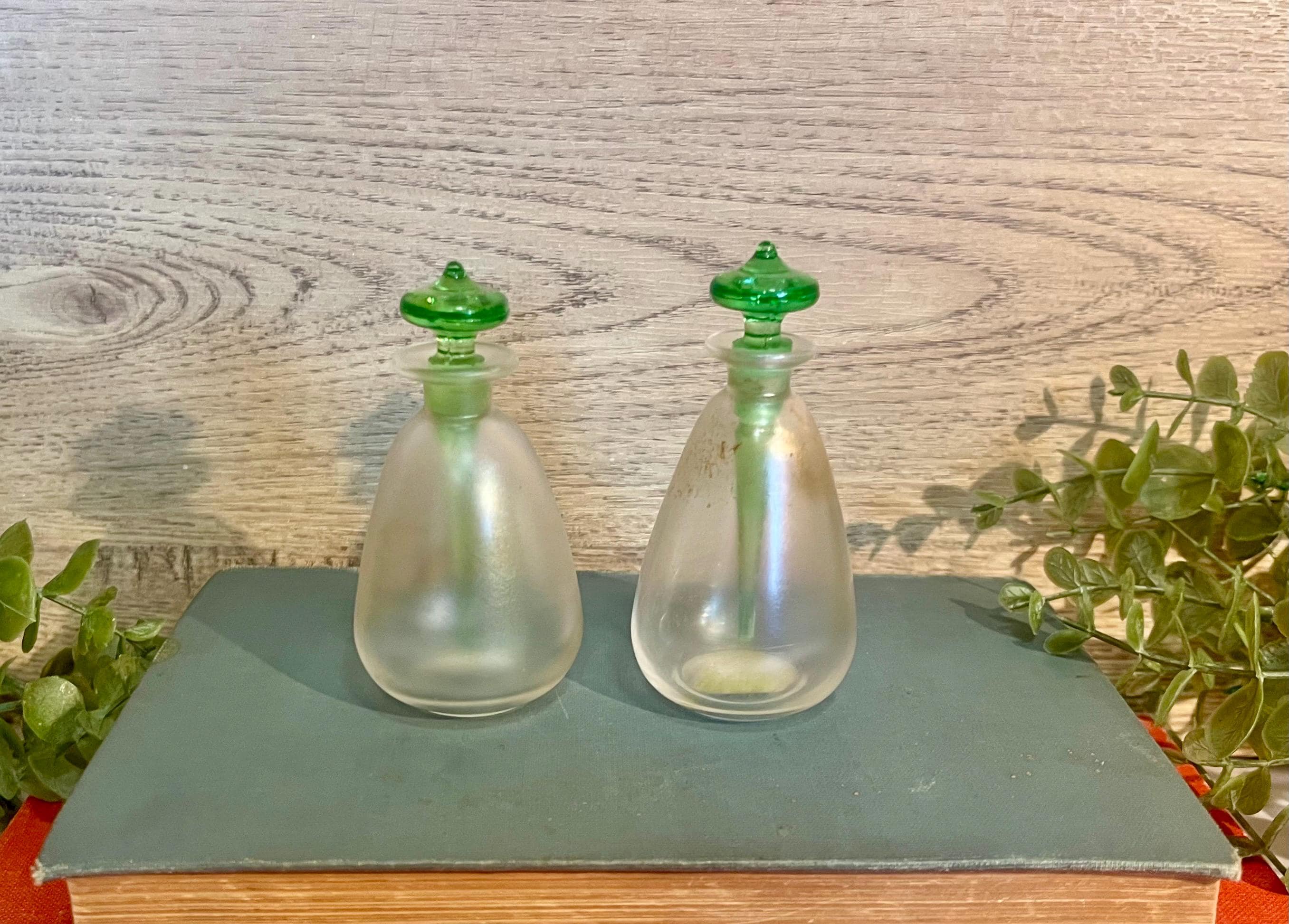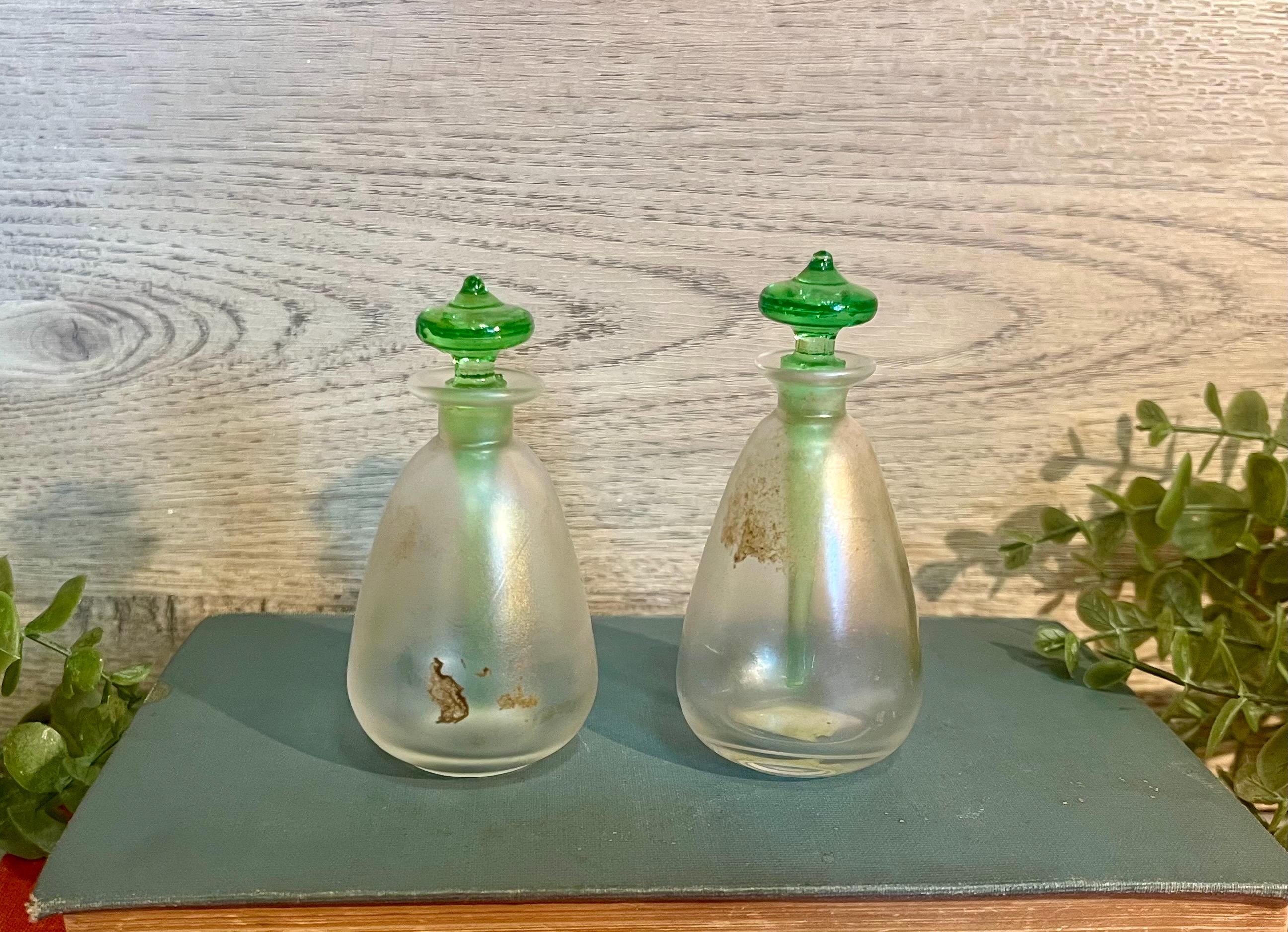 🩵 Details: • Authentic Steuben Verre de Soie, c. 1910–1930 • Iridescent frosted glass with green glass stoppers • Approx. 3.5” tall × 1.5” wide • Excellent vintage condition
