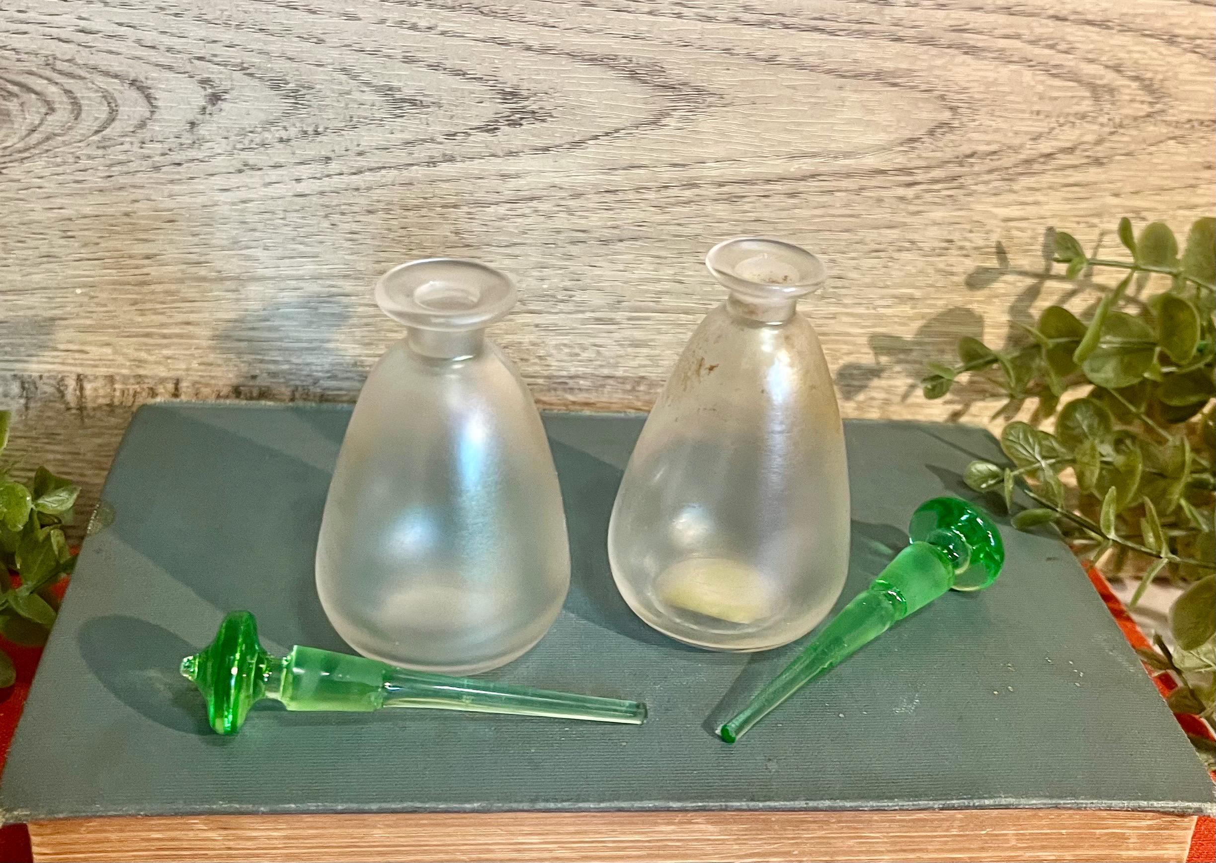 Elegant and timeless, this matching pair with slight differences makes a stunning addition to any art glass collection, vintage vanity display, or antique décor.