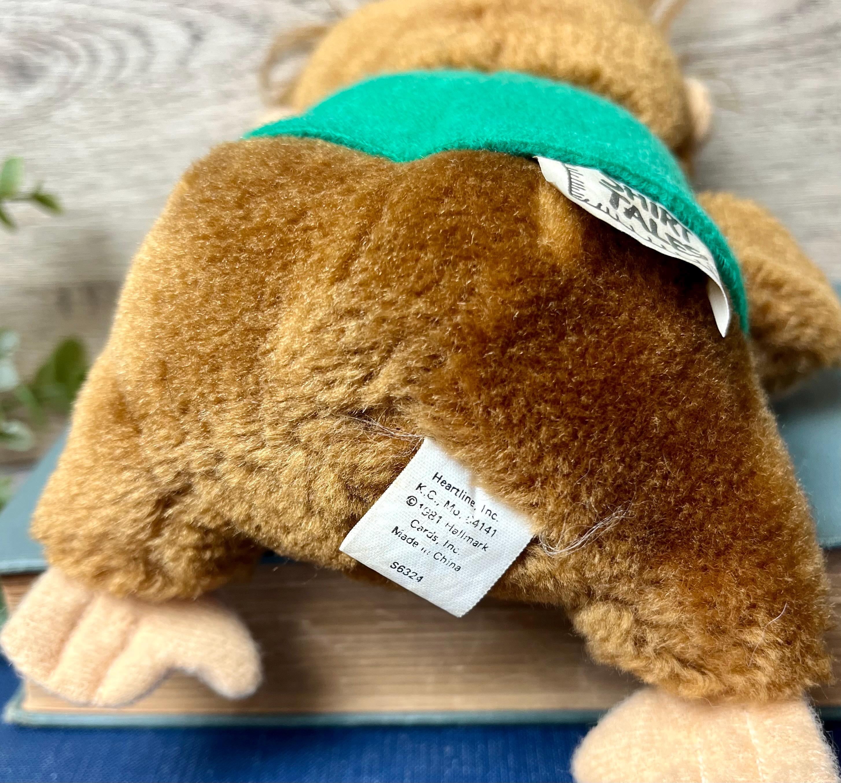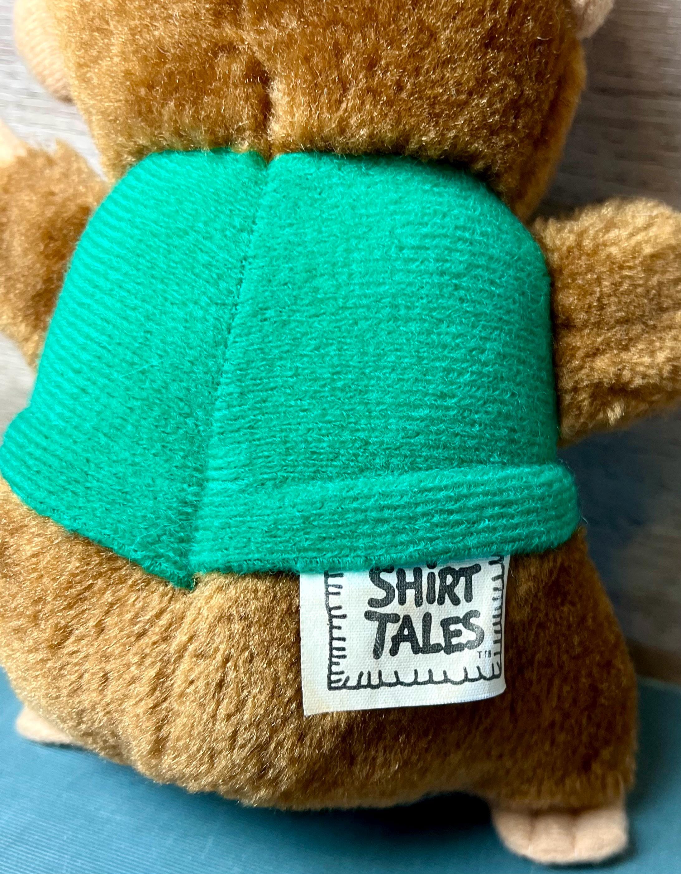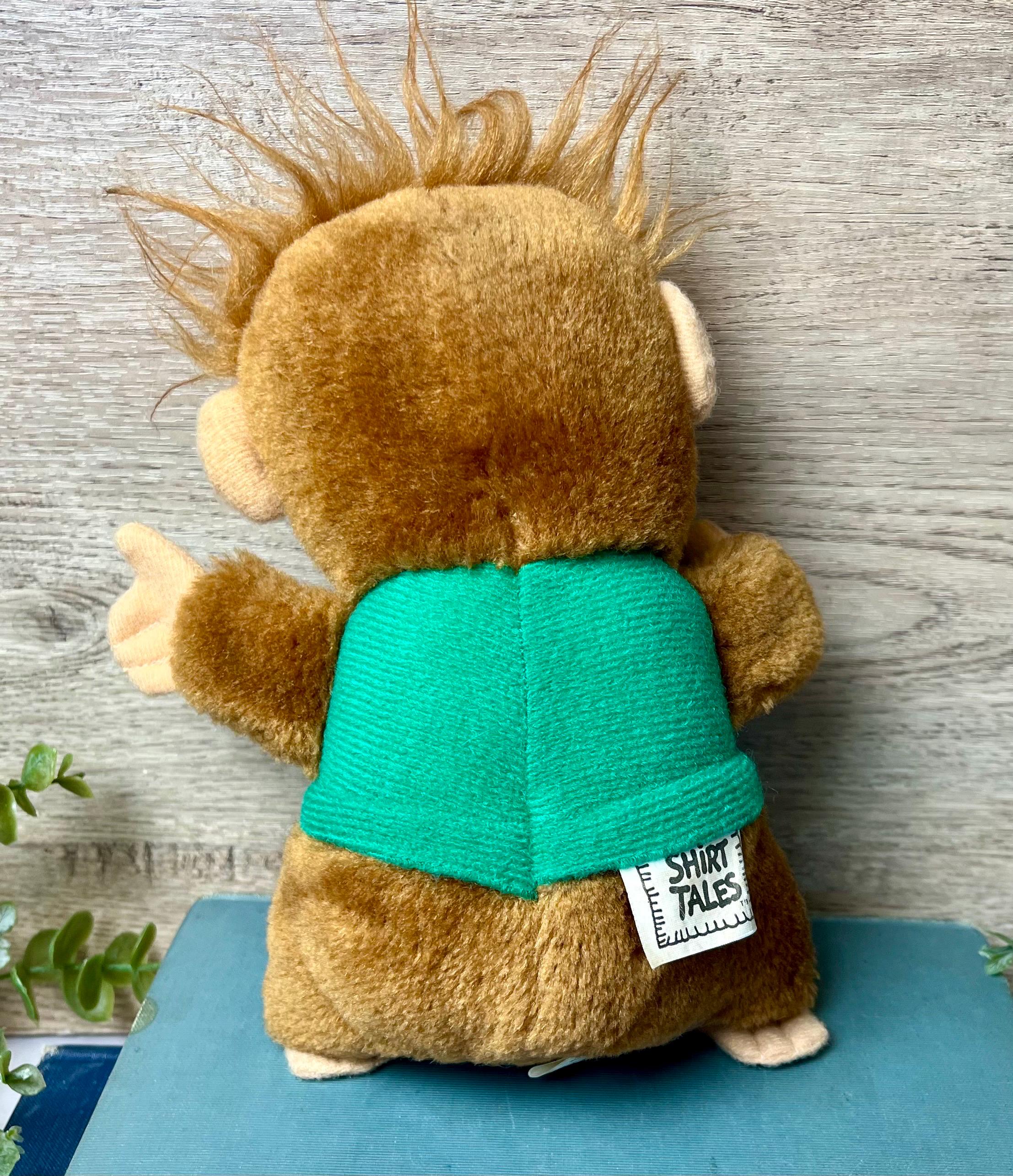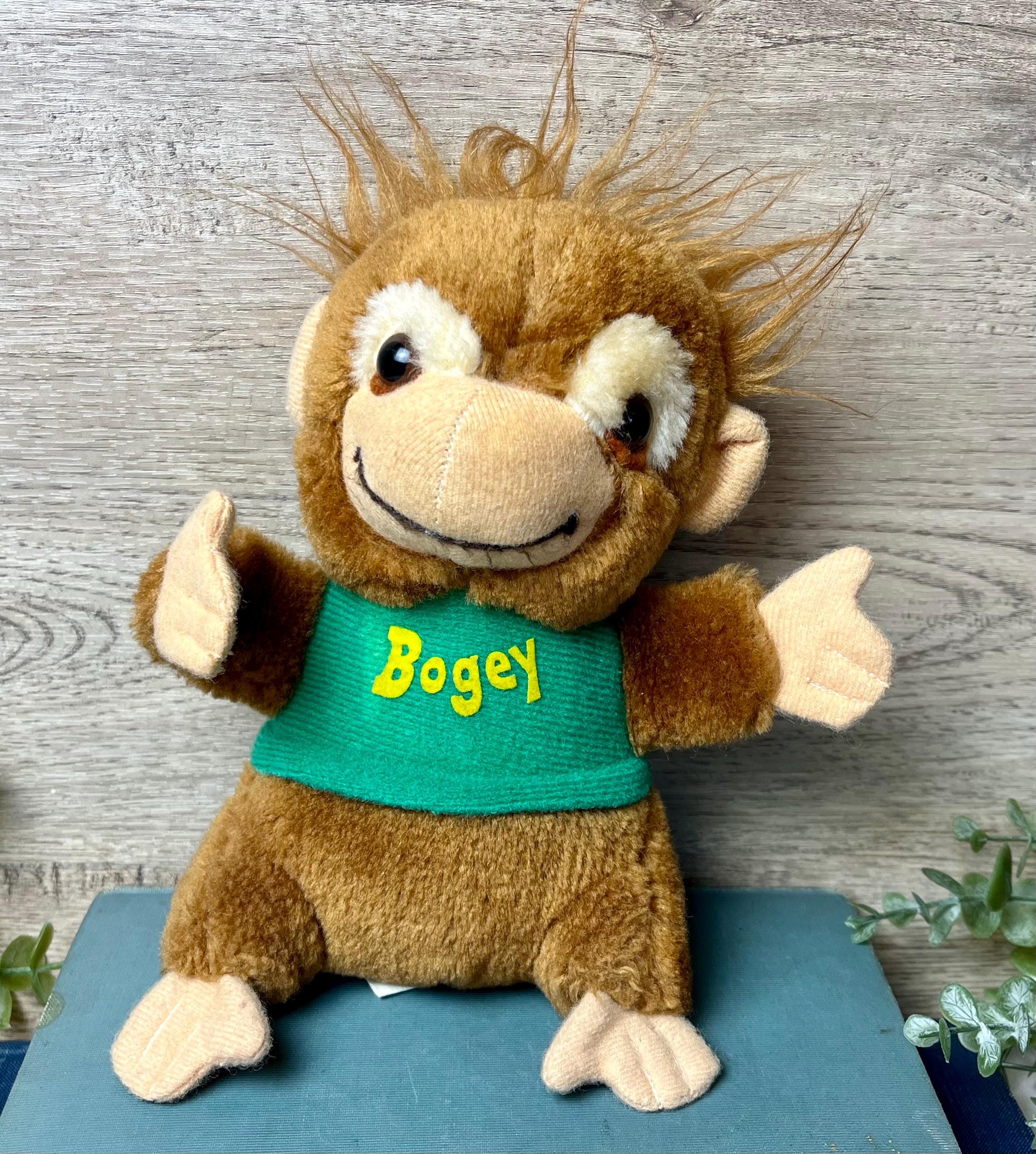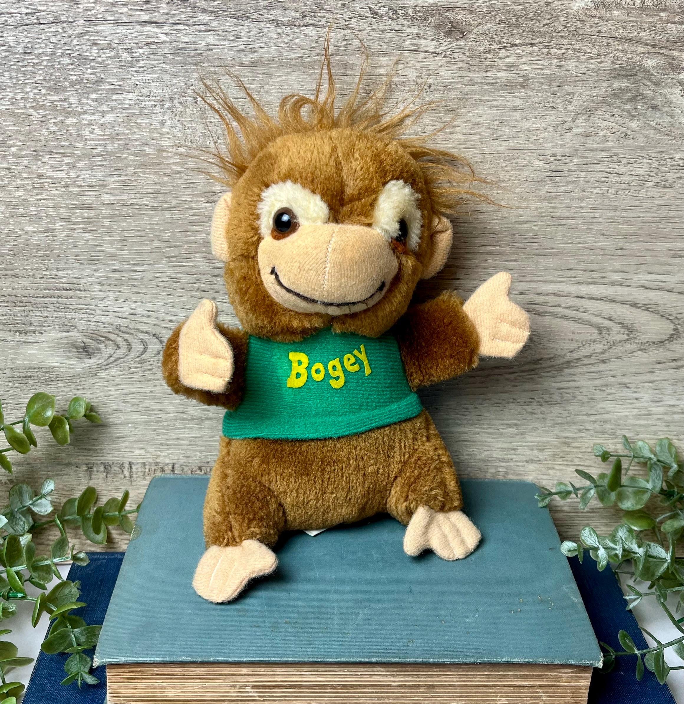 Add a touch of nostalgic fun to your home or collection with this vintage “Bogey” monkey Shirt Tales plush stuffed animal. With its soft brown fur, cream-colored hands and feet, and cheerful green shirt embroidered with “Bogey,” this cuddly character perfectly captures 80s–90s retro charm.