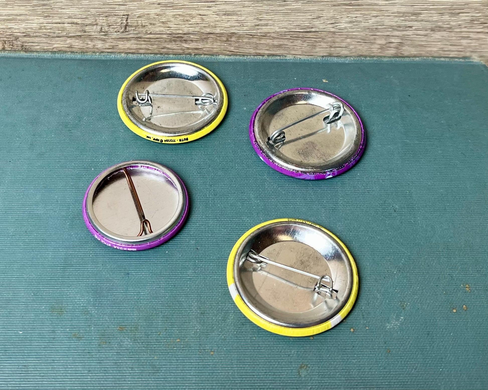 🪡 Era: 1990s 📏 Sizes: Range from approx. 1.25 in to 2.25 in diameter 🧥 Material: Metal button pins with printed designs 🌀 Condition: Vintage, overall good condition with light wear consistent with age