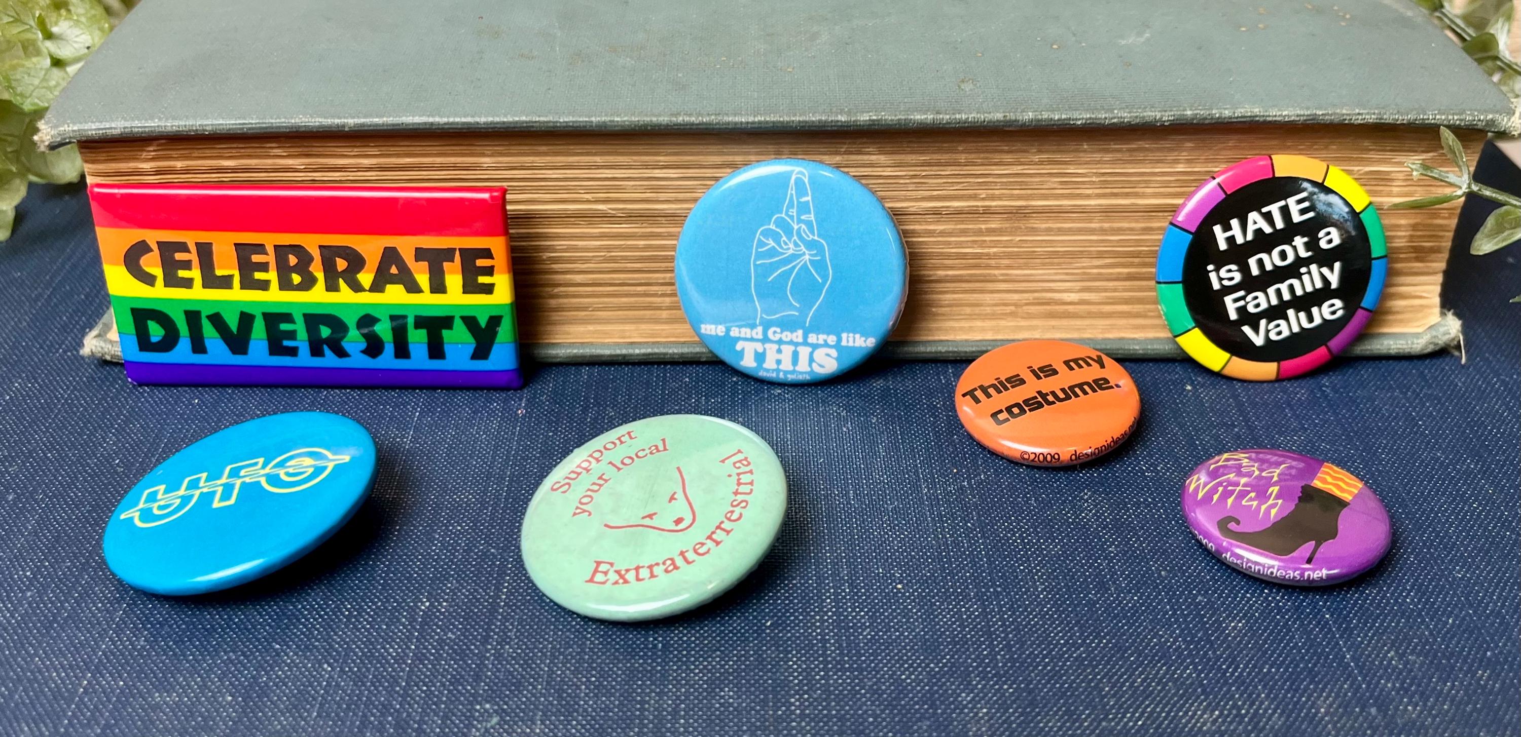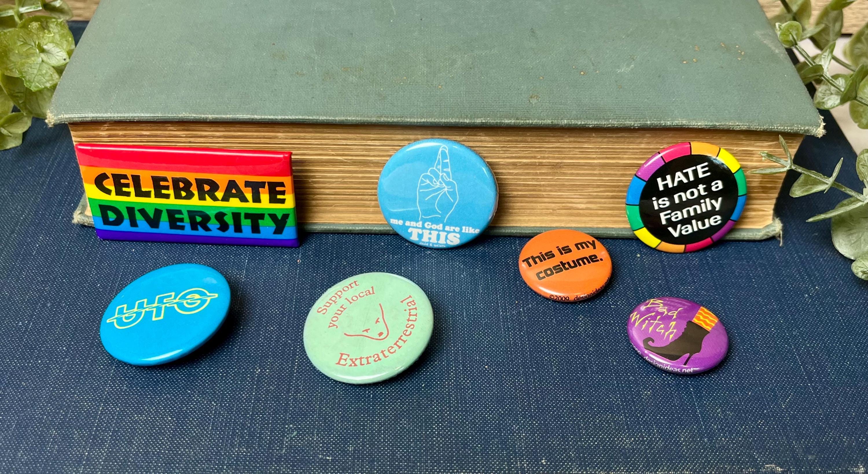 The set features a mix of bold graphics and quirky messages, including: • “Celebrate Diversity” (rainbow pride design) • “Me and God are like THIS” (light blue with hand illustration) • “HATE is not a Family Value” (rainbow border on black background) • “UFO” (bright blue with yellow text) • “Support your local Extraterrestrial” (mint green) • “This is my costume.” (orange) • “Bad Witch” (purple with witch’s hat and boots illustration)