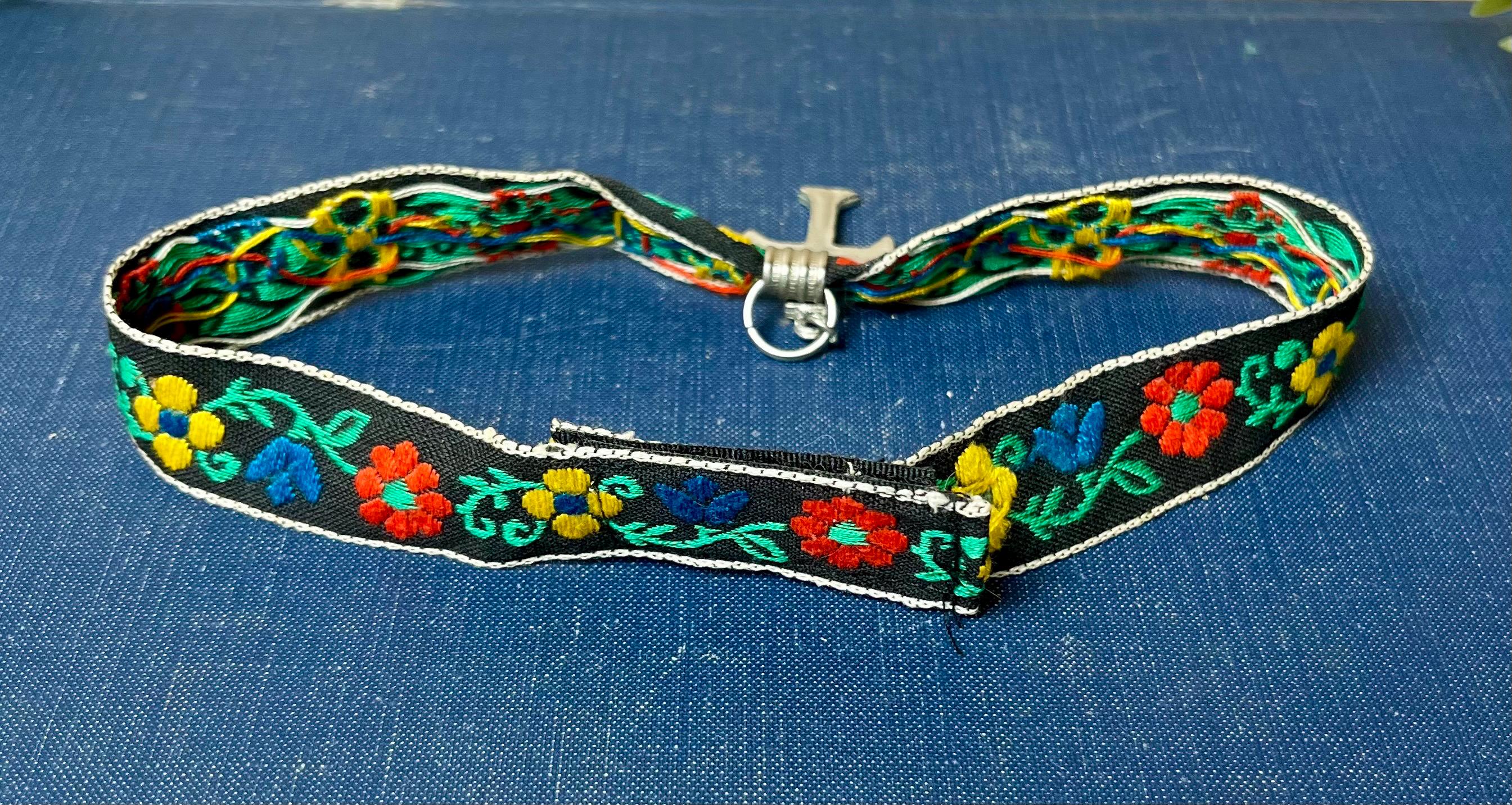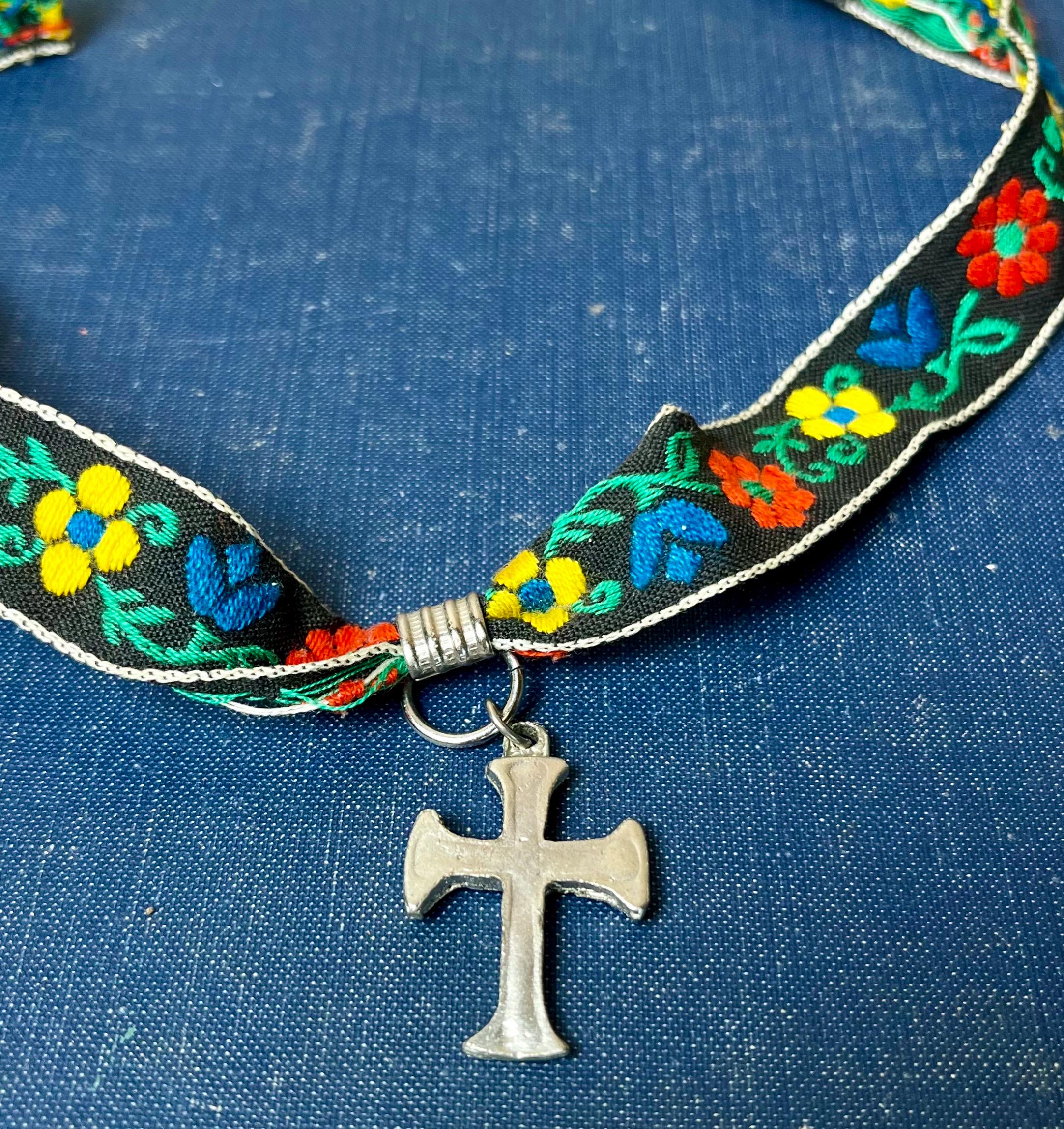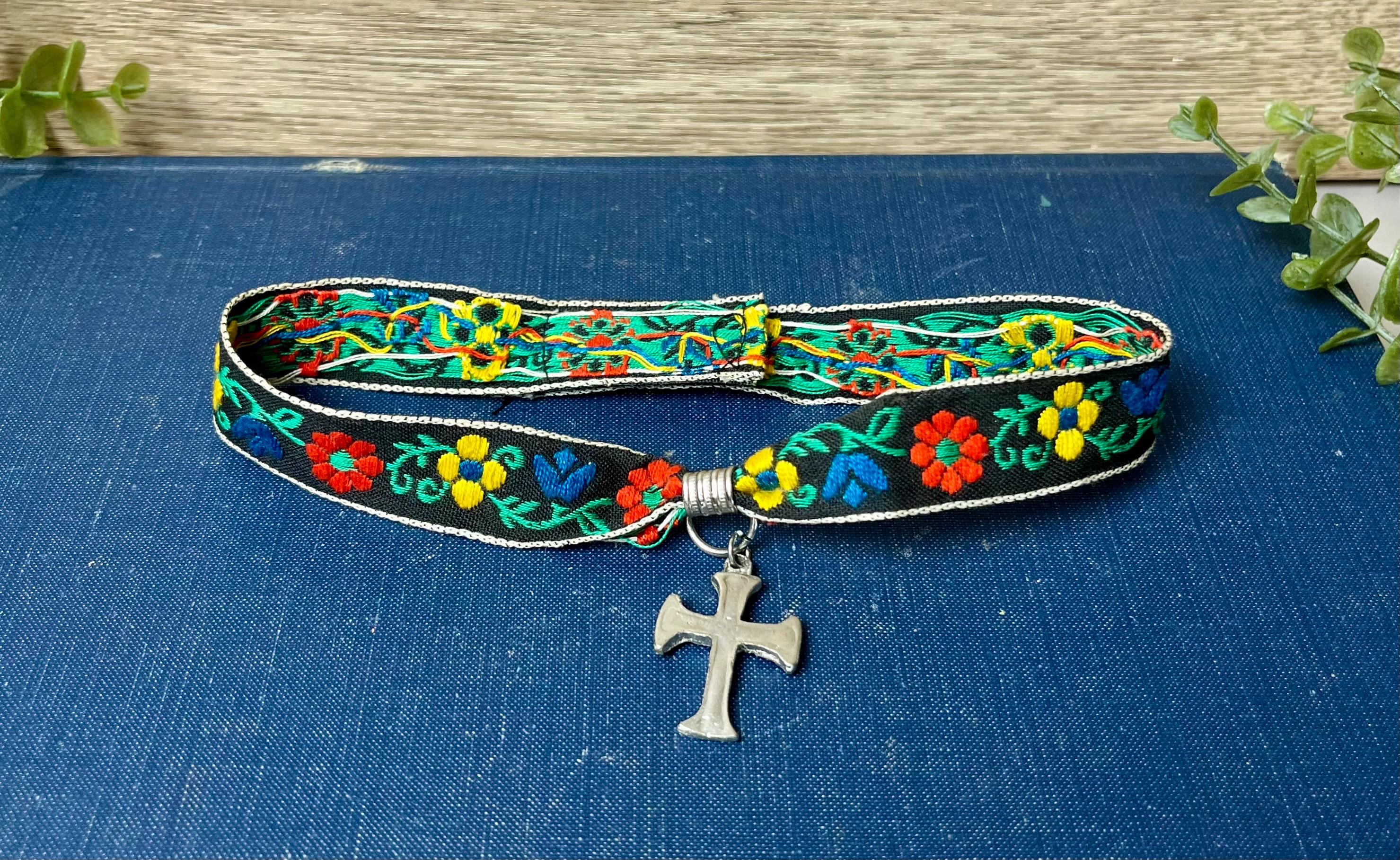 Step back into the 1990s with this authentic vintage choker necklace, featuring a colorful floral embroidered ribbon and a silver-tone cross pendant. The black ribbon is beautifully decorated with vibrant red, yellow, blue, and green stitching, giving it a bold yet soft boho-grunge aesthetic.