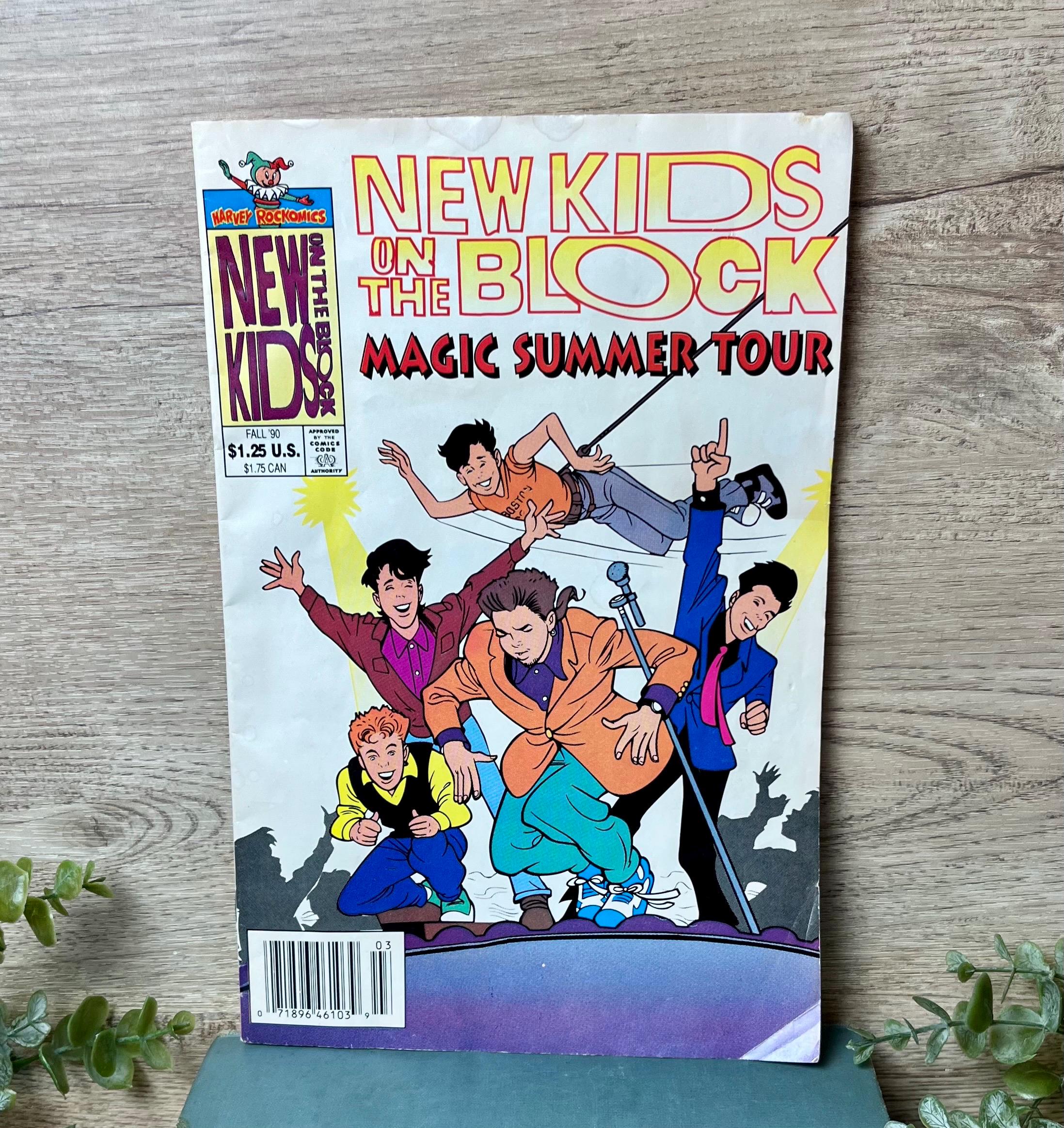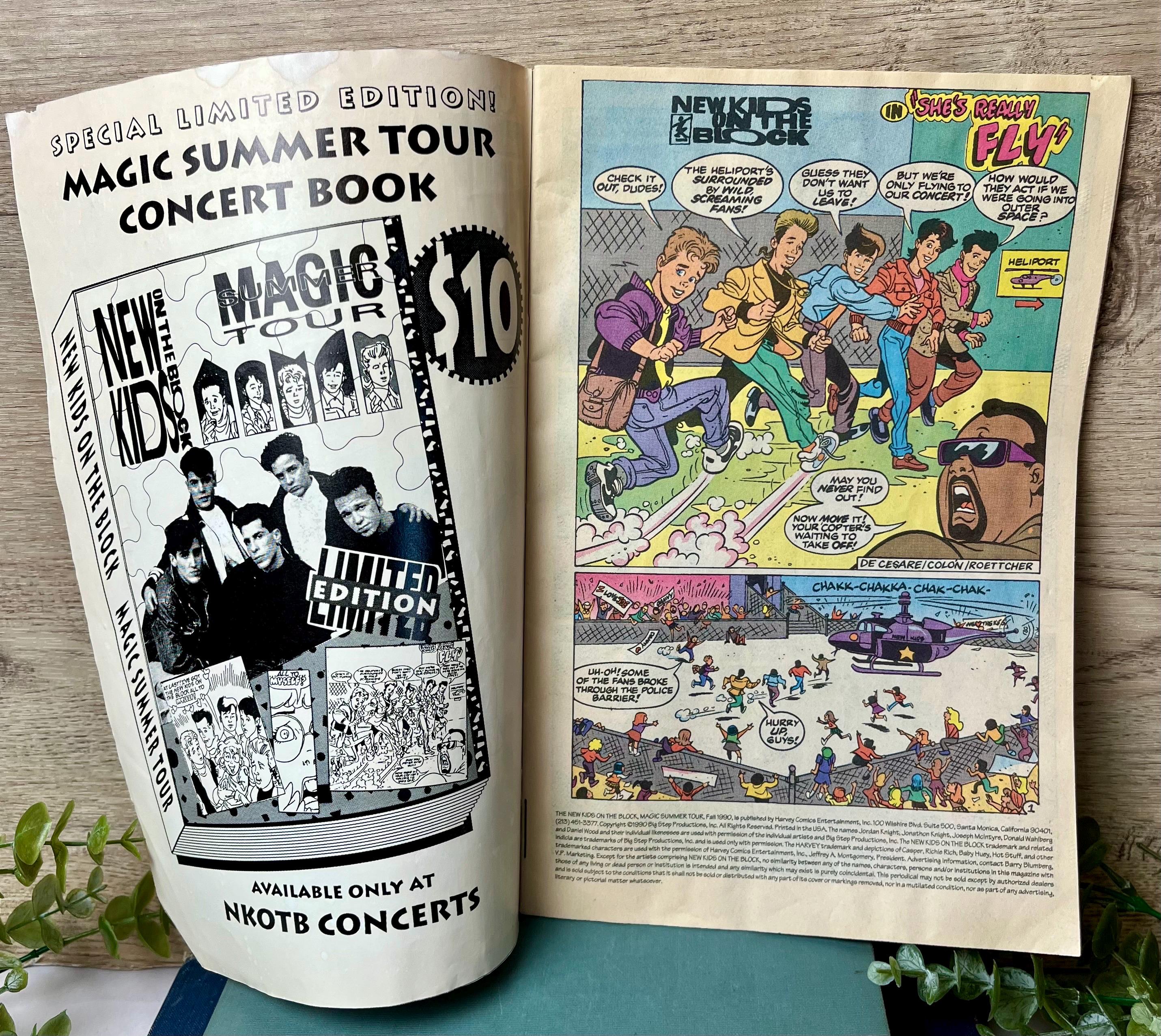 Relive the peak of late 80s and early 90s pop culture with this original New Kids on the Block comic book from their Magic Summer Tour era! Published by Harvey Comics, this fun collectible features animated versions of the band members and is a must-have for NKOTB fans and vintage comic collectors alike.