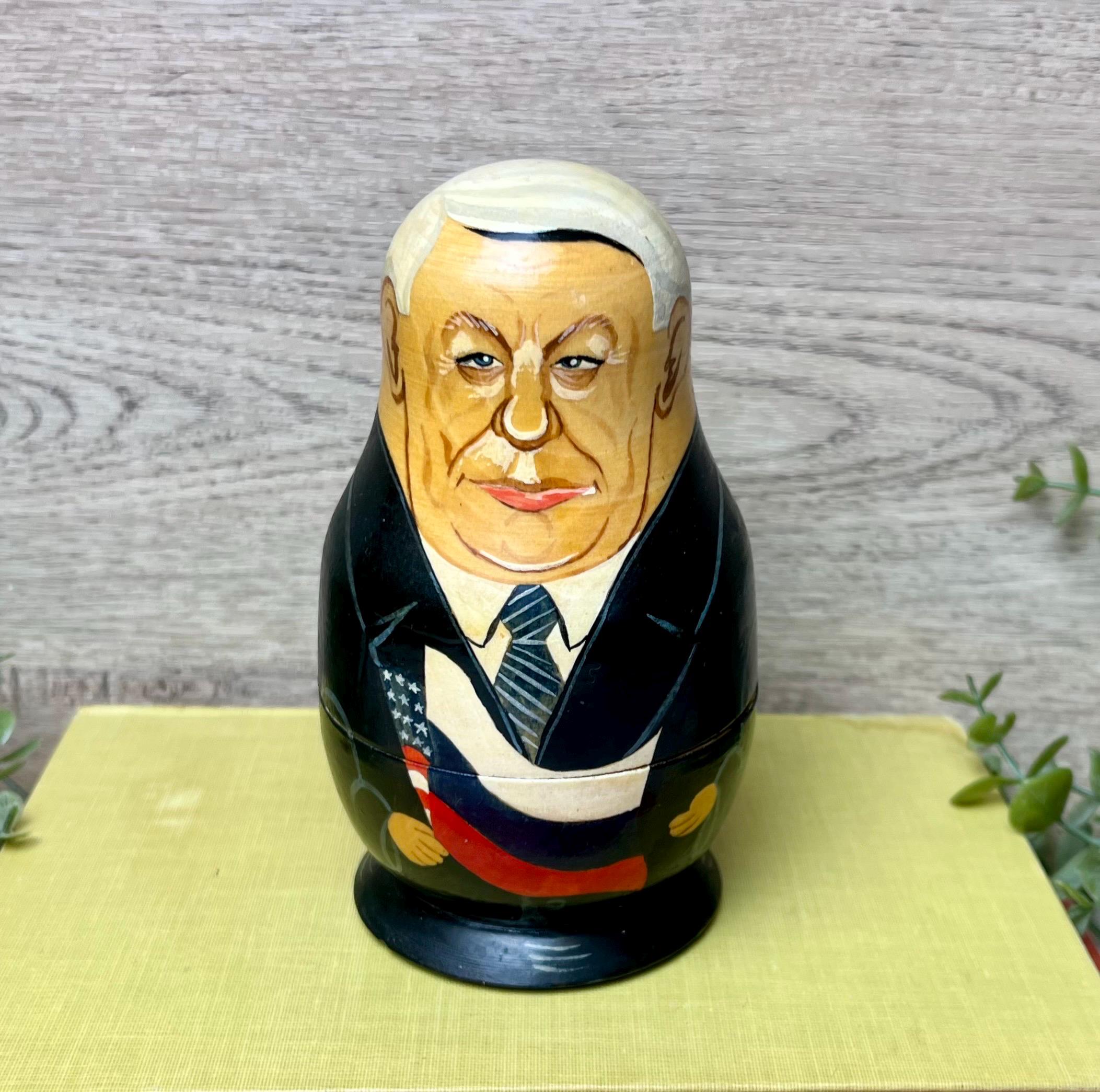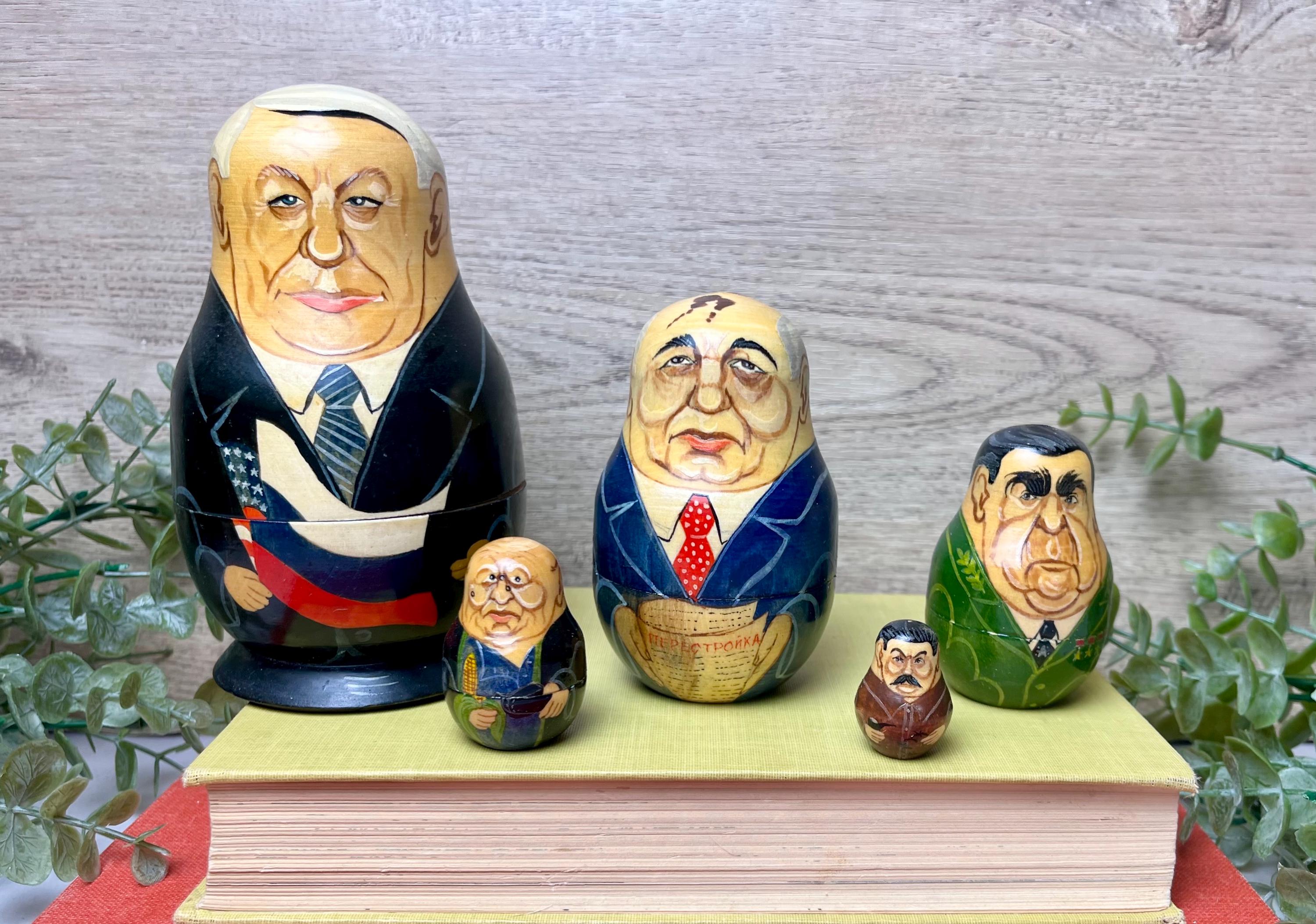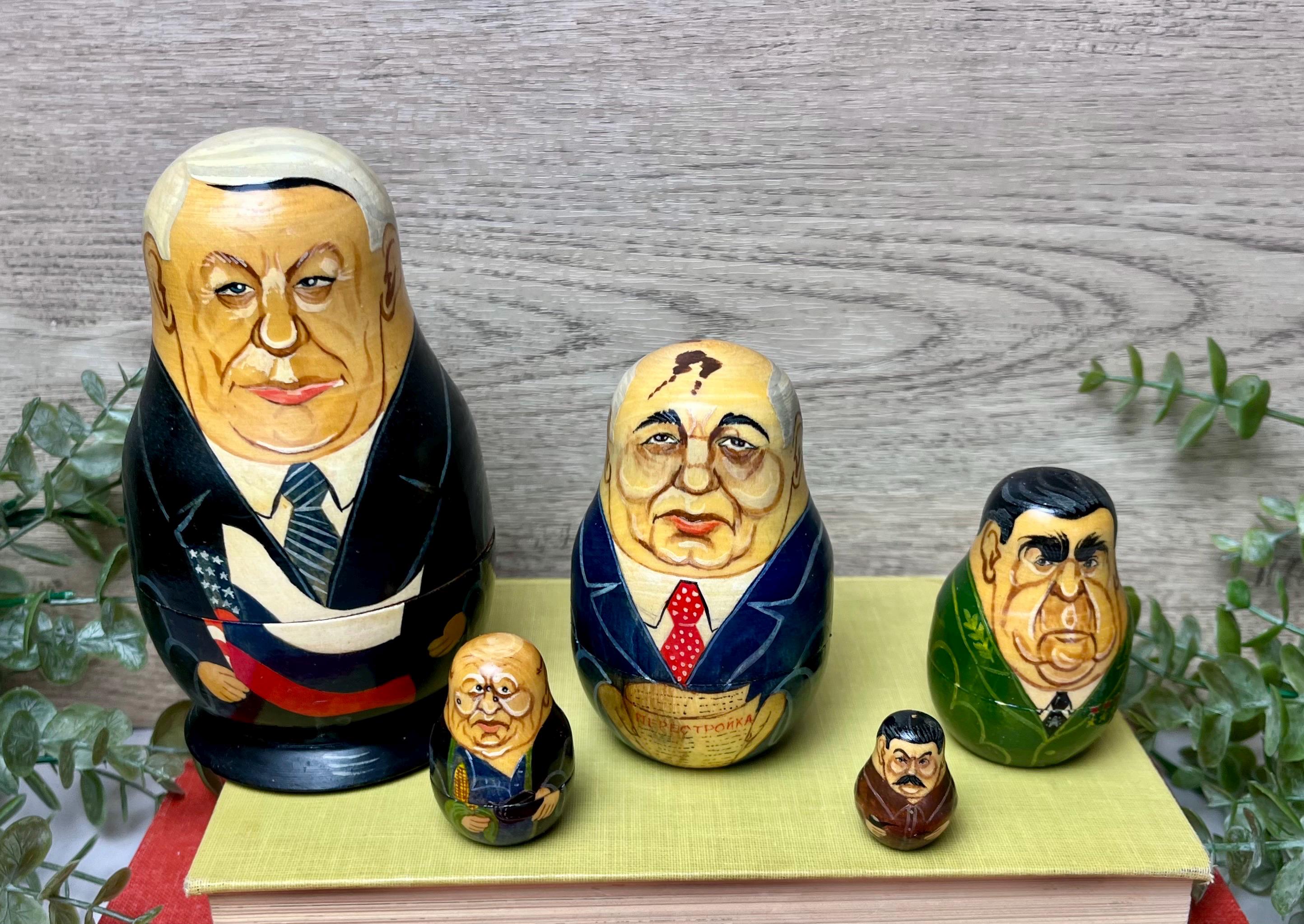 This unique vintage nesting doll set features five hand-painted caricature portraits of notable Soviet and Russian political figures, crafted in the traditional matryoshka style. Each wooden figure nests perfectly inside the next, showcasing fine detail and expressive brushwork.