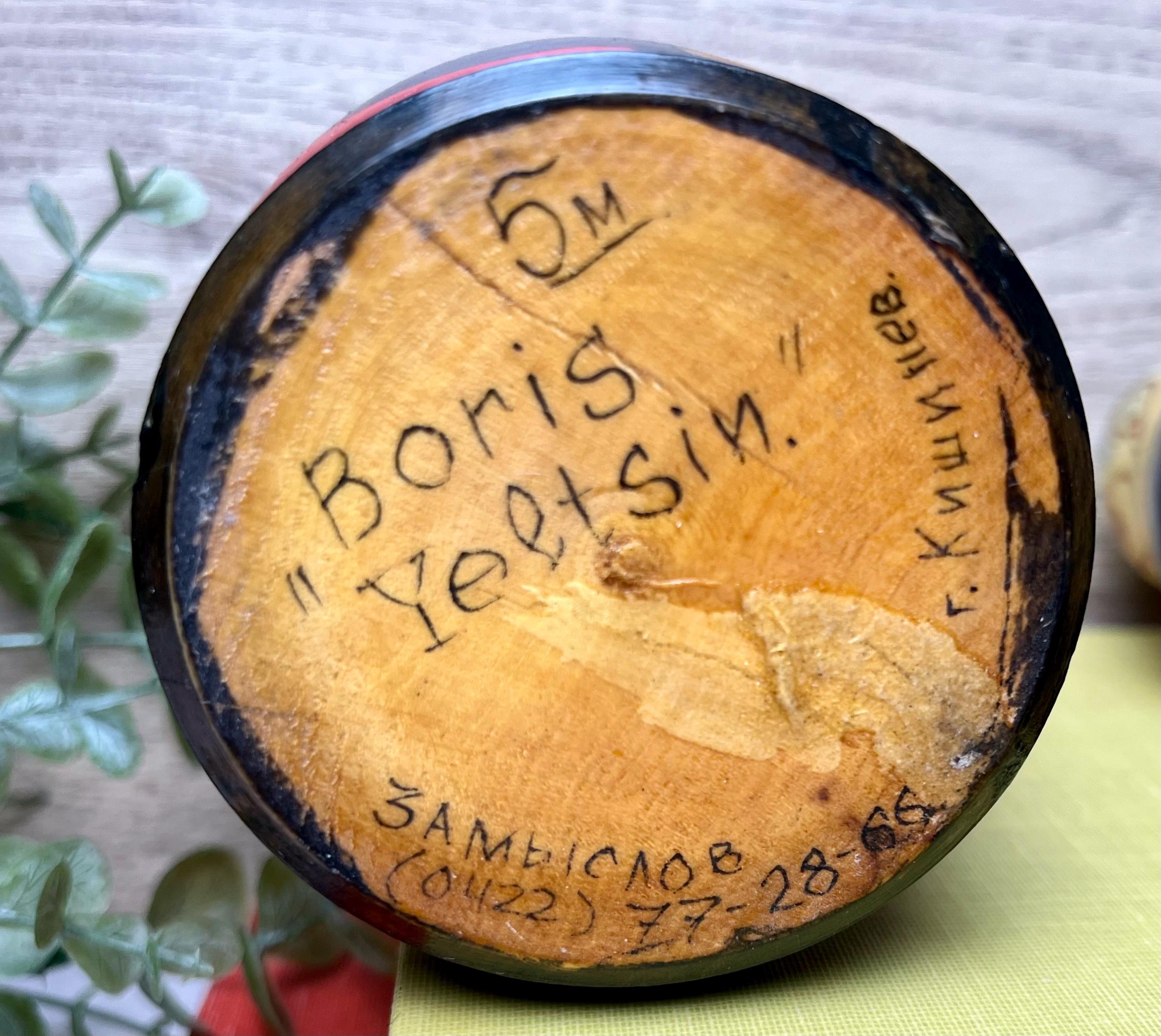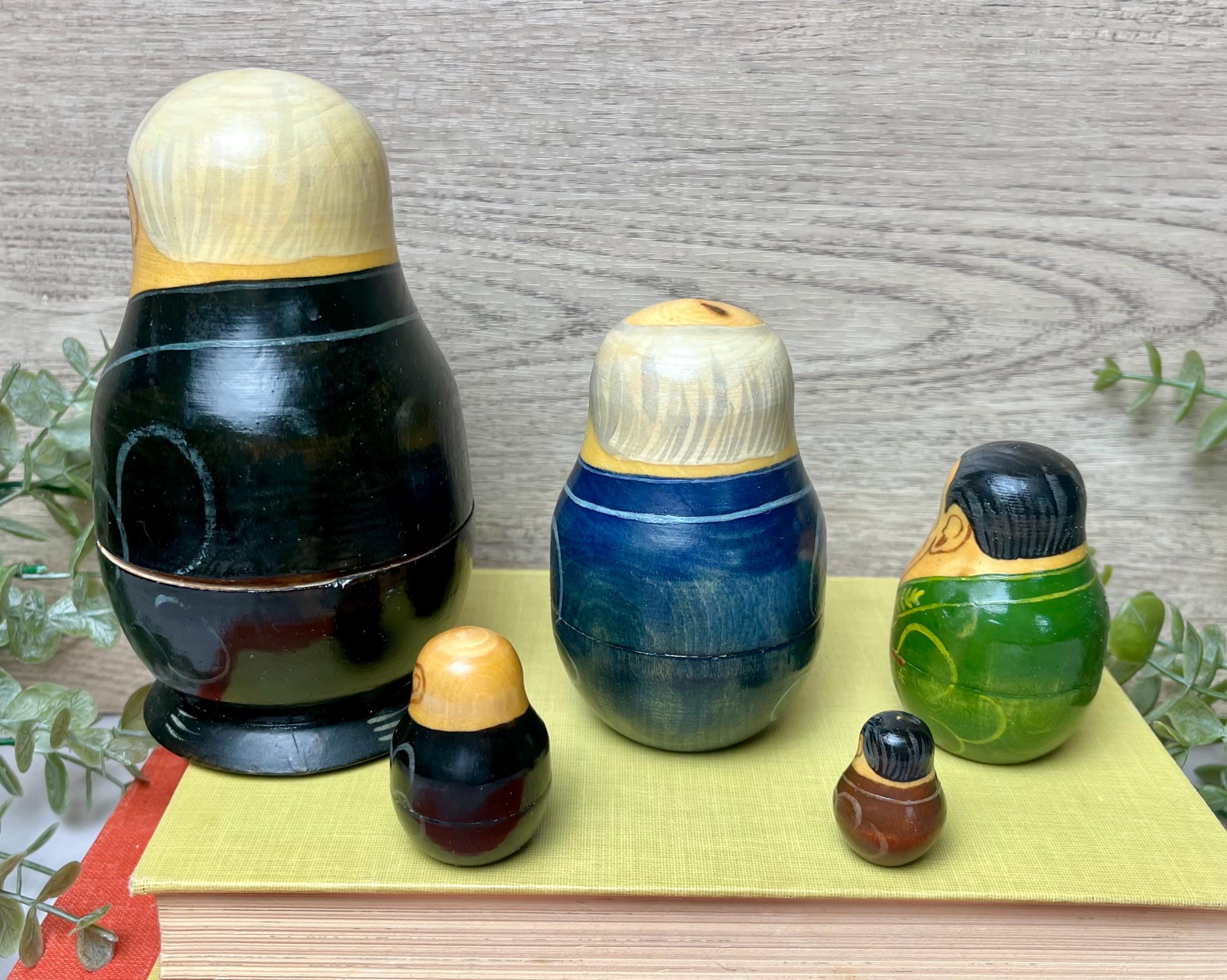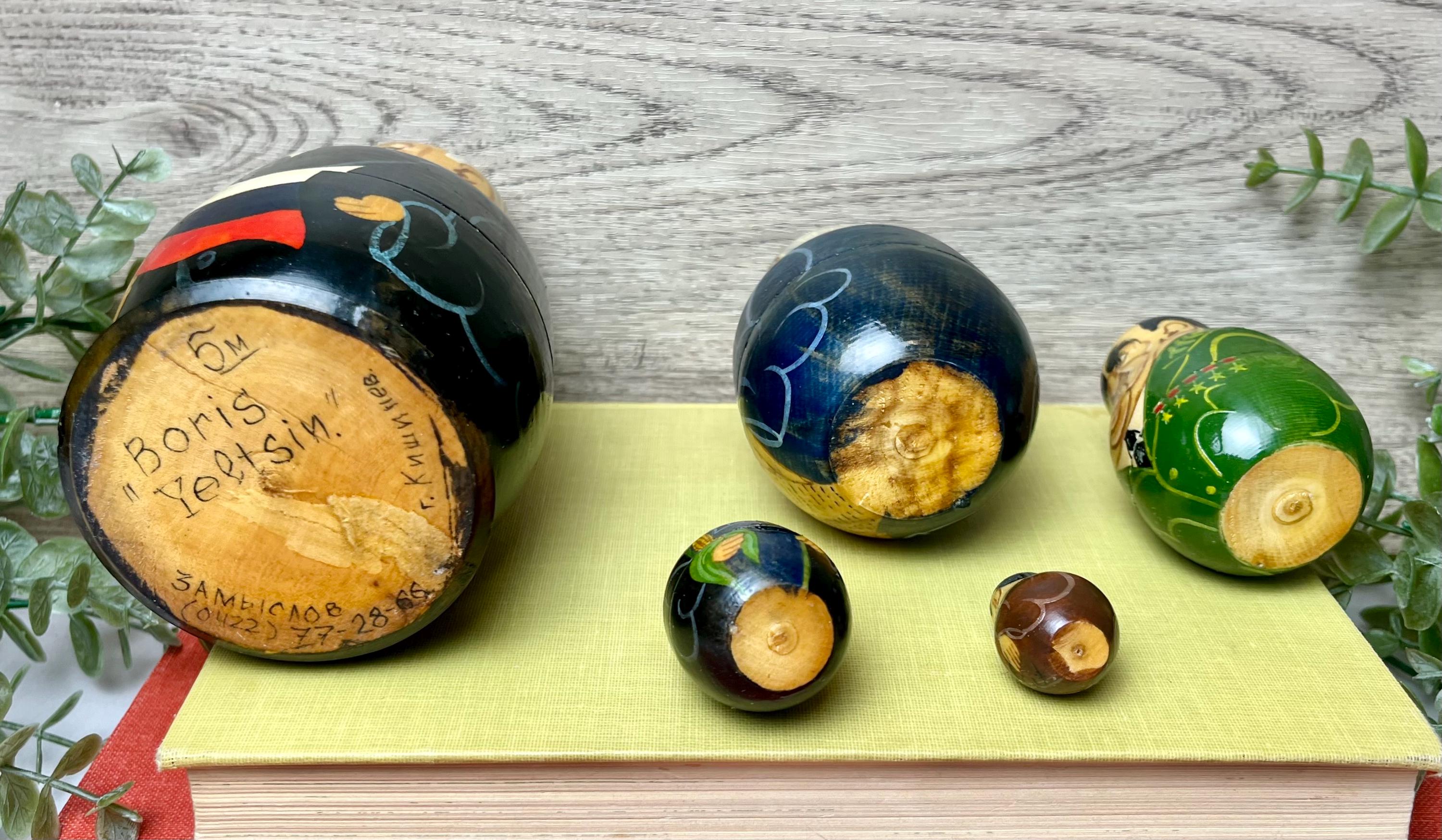 The set includes five dolls, each representing a historical leader from the late Soviet and early Russian Federation era. These collectible pieces were made in the 1990s and reflect the political and cultural climate of that time. • 🪆 Set of 5 dolls • 🎨 Hand-painted wooden figures with lacquer finish • ✨ Depicts key Soviet and Russian political leaders • 📏 Largest doll measures approximately 5.5” tall • 🇷🇺 Authentic Eastern European craftsmanship