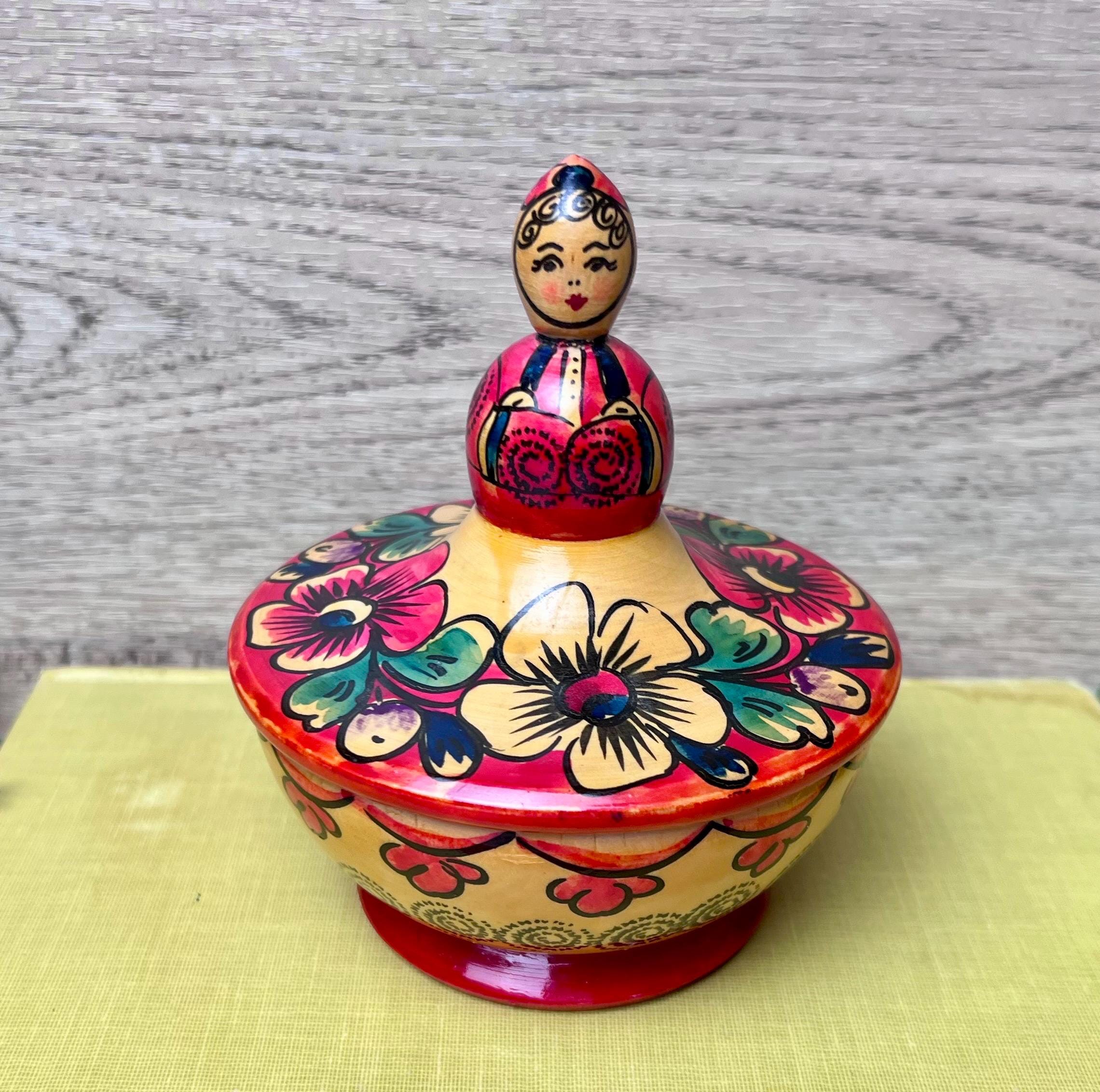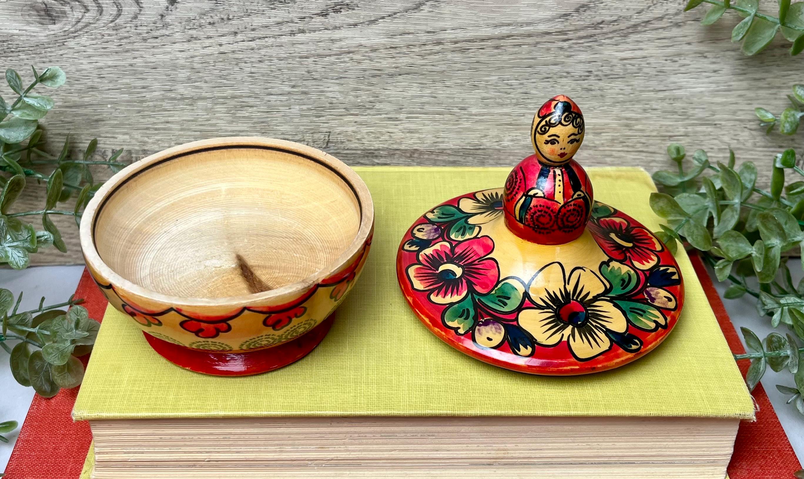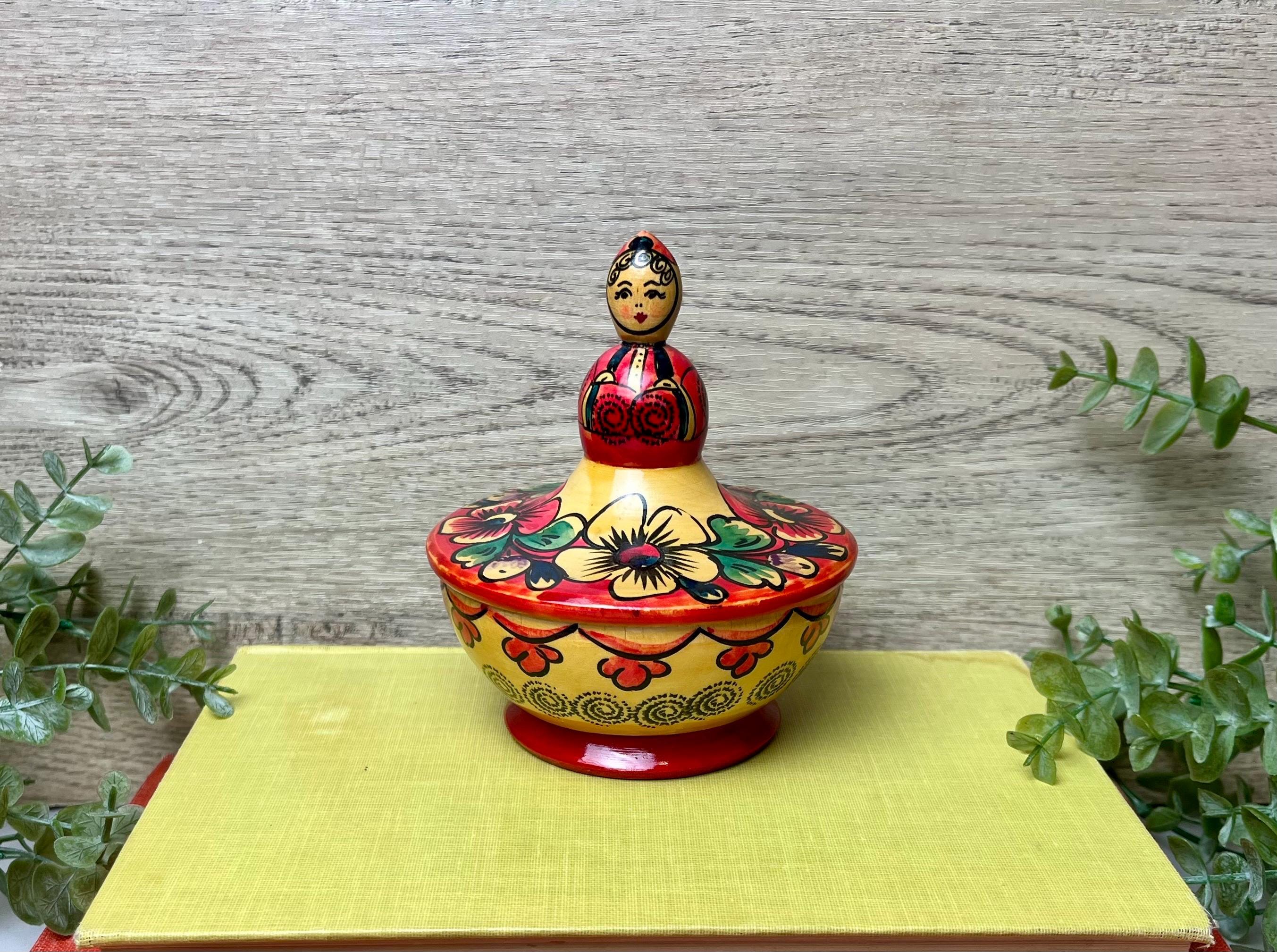 This charming vintage Russian wooden bowl with lid is a beautiful example of traditional folk craftsmanship. The hand-painted floral design features bold, vibrant colors in red, green, and yellow, with a unique doll-shaped handle on top. Perfect as a decorative accent, trinket holder, or display piece for lovers of Eastern European folk art. • 🇷🇺 Vintage Russian folk art • 🪵 Handcrafted wood with hand-painted floral design • 🎨 Traditional Khokhloma-inspired style • 🧺 Decorative bowl with doll-shaped lid handle • 📏 Approx. 4.5” tall x 4” wide