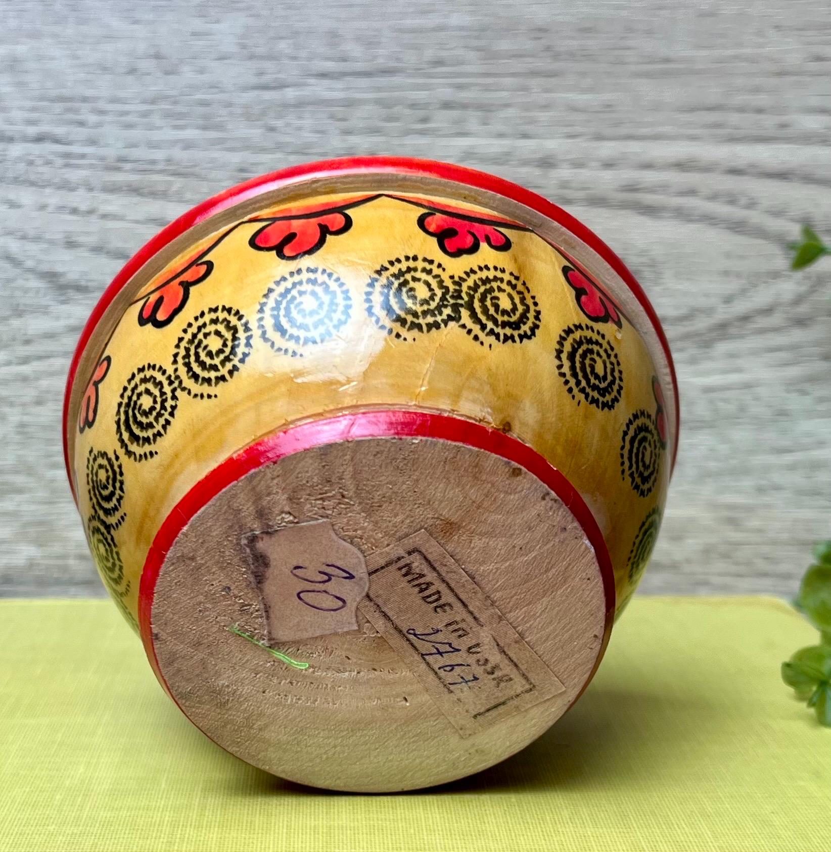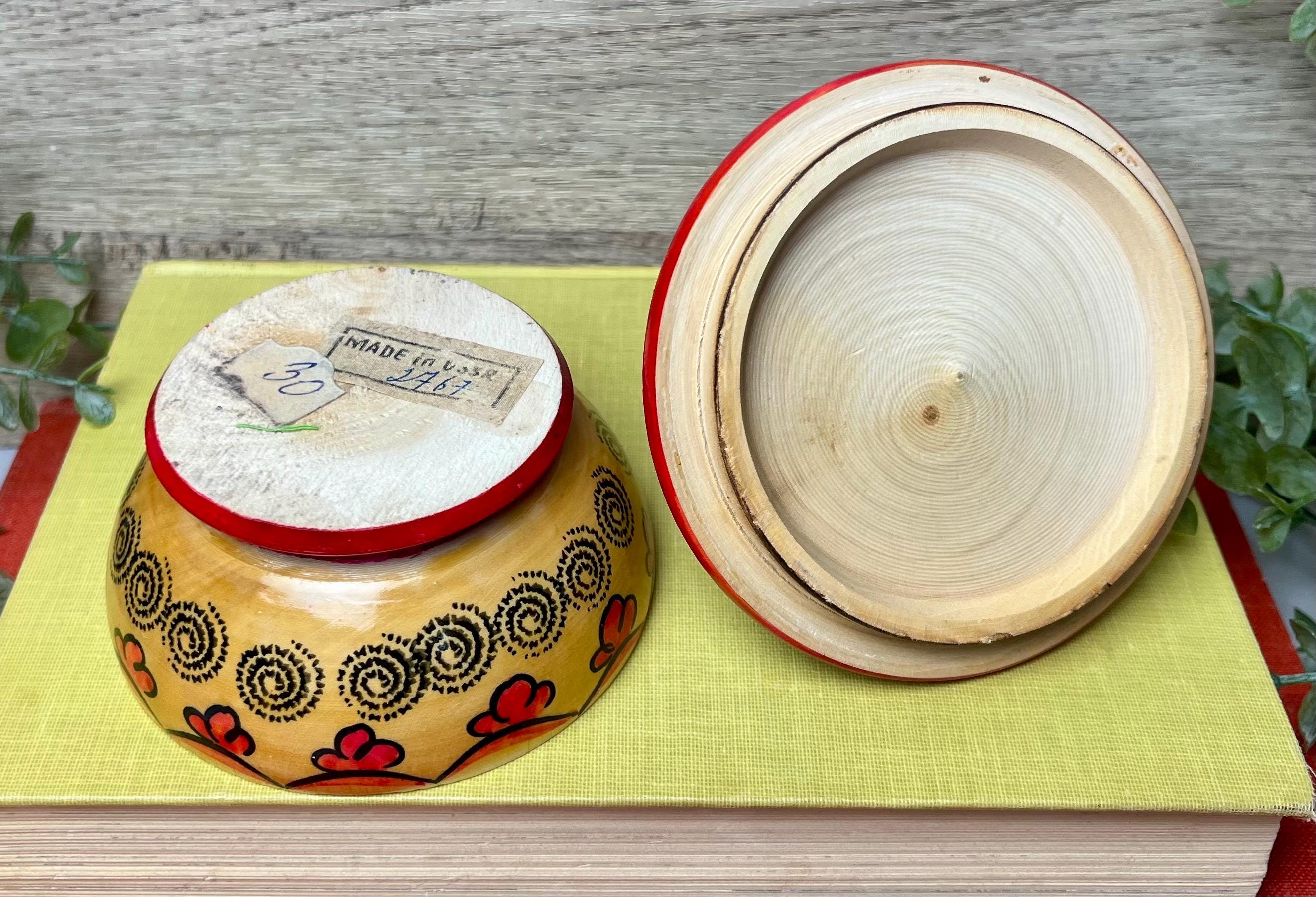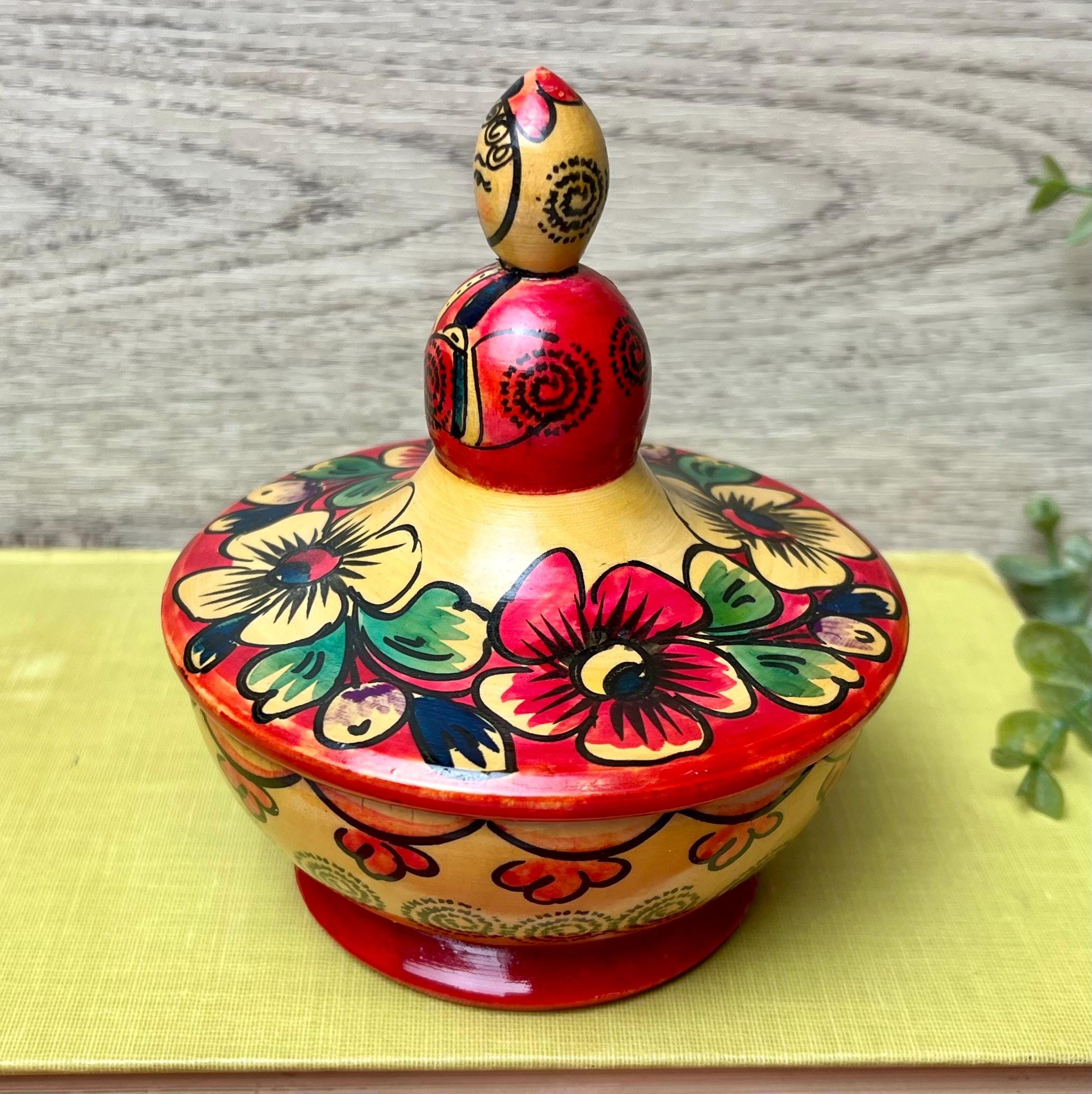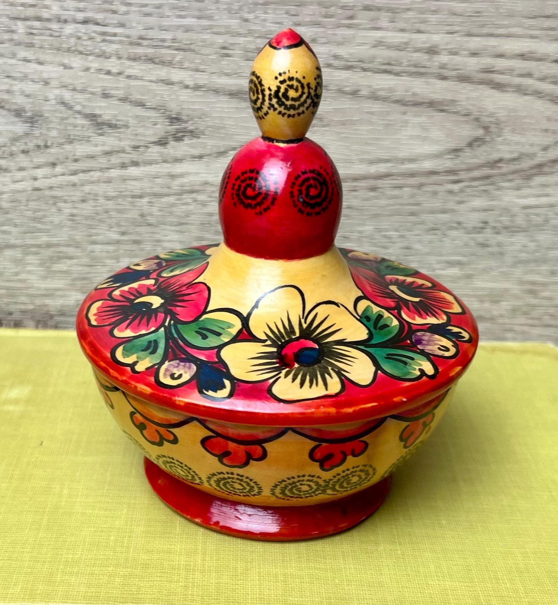 This charming vintage Russian wooden bowl with lid is a beautiful example of traditional folk craftsmanship. The hand-painted floral design features bold, vibrant colors in red, green, and yellow, with a unique doll-shaped handle on top. Perfect as a decorative accent, trinket holder, or display piece for lovers of Eastern European folk art. • 🇷🇺 Vintage Russian folk art • 🪵 Handcrafted wood with hand-painted floral design • 🎨 Traditional Khokhloma-inspired style • 🧺 Decorative bowl with doll-shaped lid handle • 📏 Approx. 4.5” tall x 4” wide