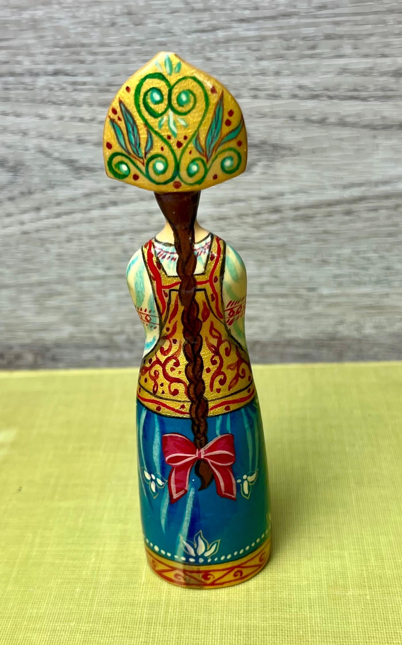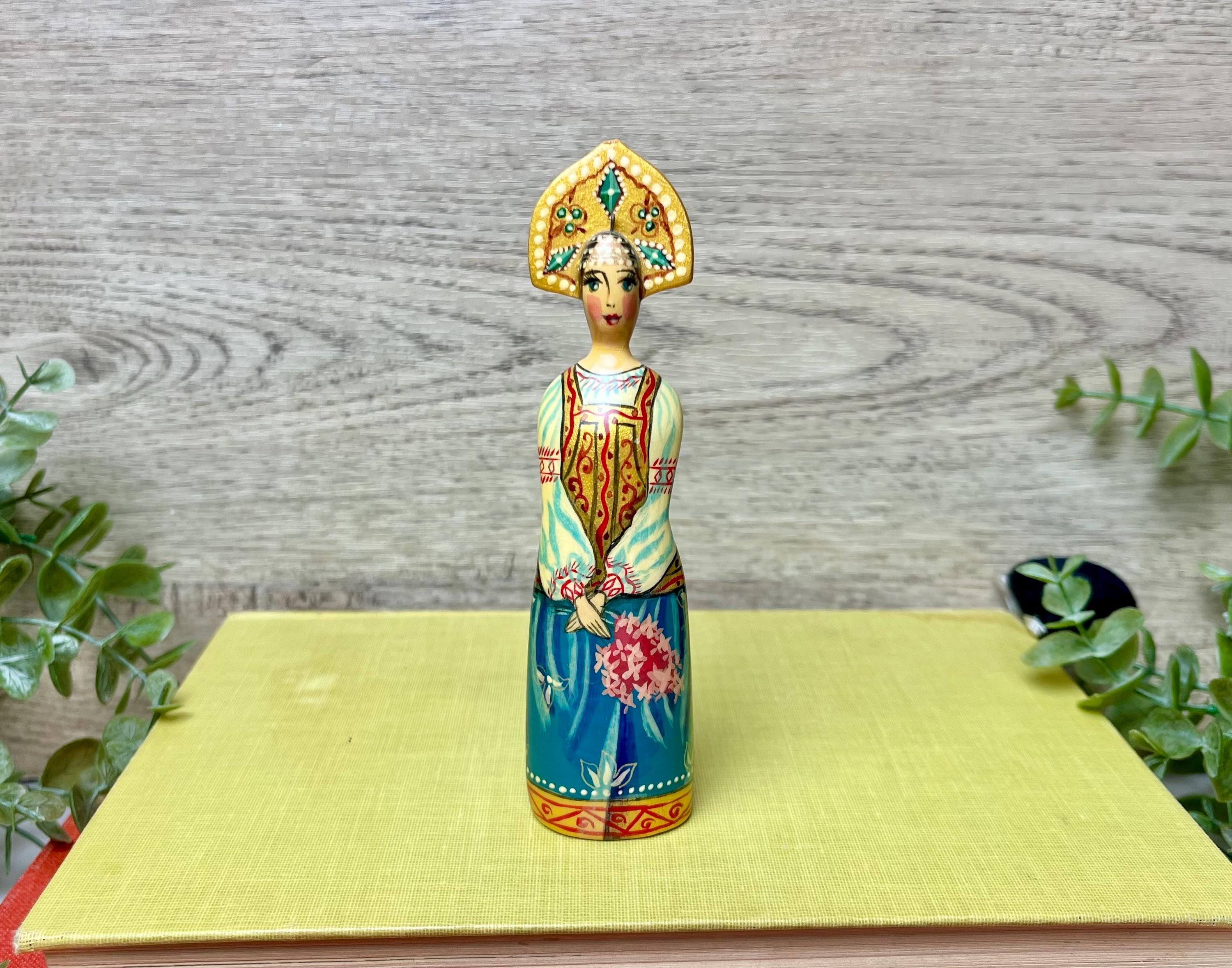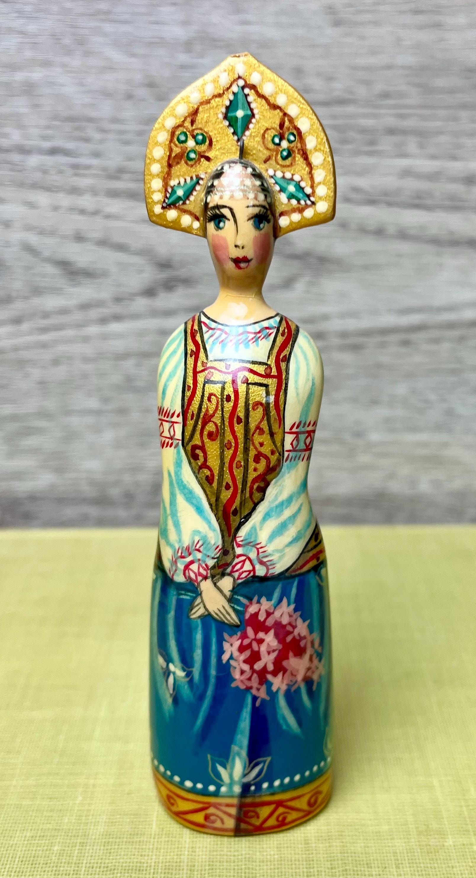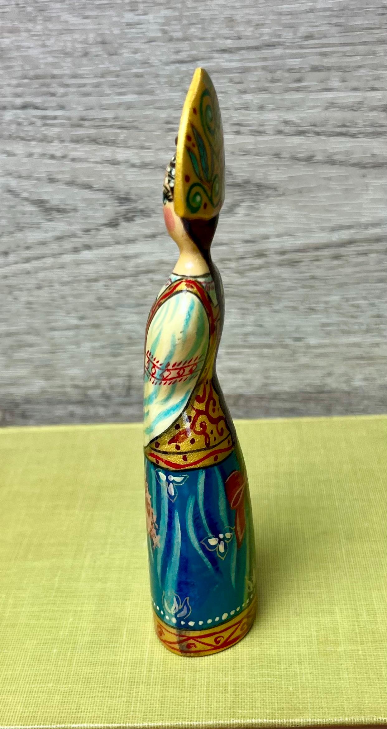This exquisite vintage wooden folk figure beautifully depicts a woman in traditional Russian attire, complete with a kokoshnik (ornate headdress) and detailed hand-painted costume. The vibrant colors, intricate floral motifs, and fine brushwork reflect skilled craftsmanship and cultural heritage.