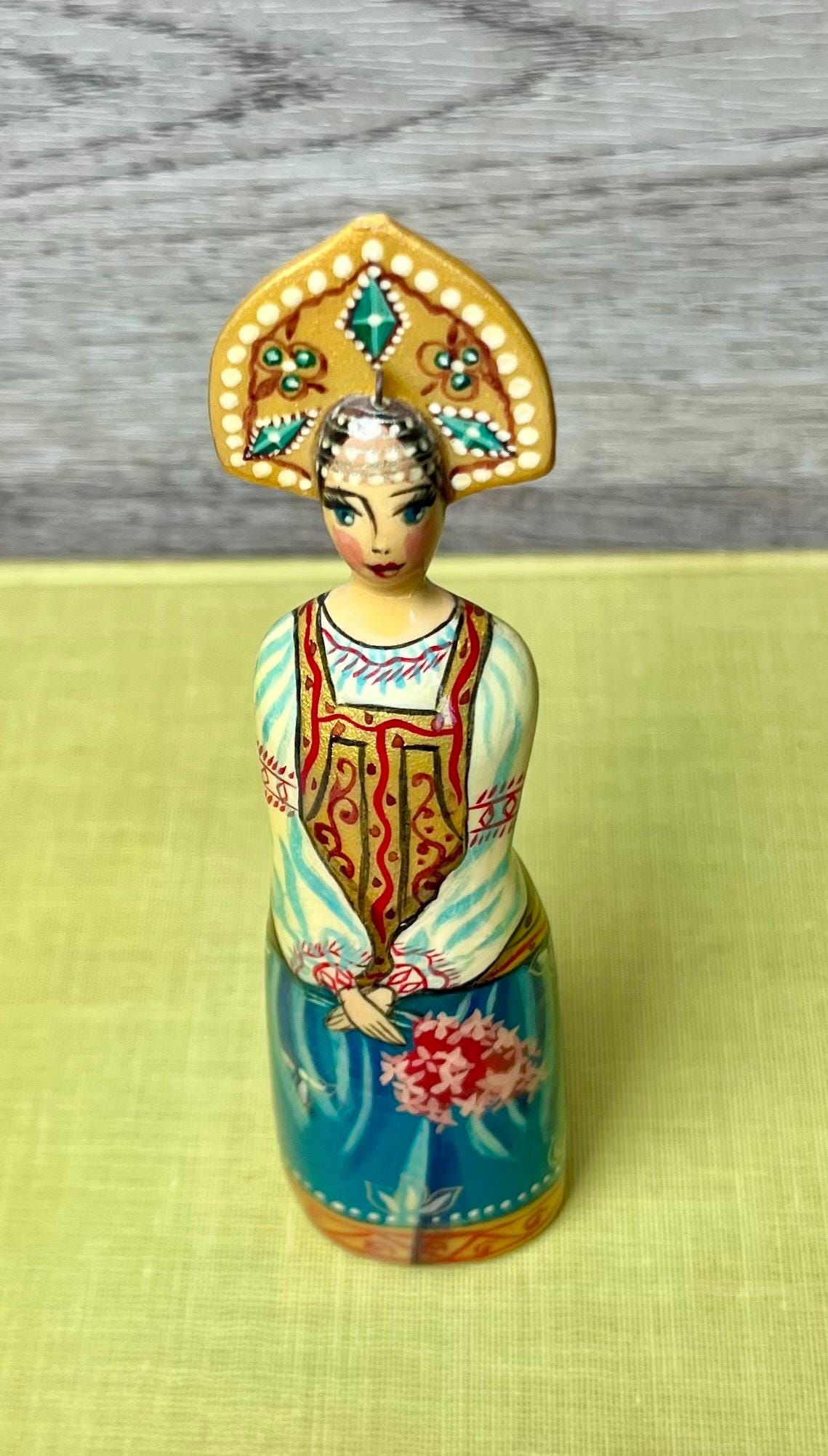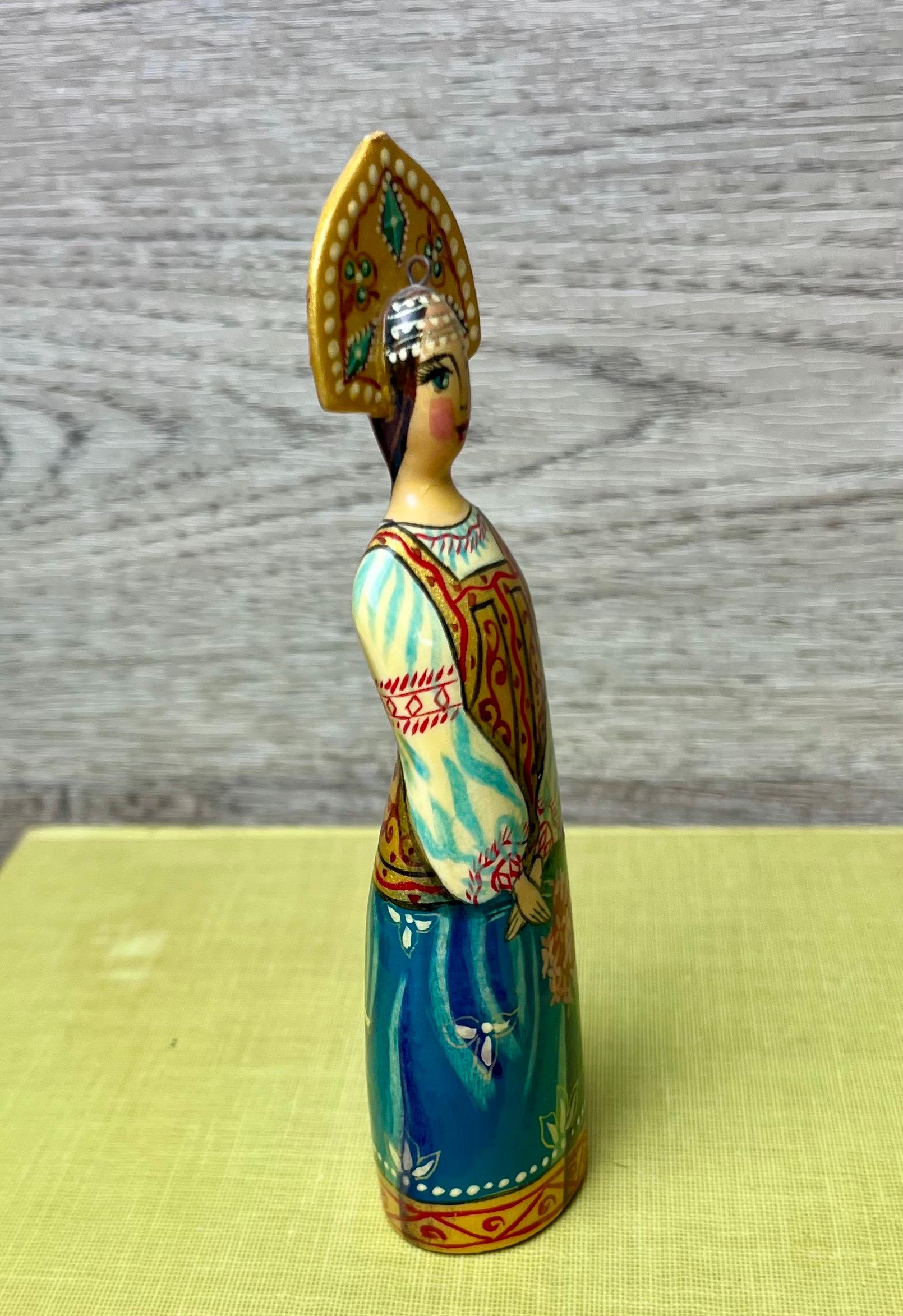 ✨ Features: • Authentic vintage hand-painted wooden figure • Traditional Russian folk costume with kokoshnik headdress • Vivid floral detailing and gold accents • Estimated era: mid to late 20th century • Height: approx. 5 inches • Excellent vintage condition with minimal wear