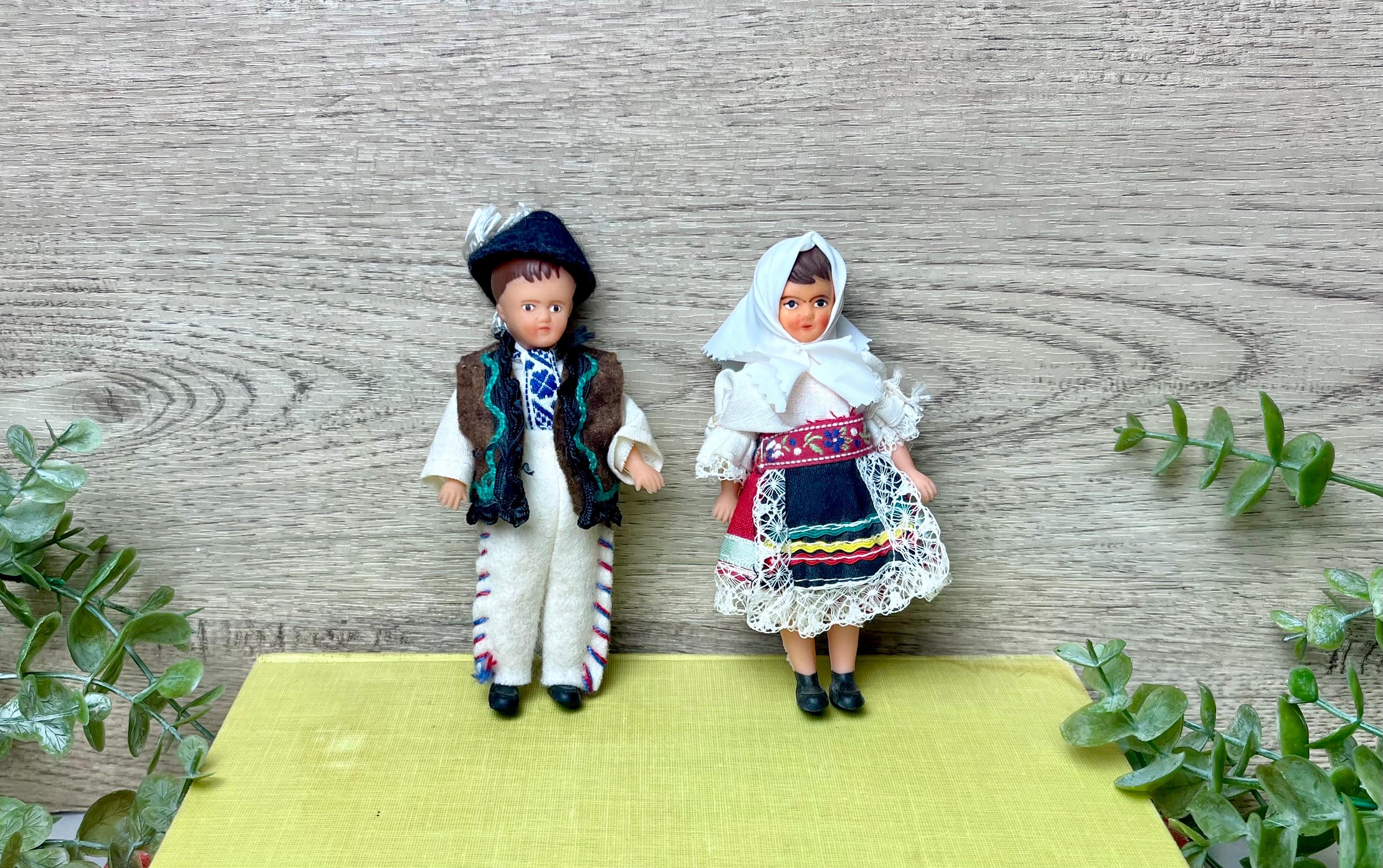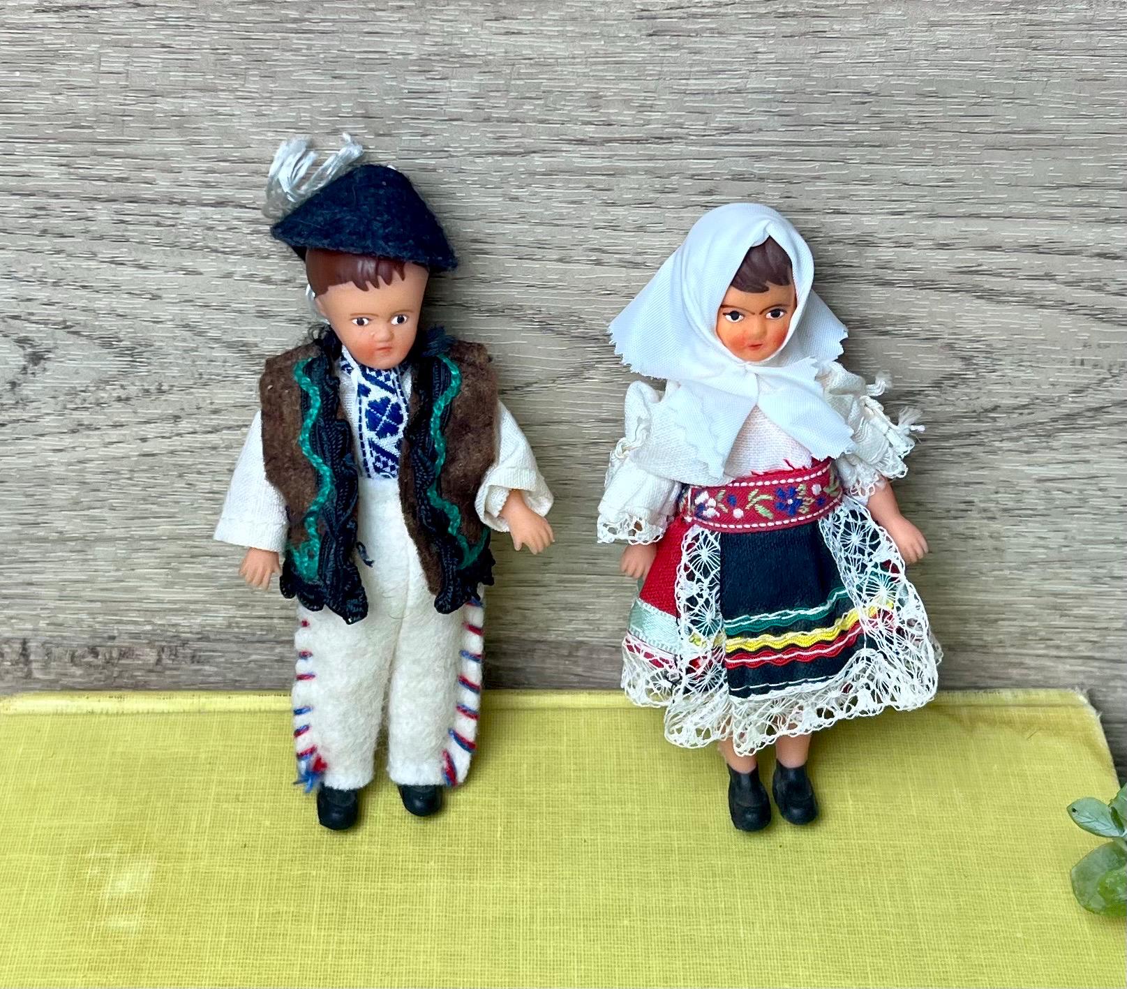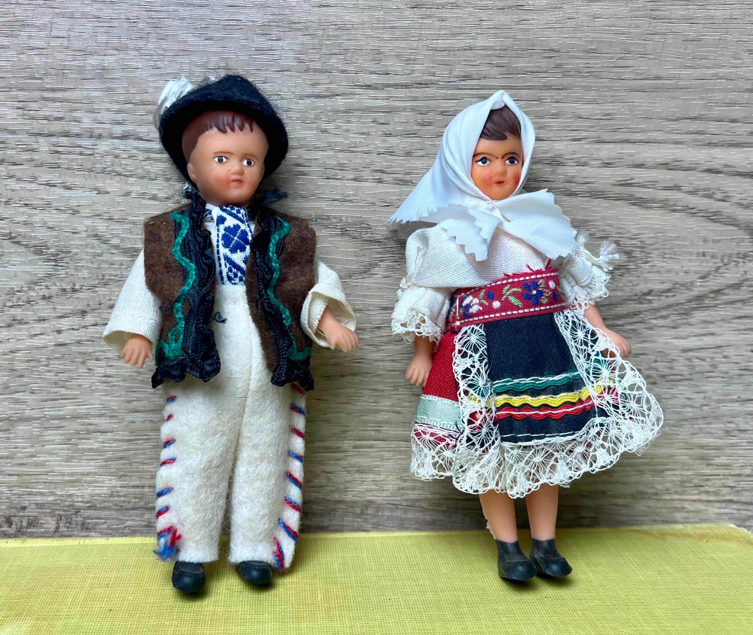 ✨ Features: • Authentic vintage Polish folk doll set (male and female) • Detailed traditional attire with embroidered, woven, and lace accents • Handcrafted clothing and accessories • Mounted on wooden display stands • Estimated era: mid to late 20th century • Height: approx. 10 in (male), 7 in (female) • Excellent vintage condition with minimal wear