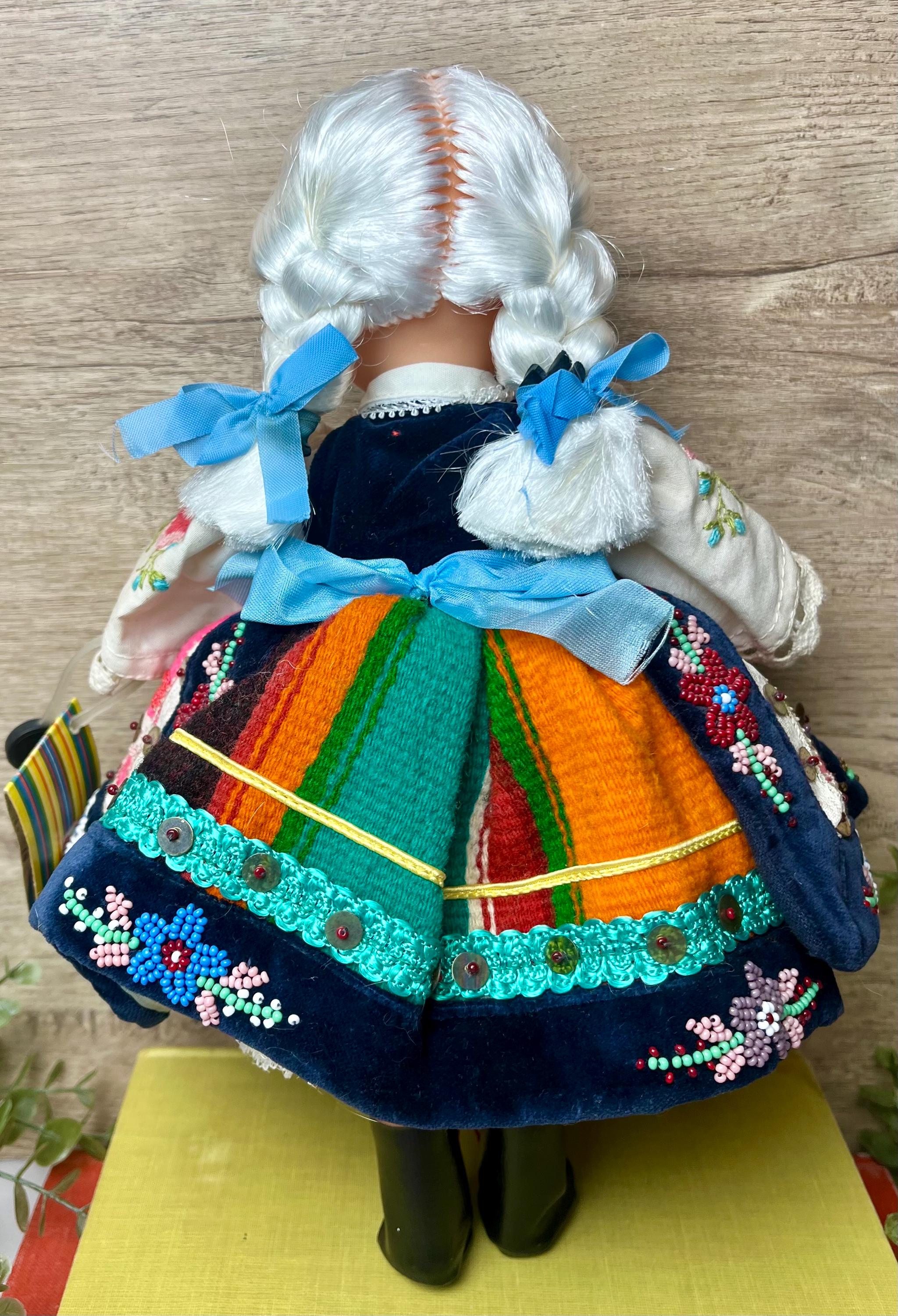 This stunning vintage Polish folk doll features a vibrant and intricately crafted traditional costume. Her outfit includes a colorful striped wool skirt trimmed with lace, sequins, and beaded floral embroidery, paired with a white blouse and dark velvet vest. She wears black lace-up boots and has long, white braided hair — a classic look inspired by Polish regional attire.