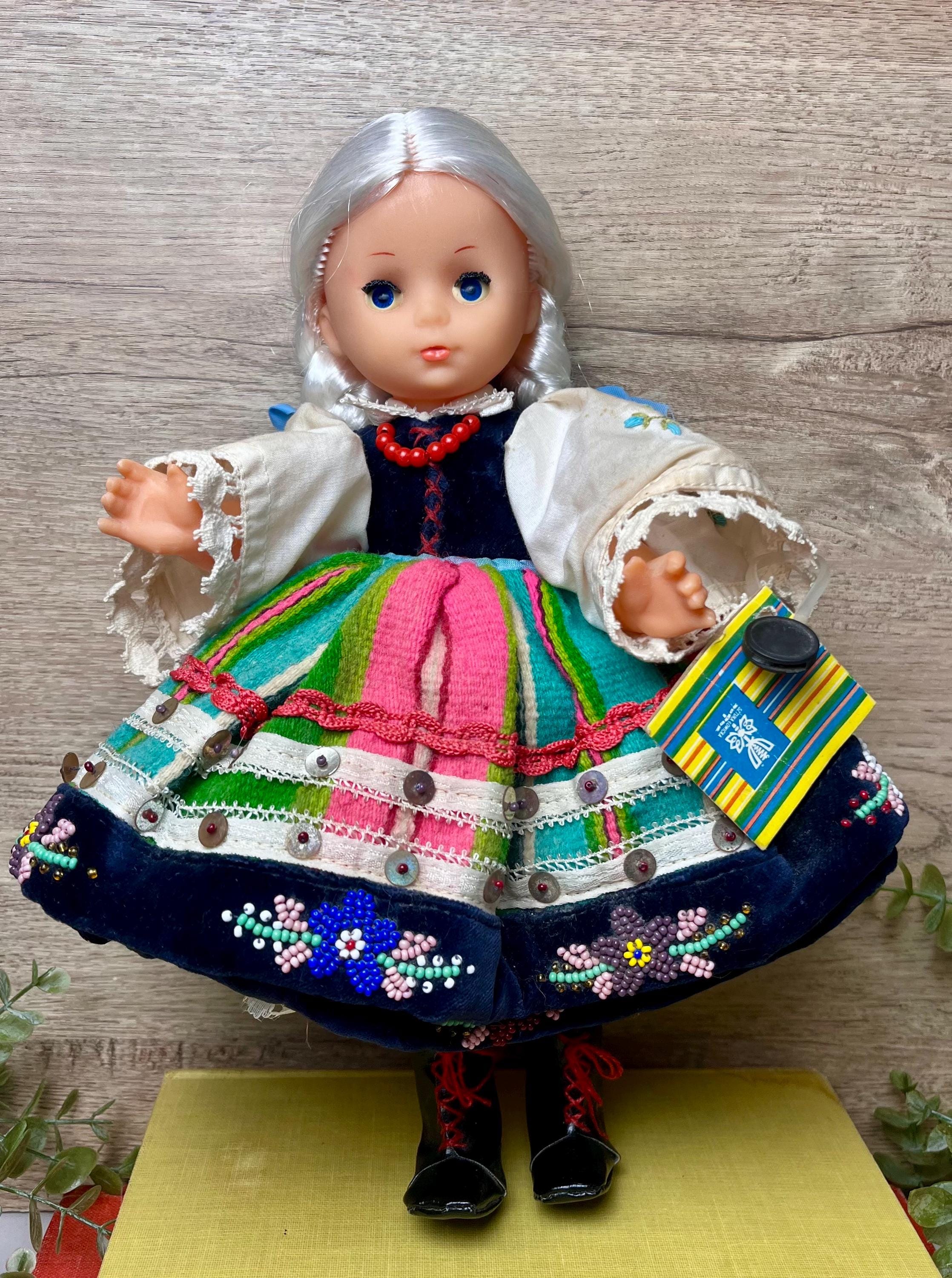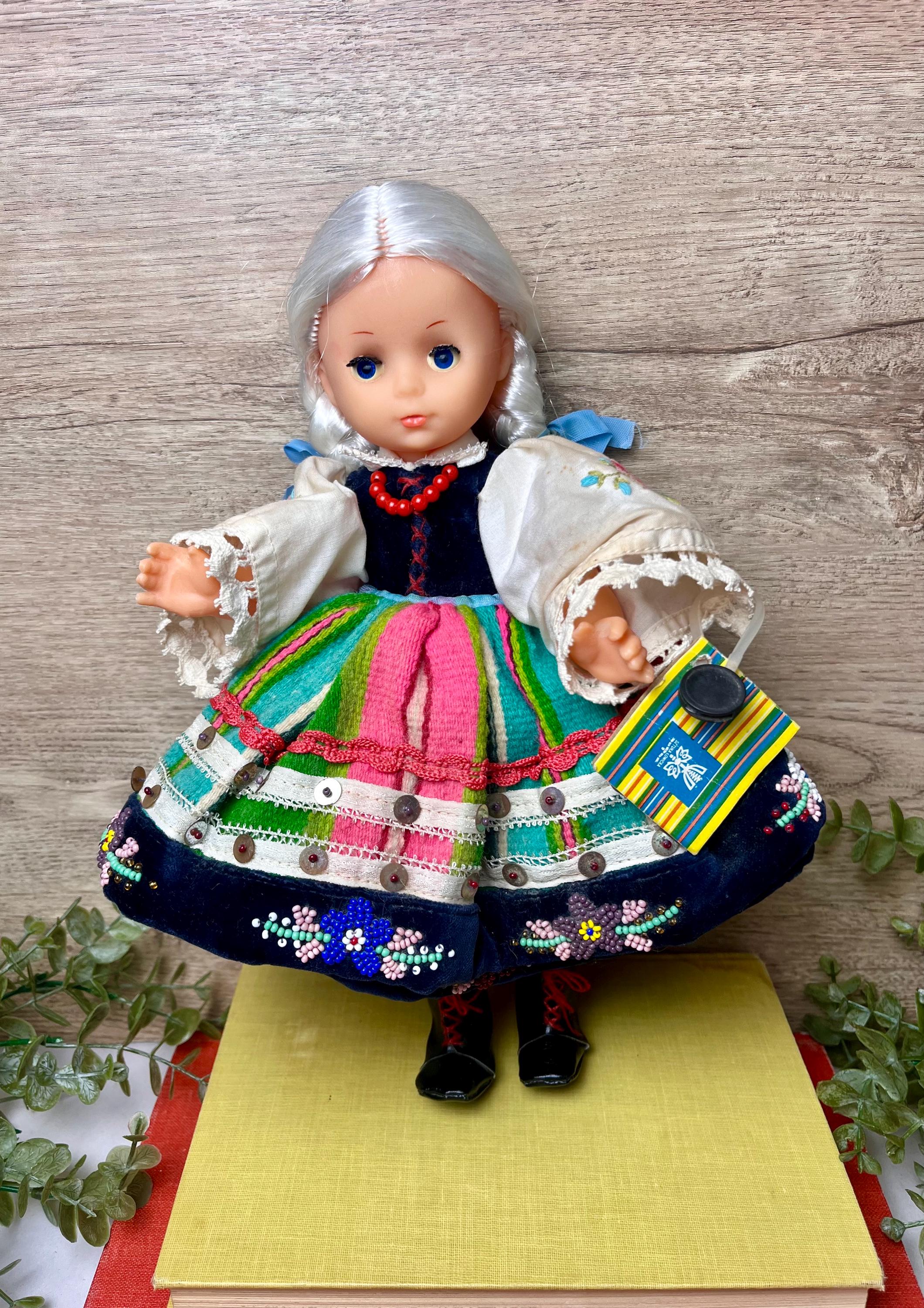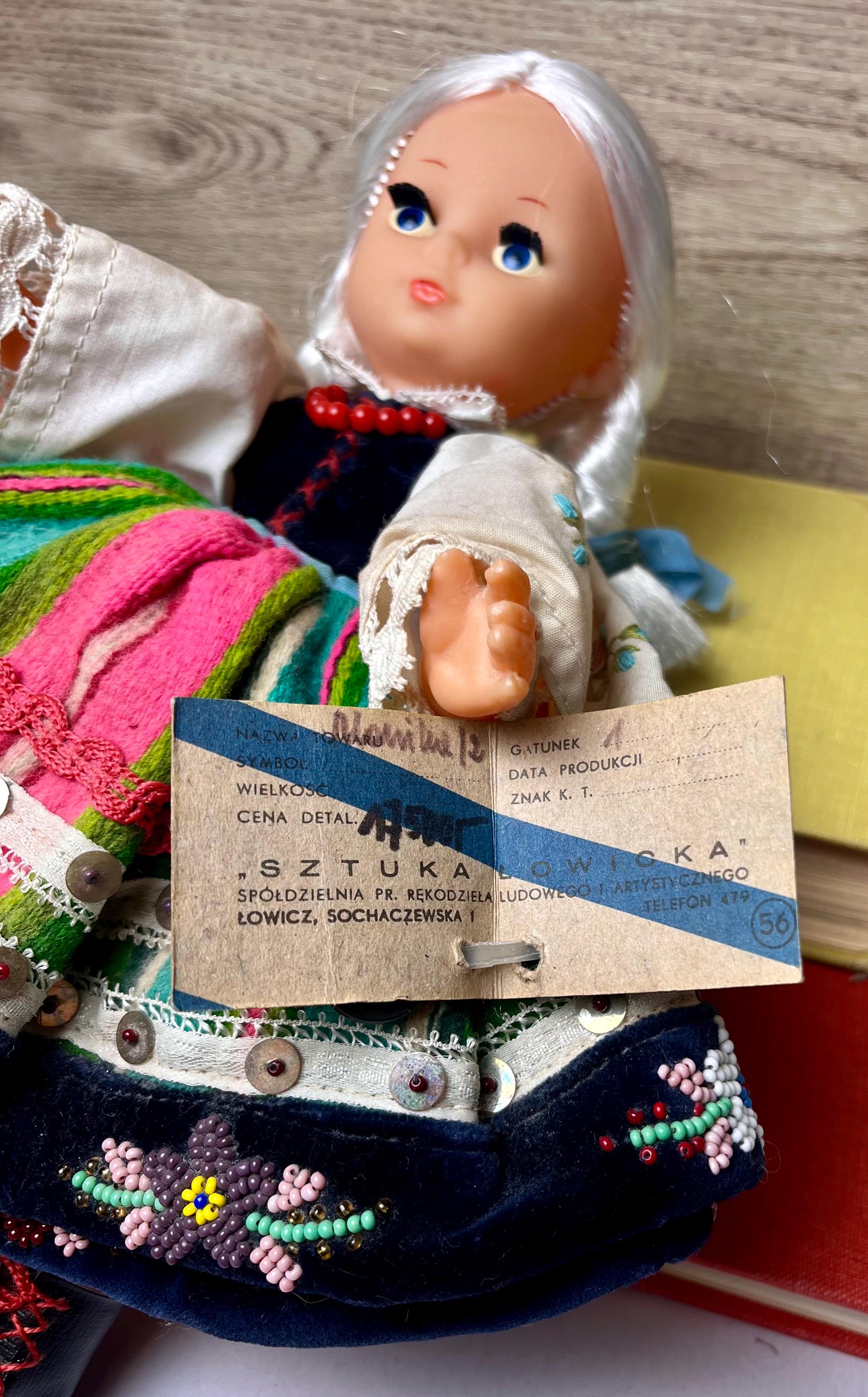✨ Features: • Authentic vintage Polish folk doll • Colorful embroidered and beaded traditional costume • Original tag still attached • Material: plastic body, textile clothing, beading, and lace details • Estimated era: late 20th century • Height: approx. 11 inches (28 cm) • Excellent vintage condition with minimal wear