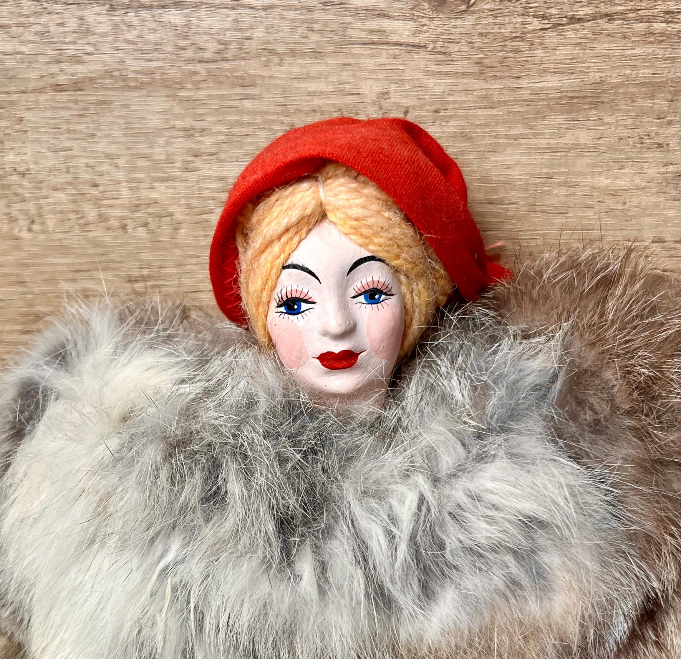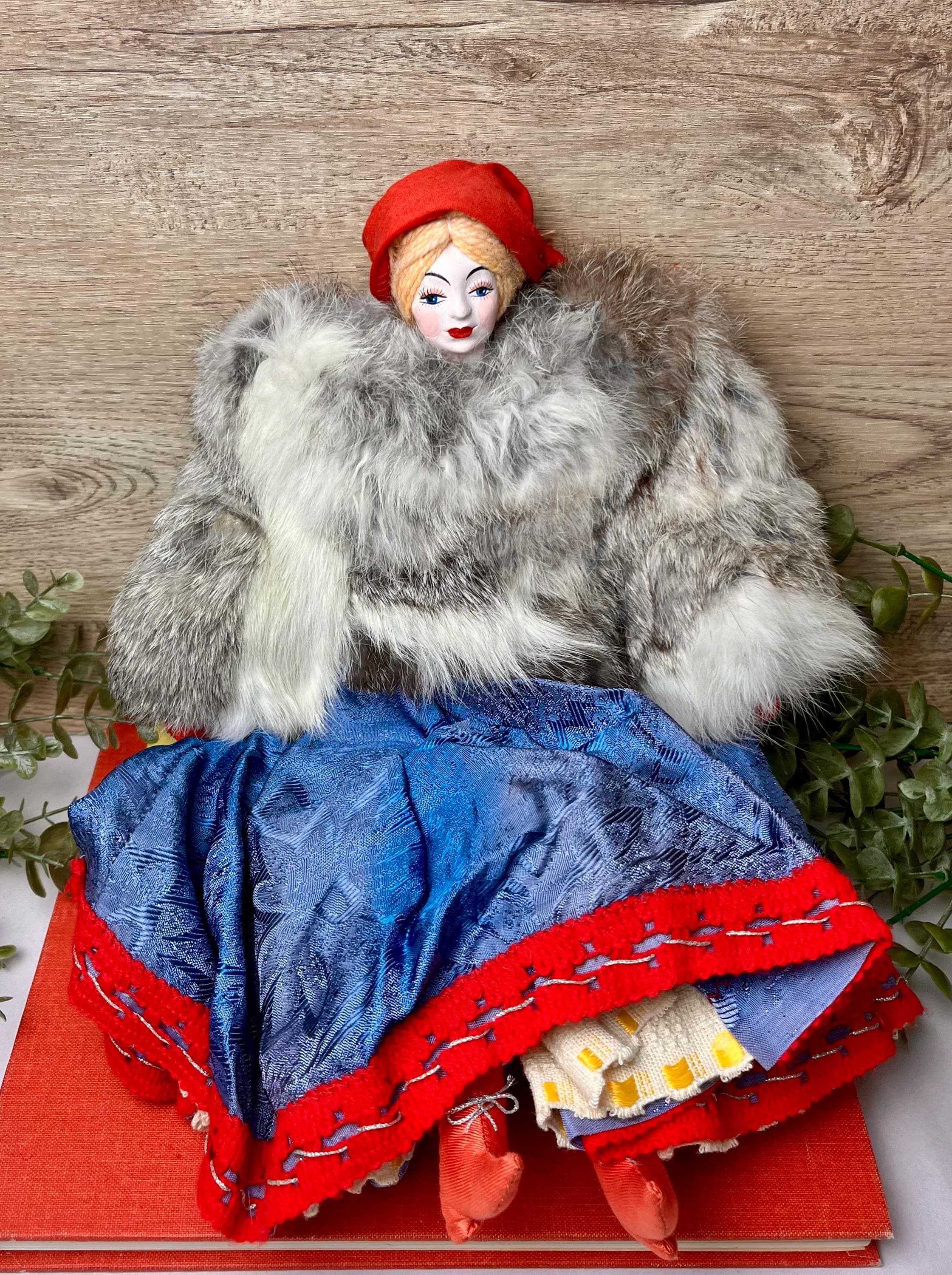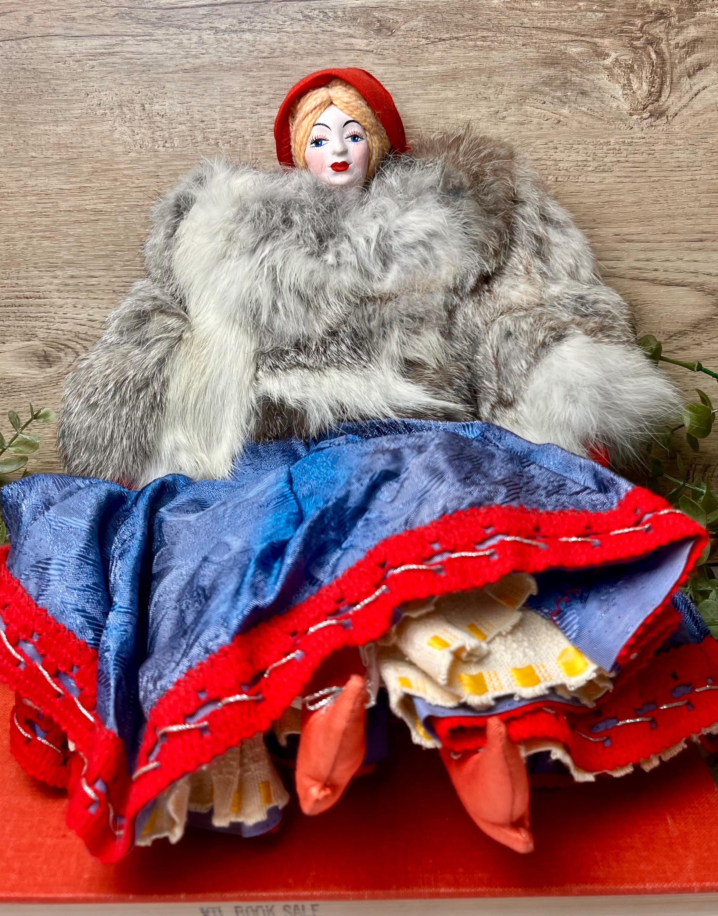 This striking vintage Russian folk doll is dressed in a traditional winter outfit, complete with a luxurious faux fur coat, vibrant red headscarf, and richly layered skirt. Her hand-painted face with bold red lips and rosy cheeks captures classic Eastern European folk style.