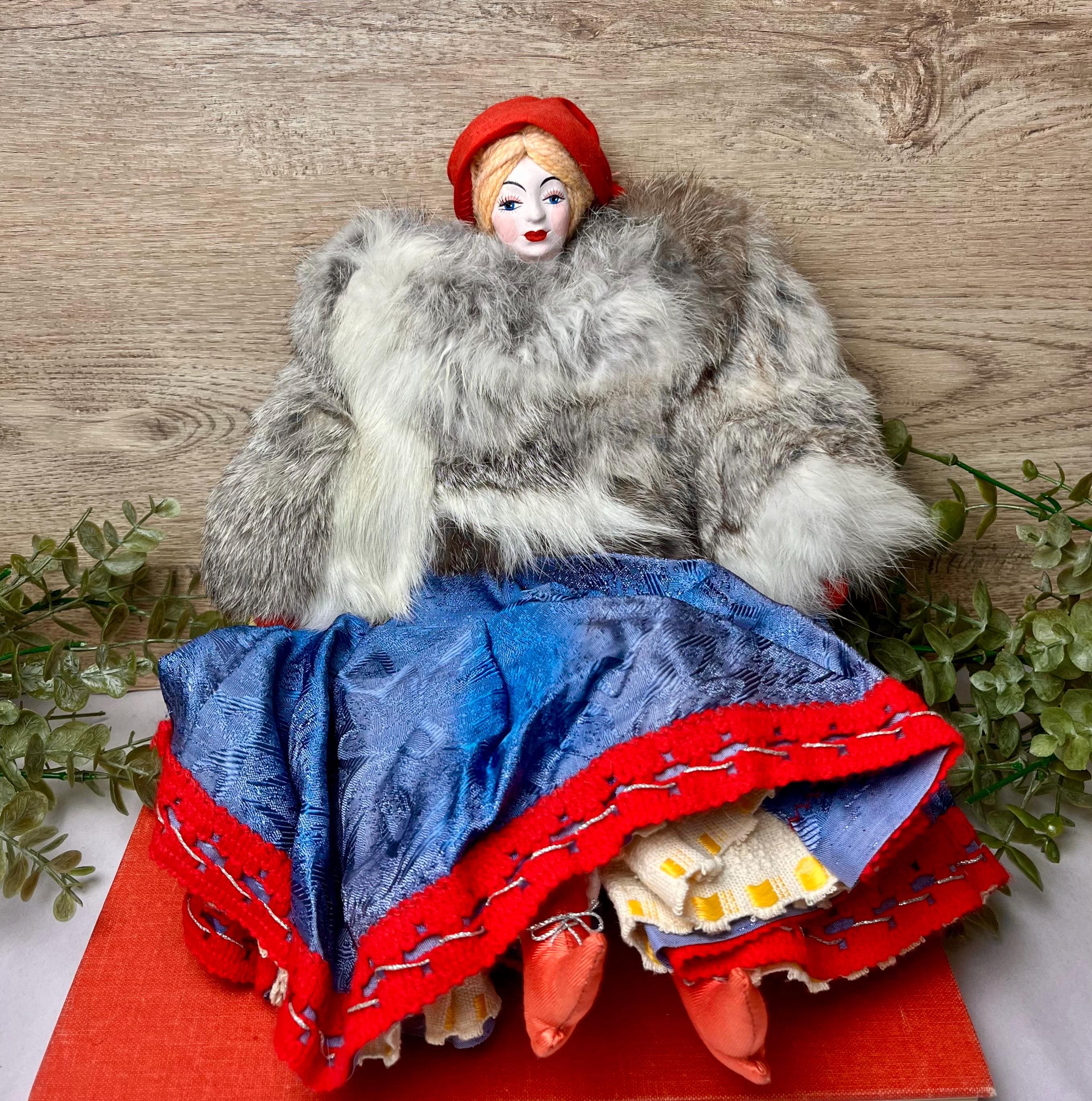 ✨ Features: • Authentic vintage Russian folk doll • Traditional winter costume with faux fur coat and layered skirt • Hand-painted facial features with vibrant red lips and detailed eyes • Likely mid–20th century craftsmanship • Height (sitting): approx. 13 inches (33 cm) • Excellent vintage condition with minimal wear