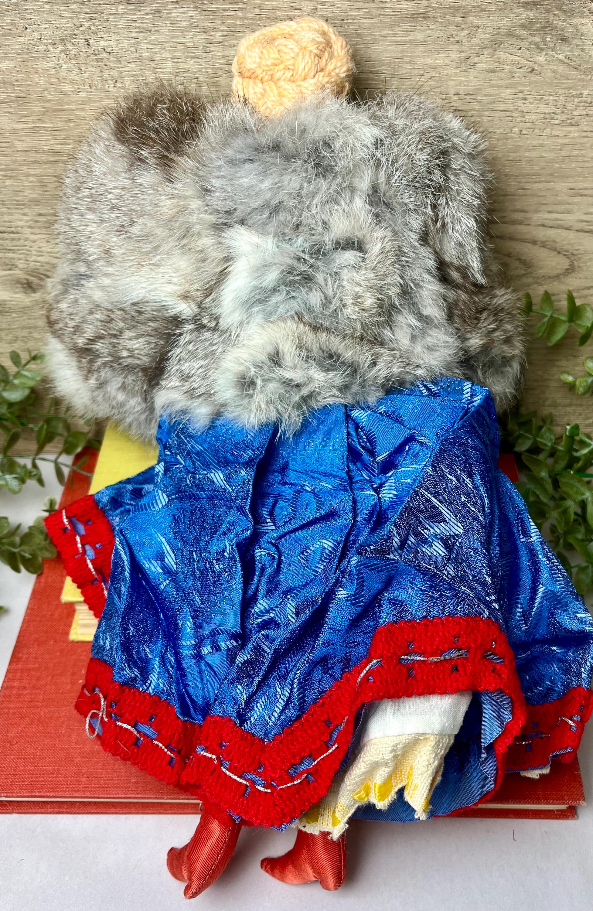 This handcrafted doll beautifully reflects traditional Russian winter attire, making it a perfect collectible for folk art enthusiasts, cultural displays, or vintage décor lovers.