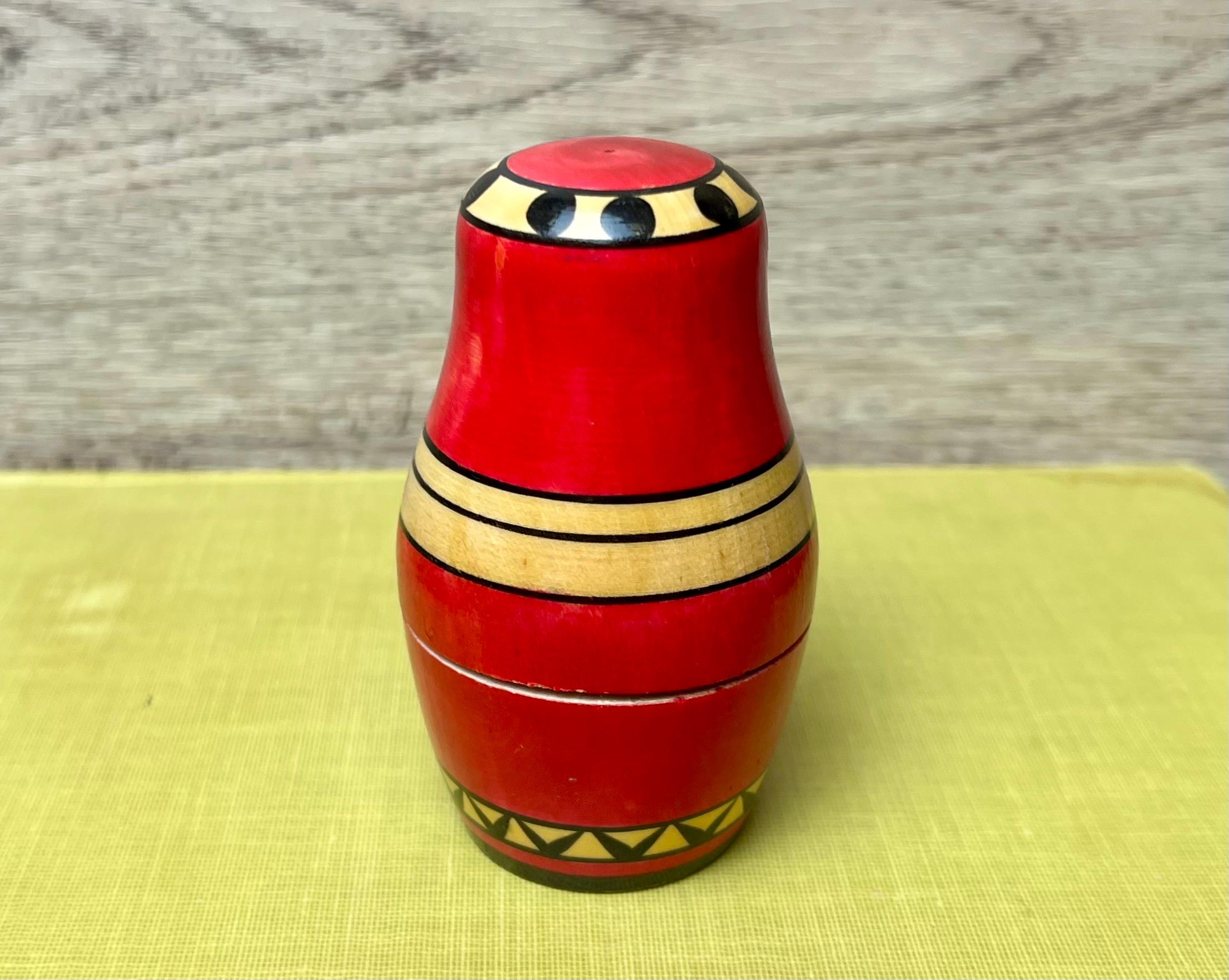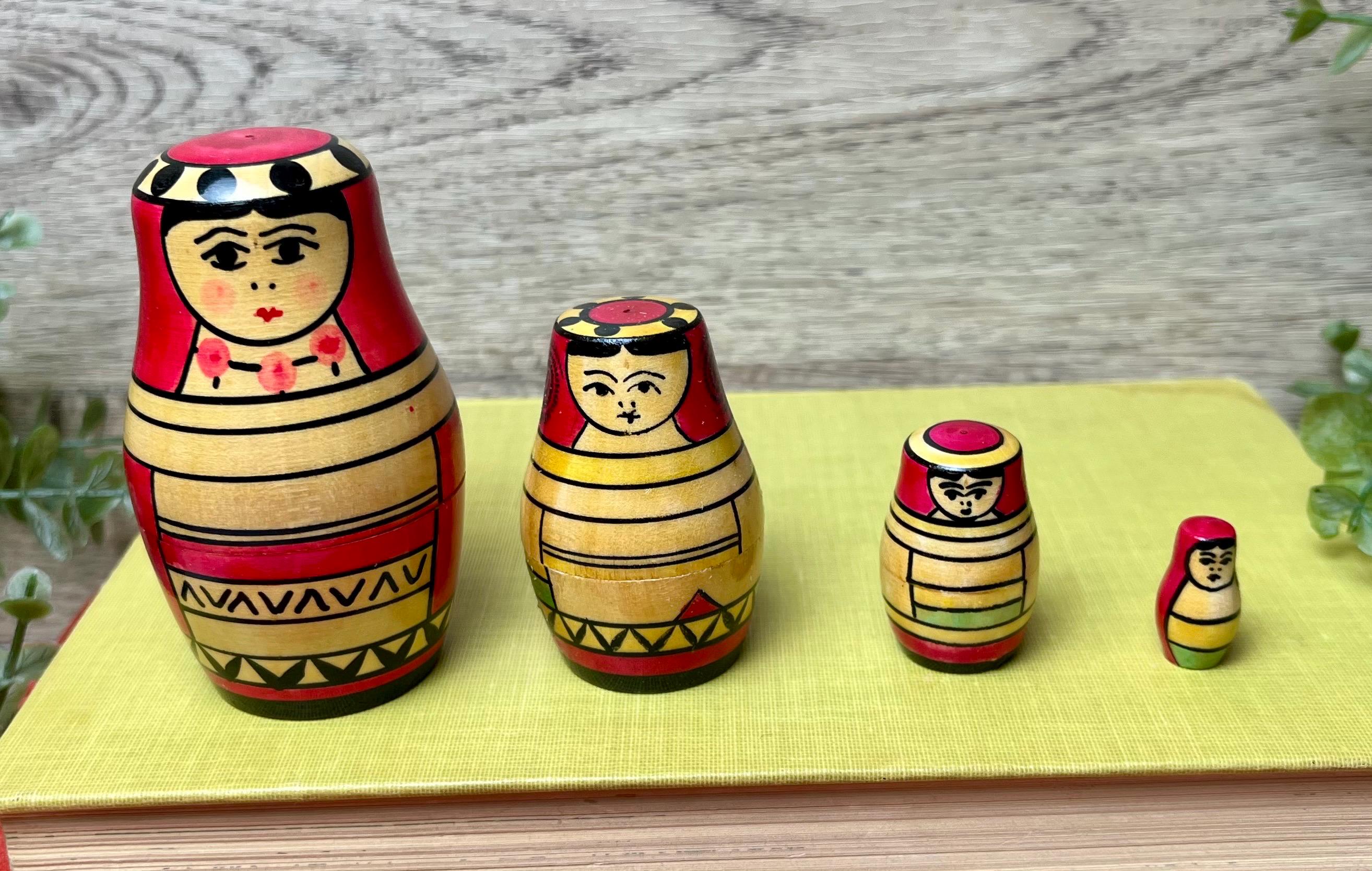 This charming vintage set of four hand-painted Russian nesting dolls beautifully showcases traditional Matryoshka folk art. Each wooden doll features simple, vibrant red and yellow designs with black outlining, reflecting a classic mid-century aesthetic.