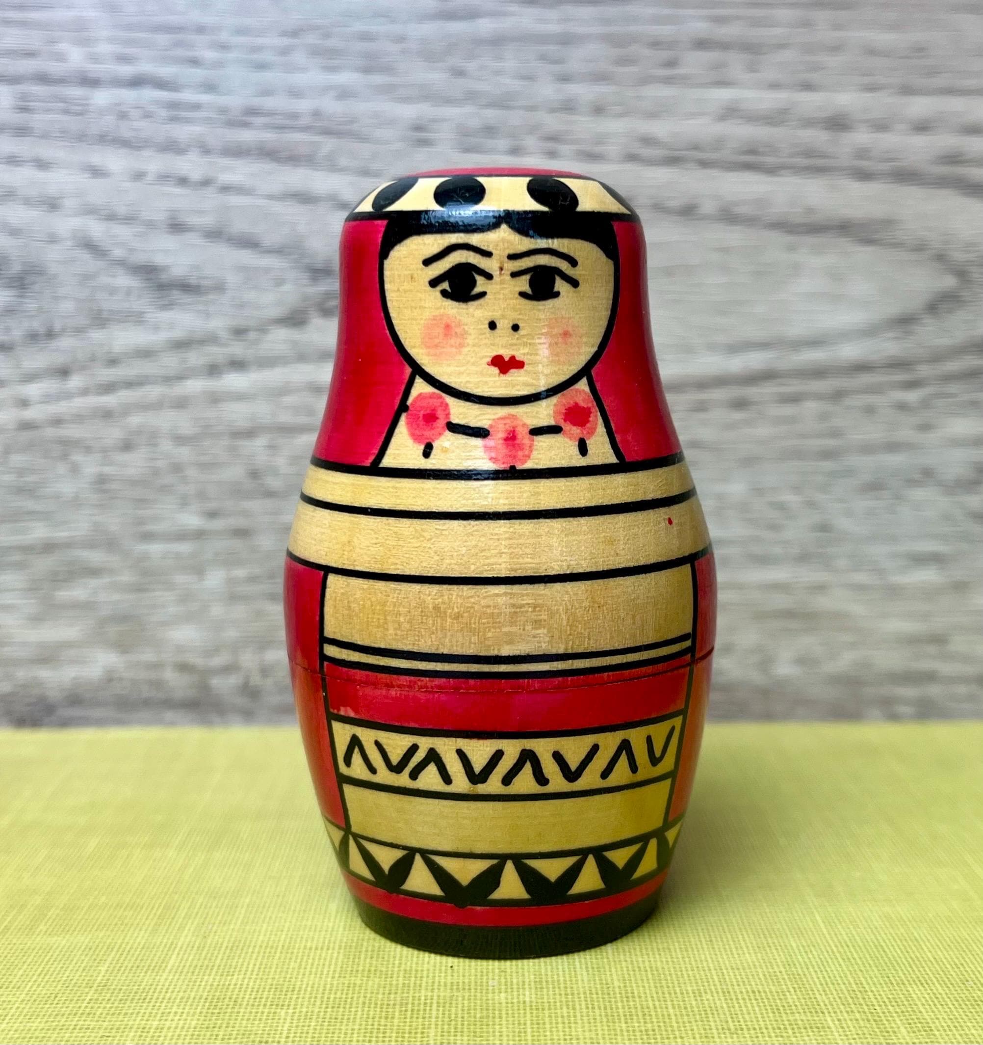 The dolls nest neatly inside one another, from the largest down to the tiniest, creating a delightful display piece. A perfect addition to any folk art, vintage décor, or cultural collection.