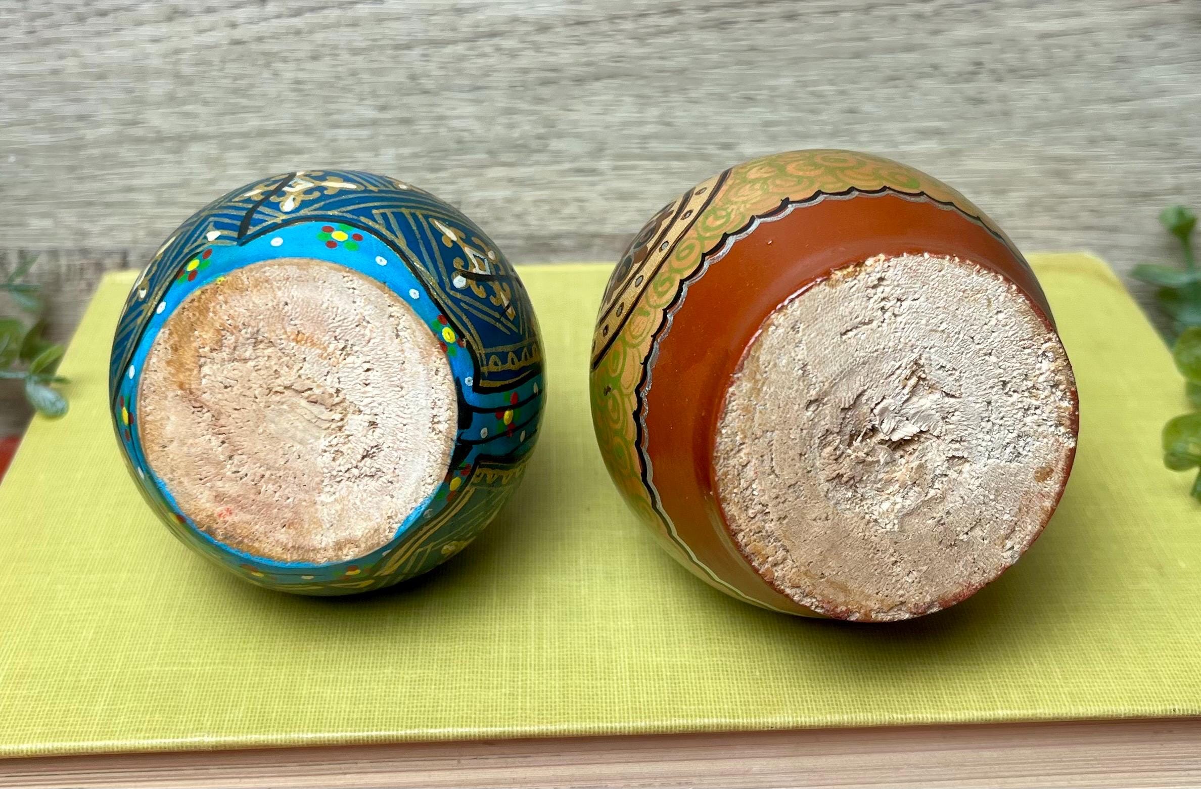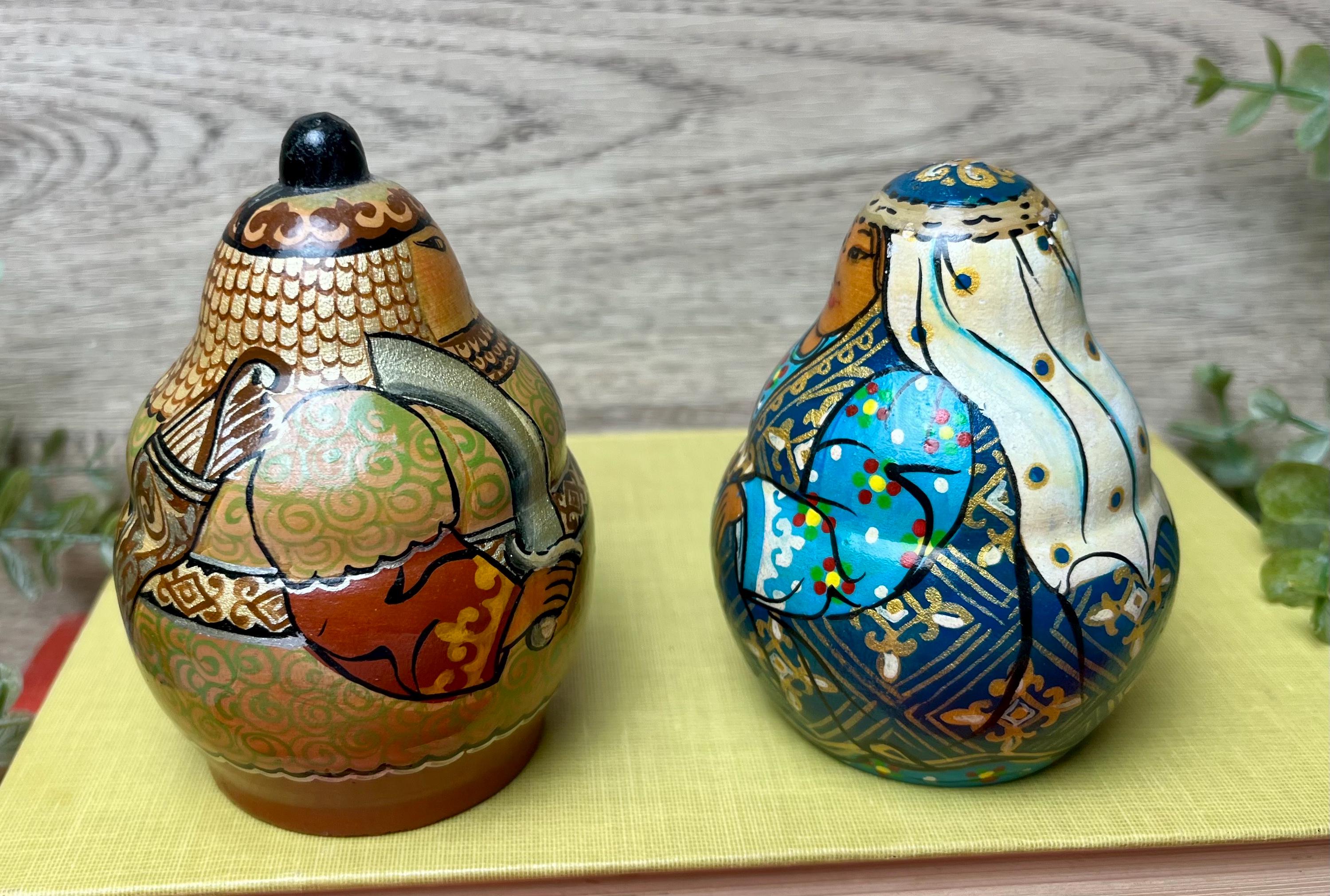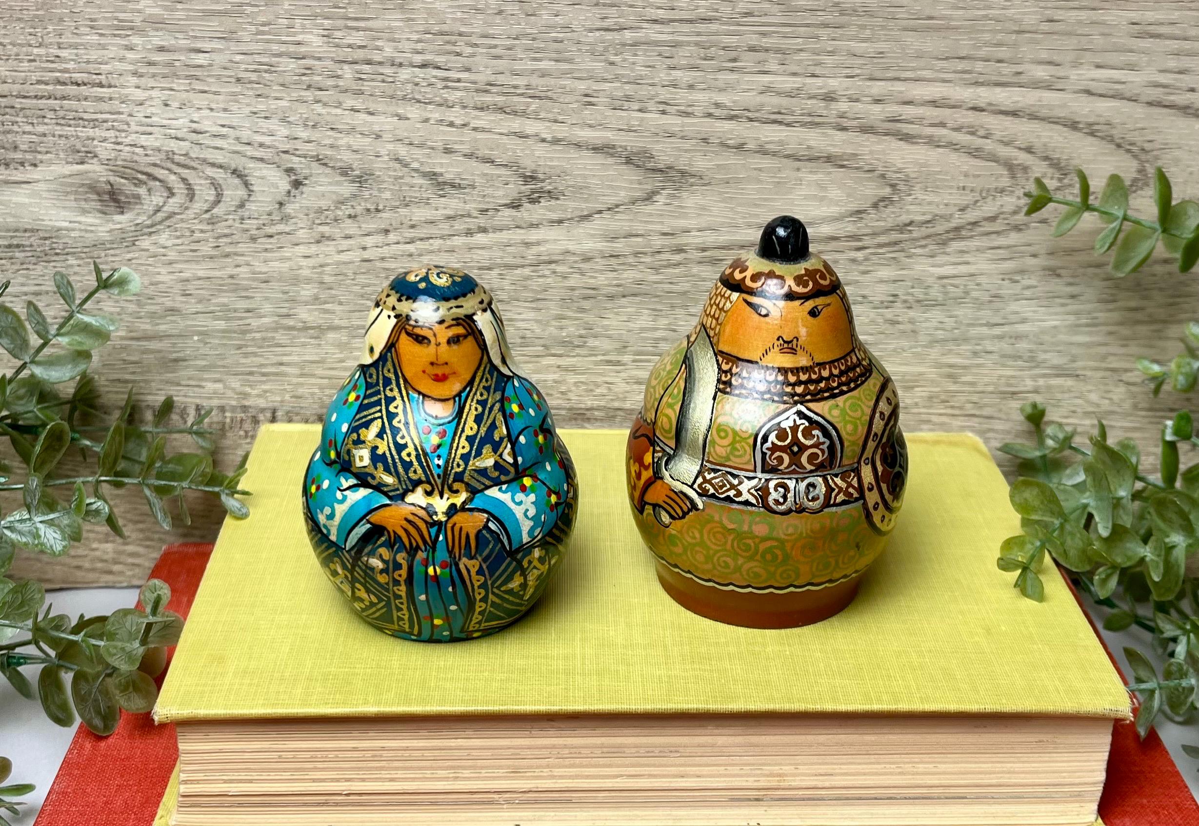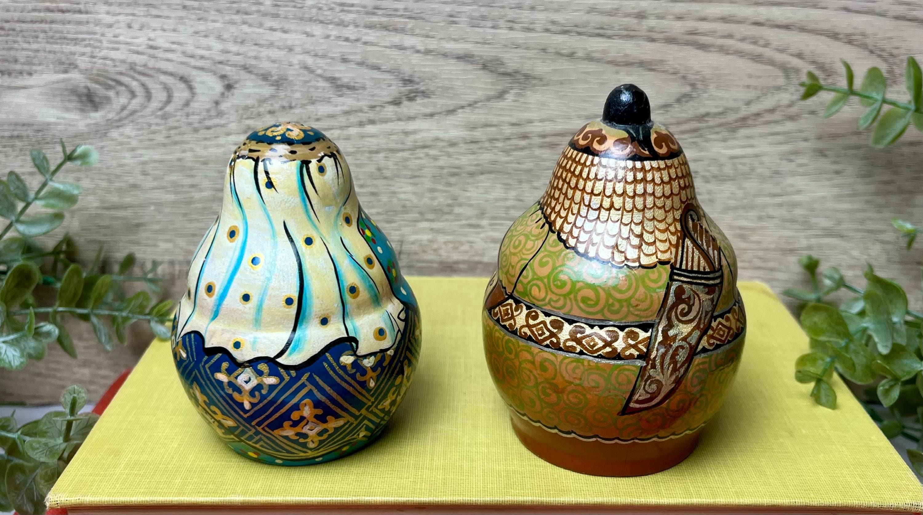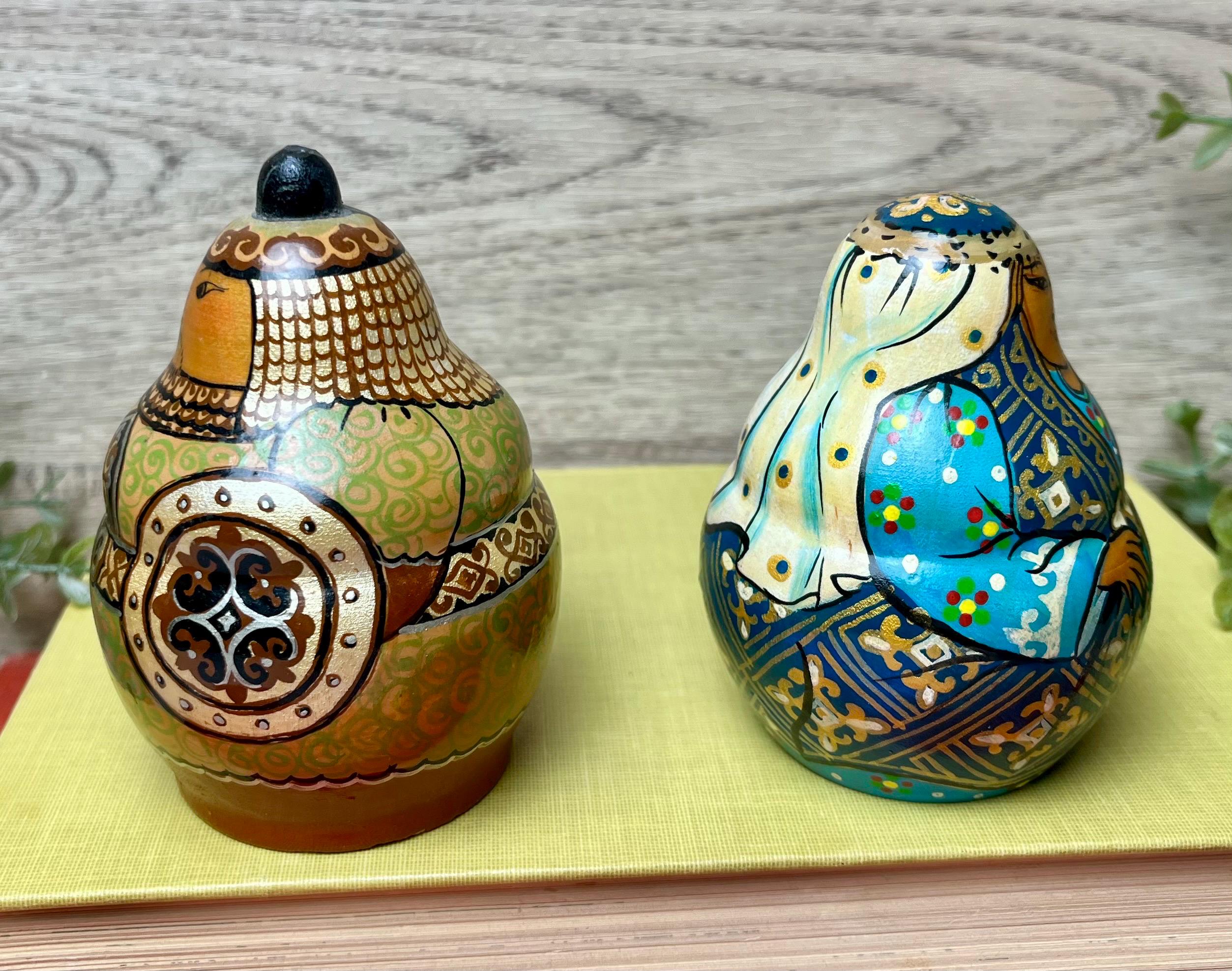 ✨ Features: • Pair of vintage hand-painted wooden figurines • Depicts Central Asian folk couple in traditional attire • Solid wood construction (non-nesting) • Rich colors with gold accents and intricate patterns • Estimated era: mid to late 20th century • Height: approx. 3.5 inches each • Excellent vintage condition with light wear
