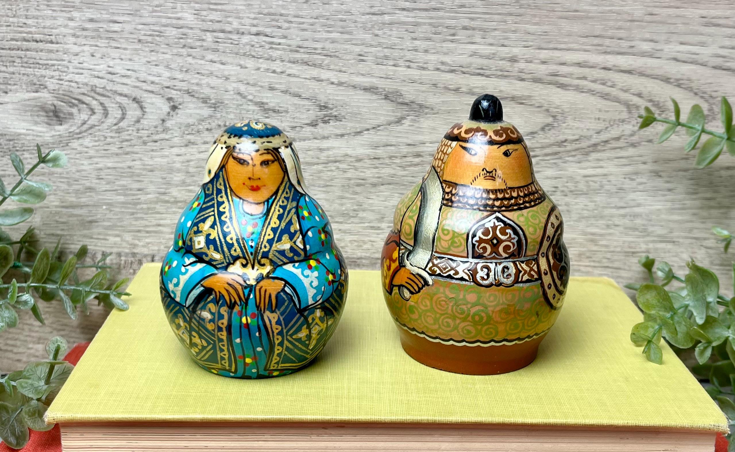 This unique pair of vintage hand-painted wooden dolls features a beautifully detailed Central Asian folk couple dressed in traditional attire. Crafted from solid wood, these figurines showcase exquisite painted details — from the intricate patterns of the woman’s flowing blue robe to the ornate armor-like designs on the man’s outfit.