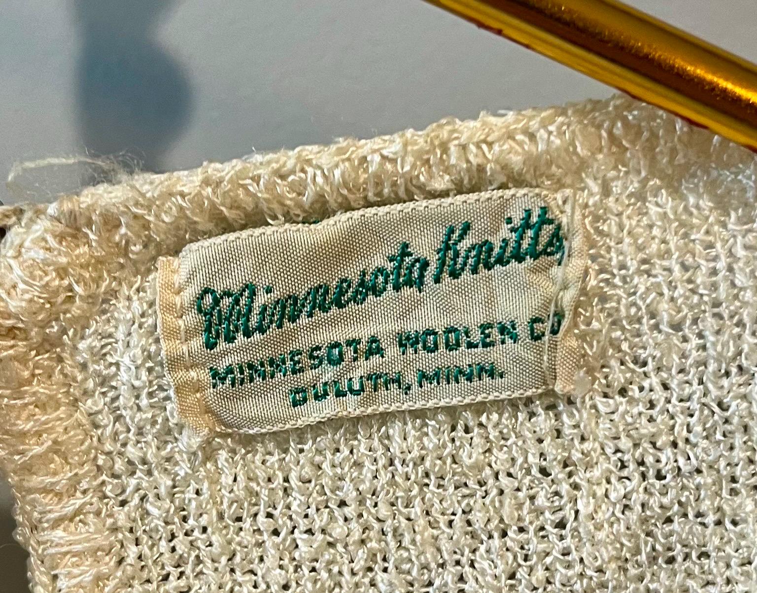 This exquisite cream knit sweater is an authentic 1930s–1940s gem, crafted by Minnesota Knits — a heritage American label known for its quality knitwear during the prewar and midcentury era. With its delicate beaded sheer neckline and flattering silhouette, this piece embodies timeless vintage elegance.