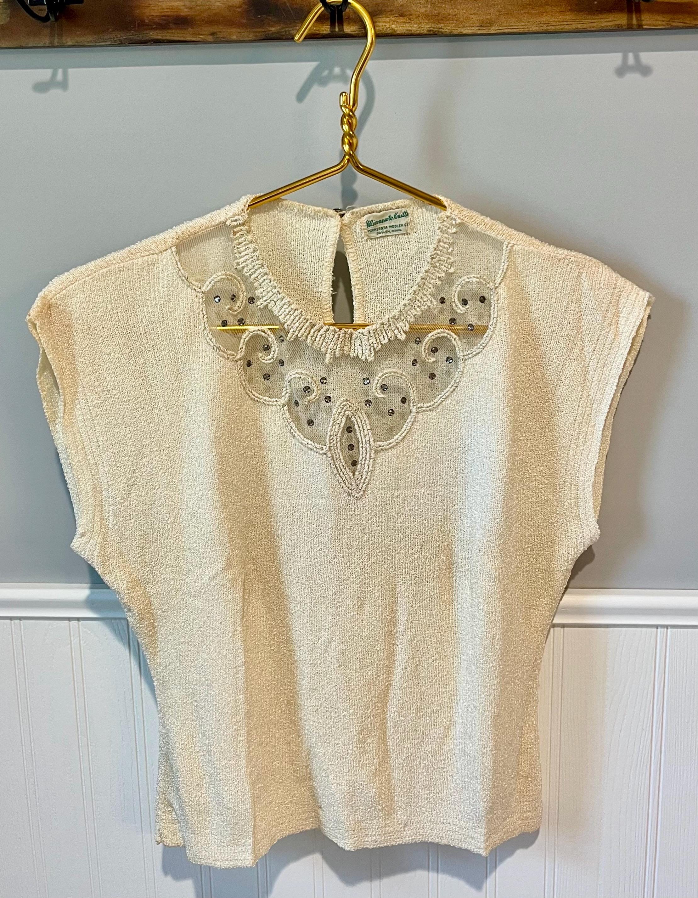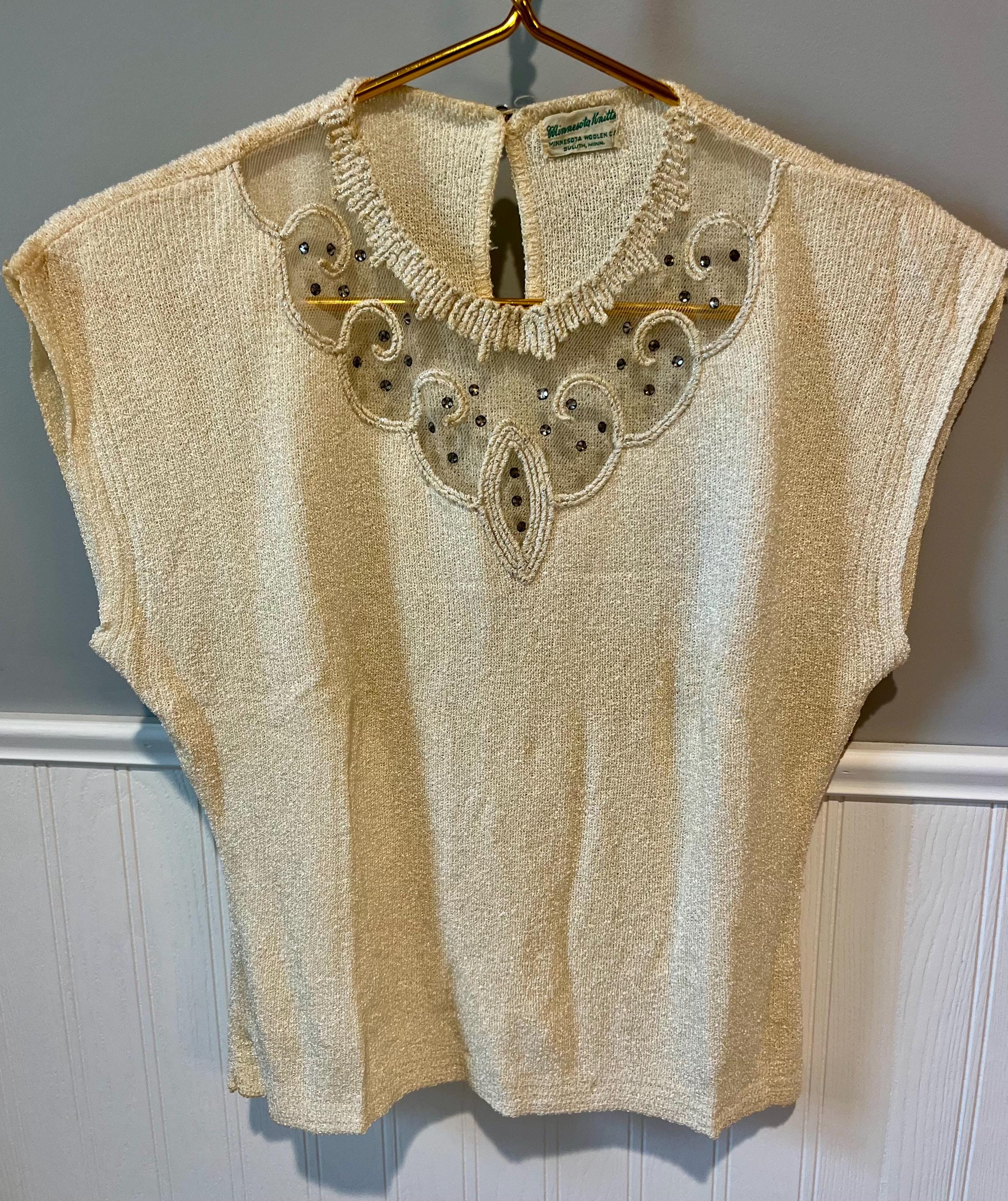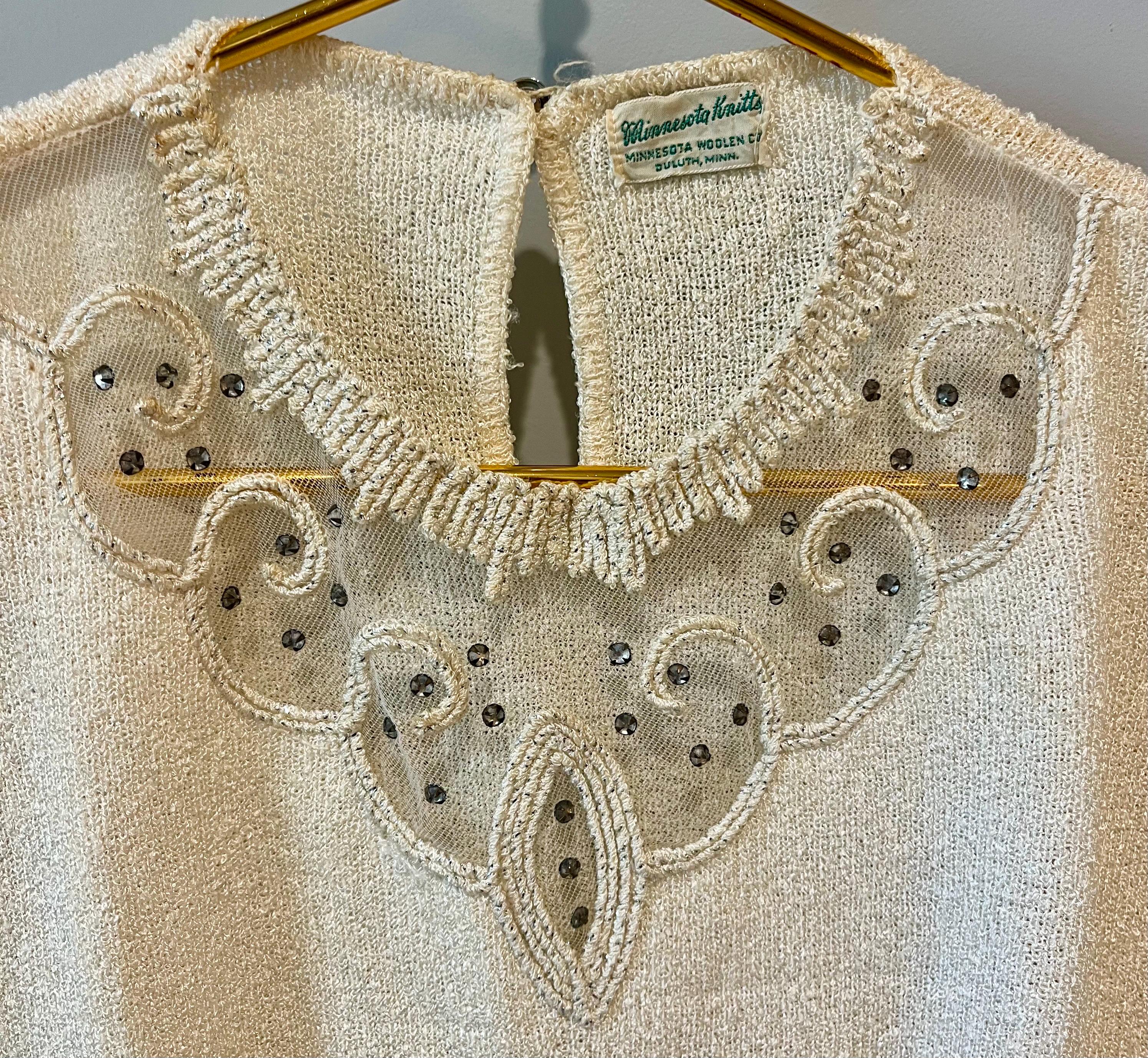 Features: • Authentic (approx.) 1940s era knit top • Label: Minnesota Knits, Duluth, Minnesota • Soft cream boucle knit fabric • Sheer mesh neckline with intricate white beadwork and rhinestone accents • Cap sleeves and straight waist hem • Keyhole back with button closure • Lightweight and breathable, perfect for layering or warmer seasons