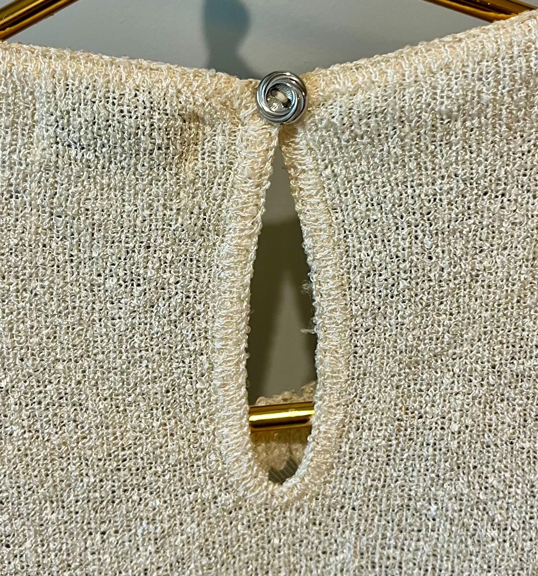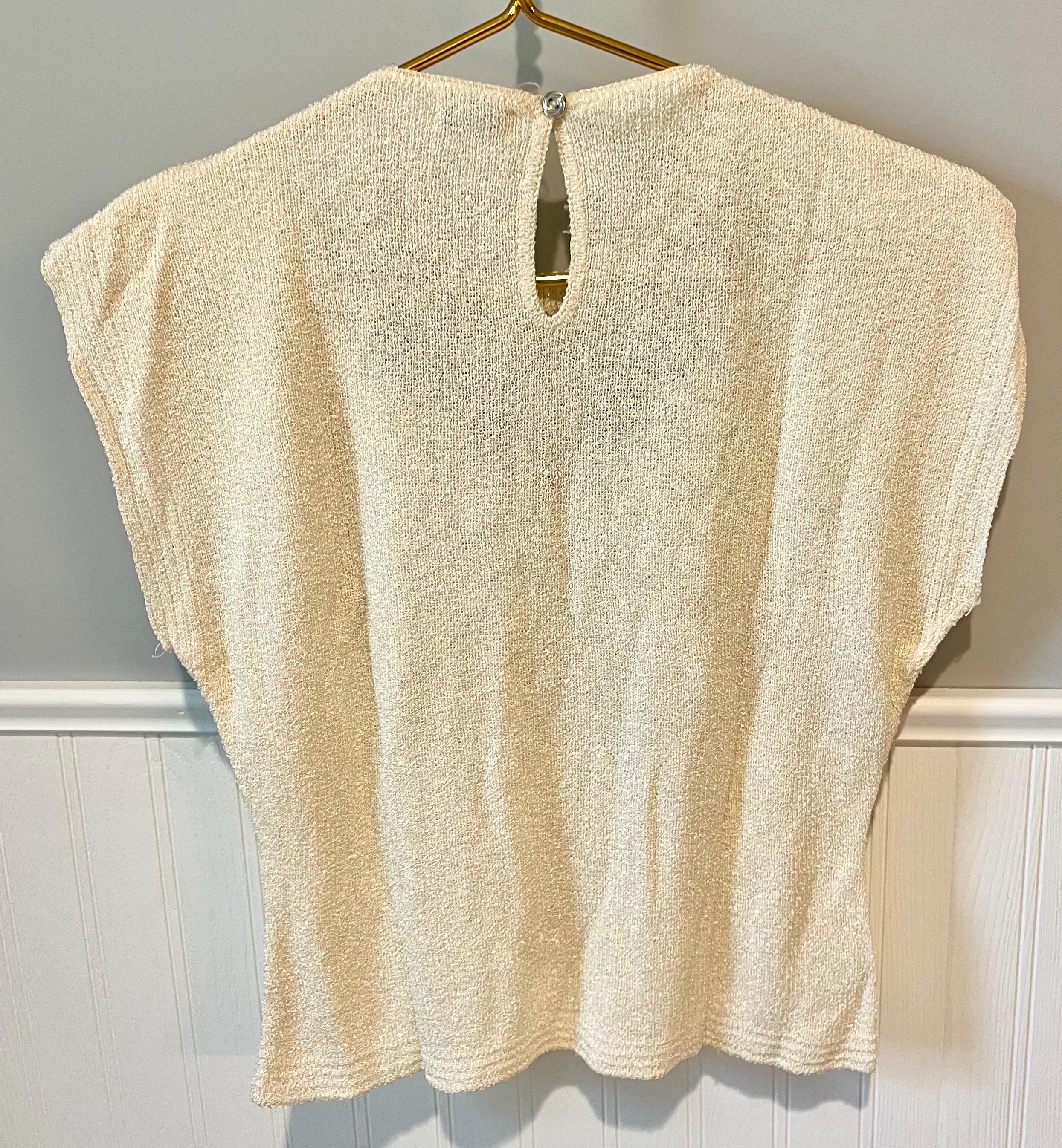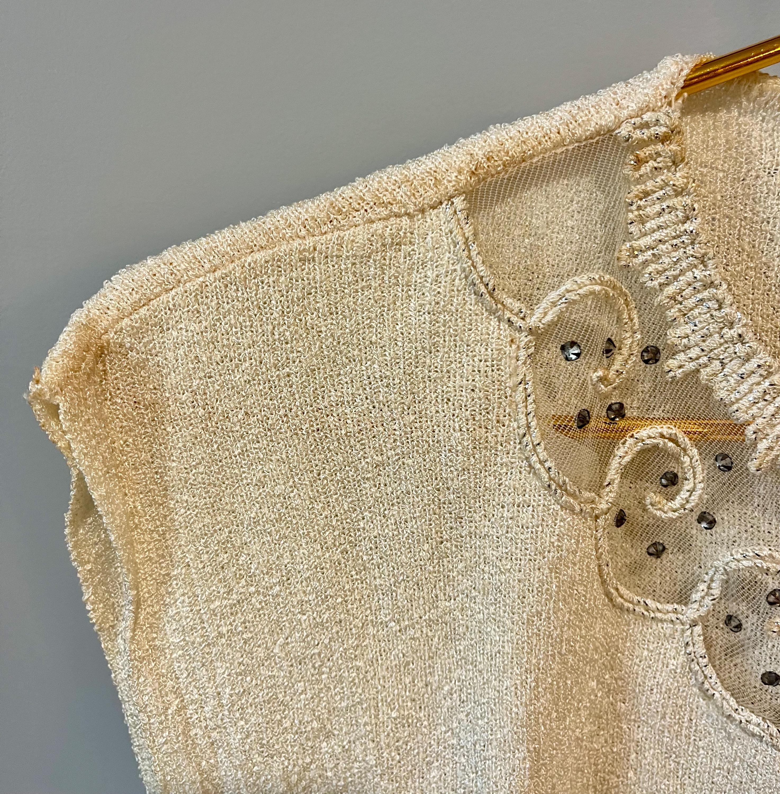 Features: • Authentic (approx.) 1940s era knit top • Label: Minnesota Knits, Duluth, Minnesota • Soft cream boucle knit fabric • Sheer mesh neckline with intricate white beadwork and rhinestone accents • Cap sleeves and straight waist hem • Keyhole back with button closure • Lightweight and breathable, perfect for layering or warmer seasons