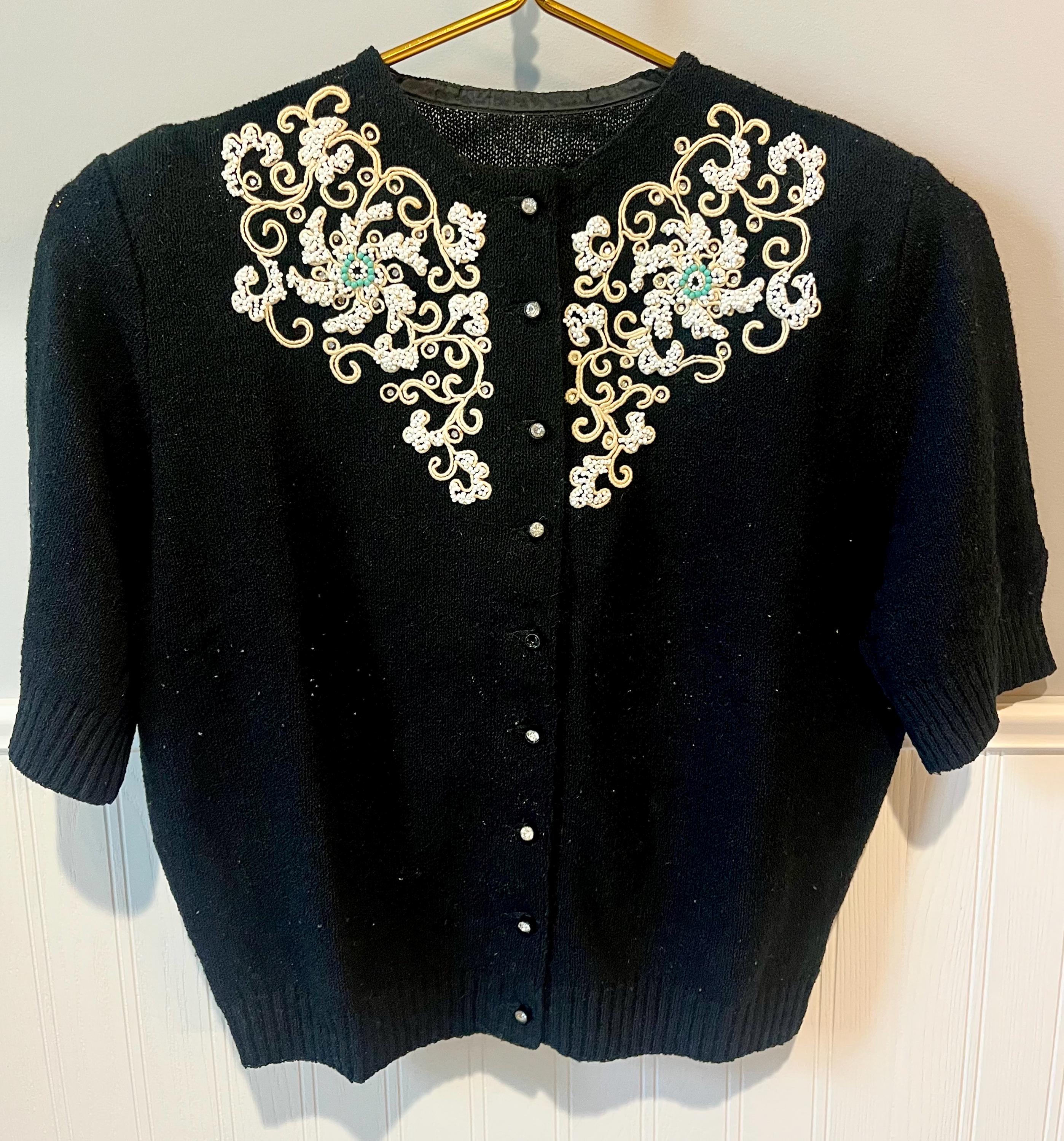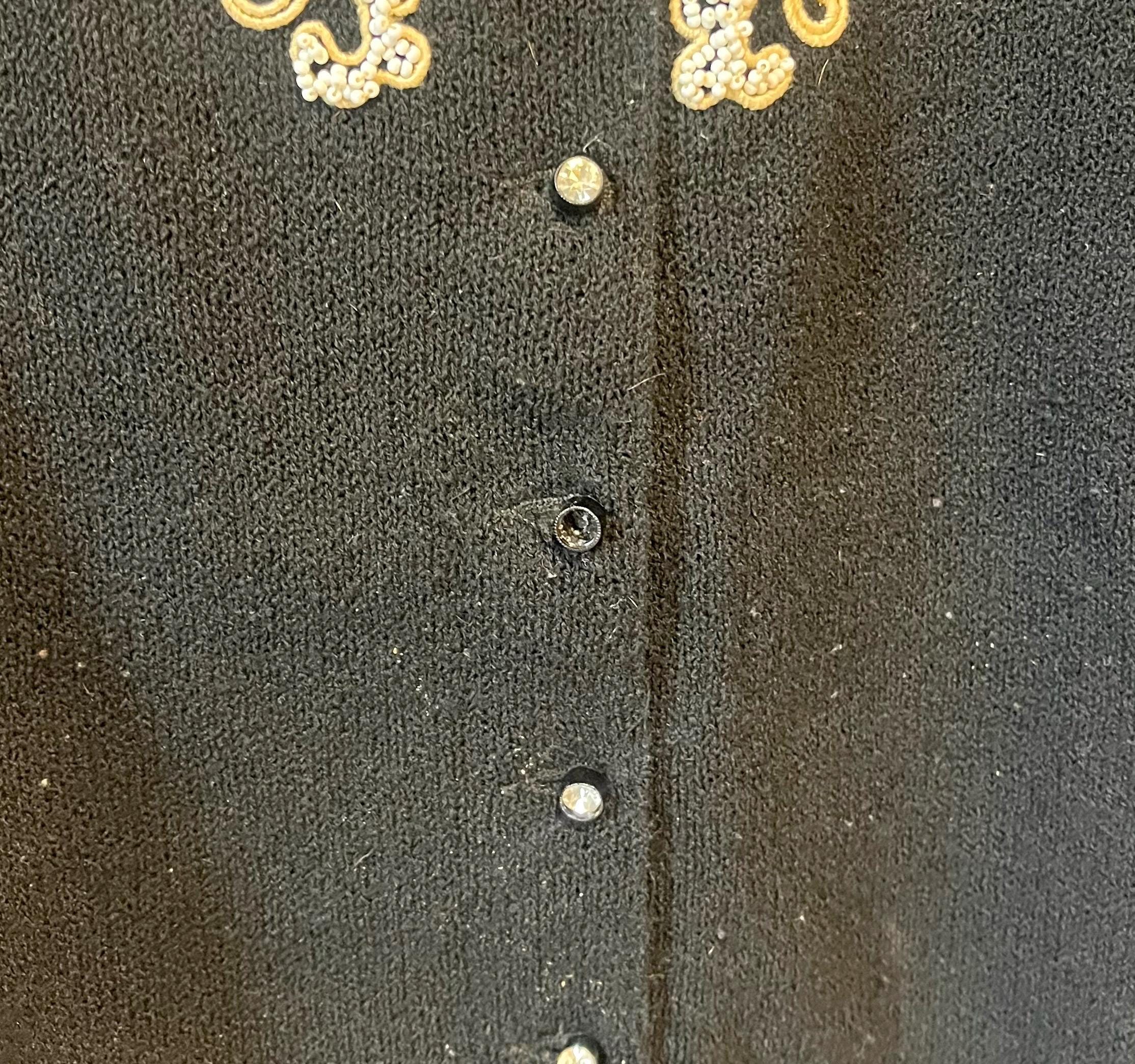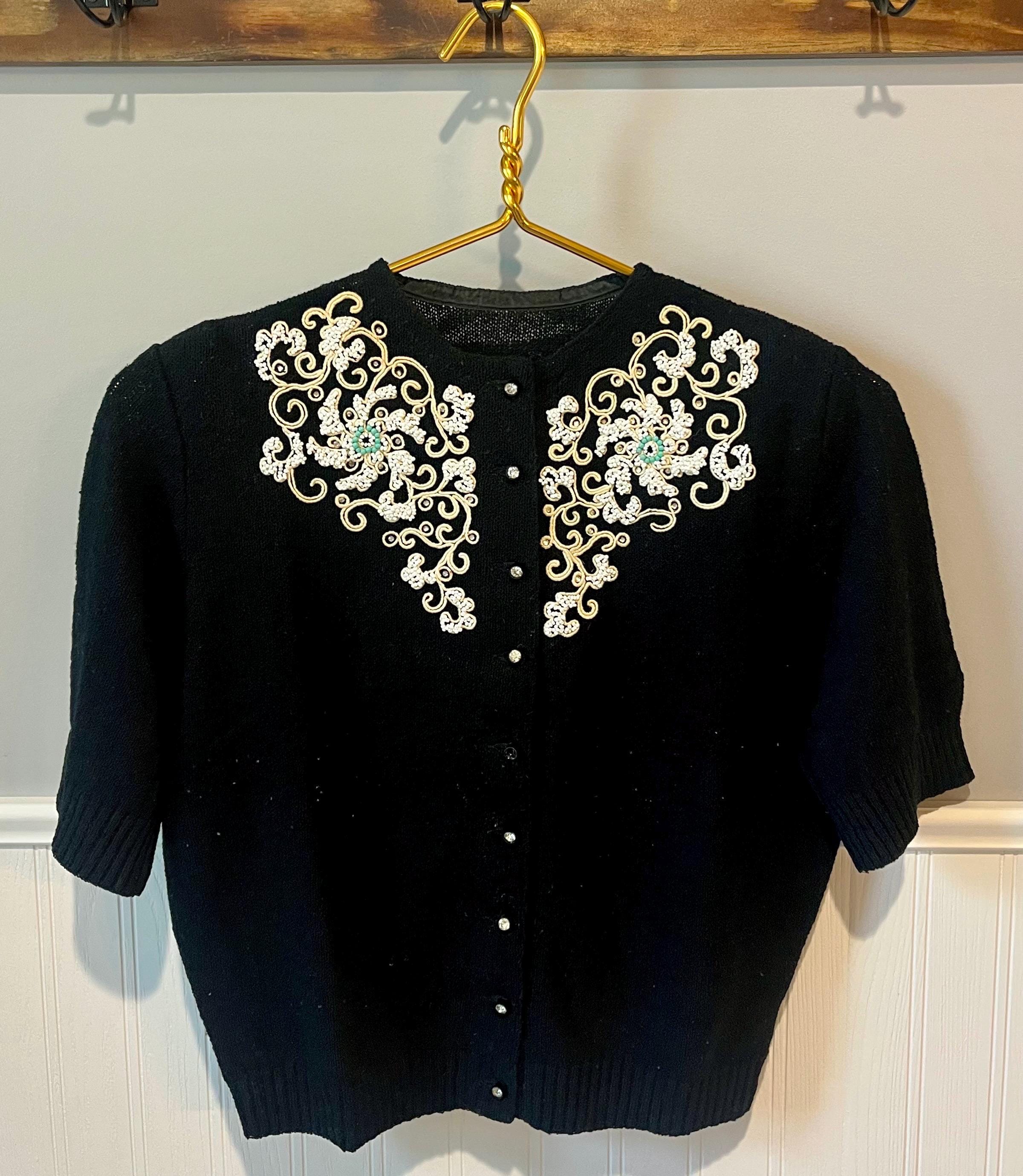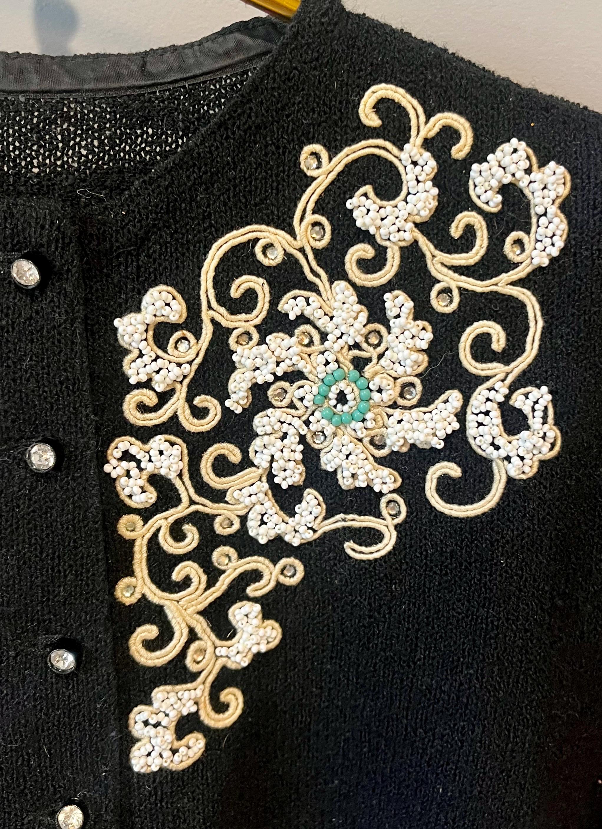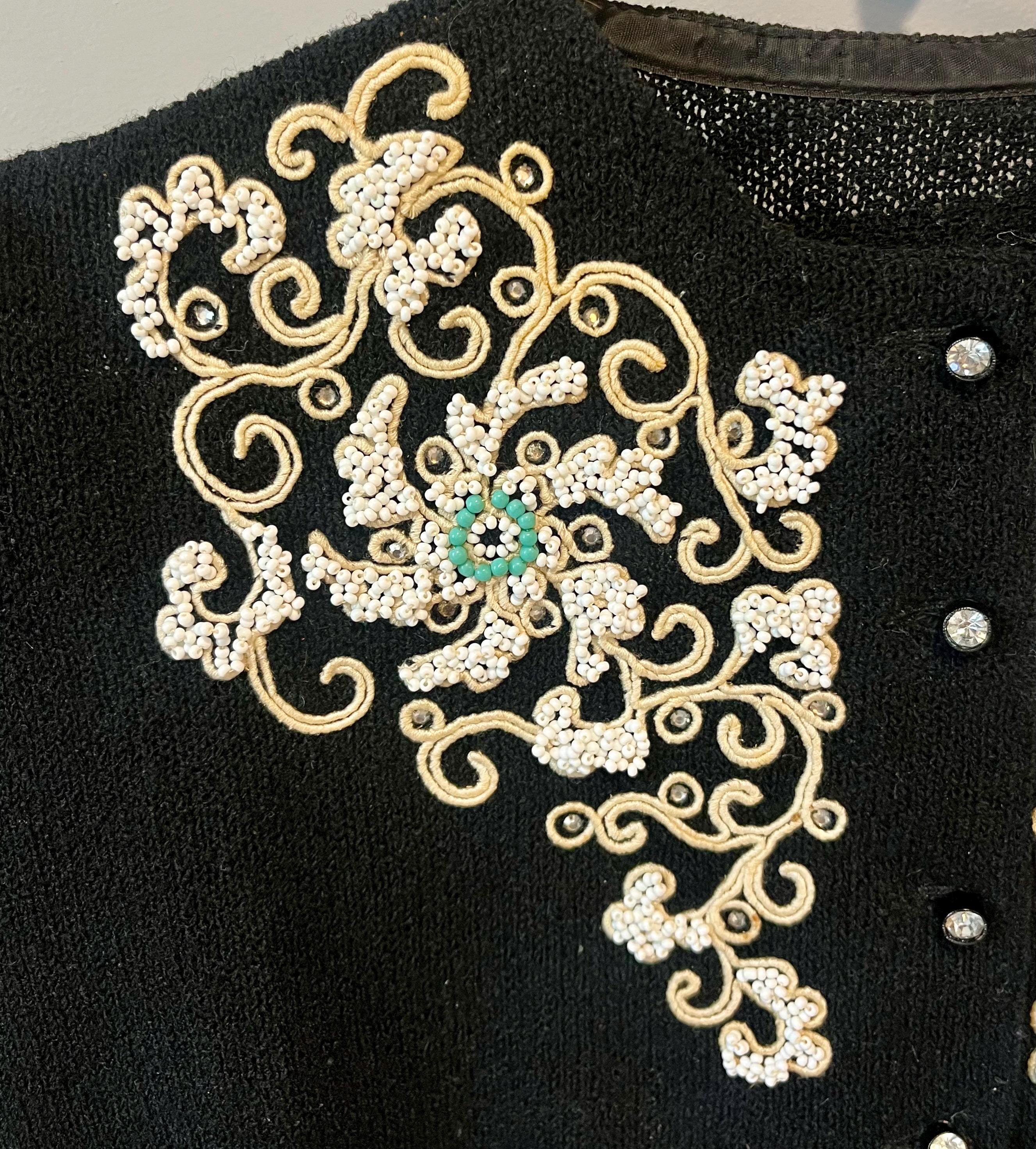 Step into timeless elegance with this exquisite vintage black cardigan. Crafted with a light knit and adorned with intricate hand-beaded floral embroidery, this piece radiates classic mid-century charm. A stunning statement sweater perfect for dressy occasions, retro styling, or adding a touch of glamour to any outfit.