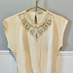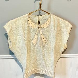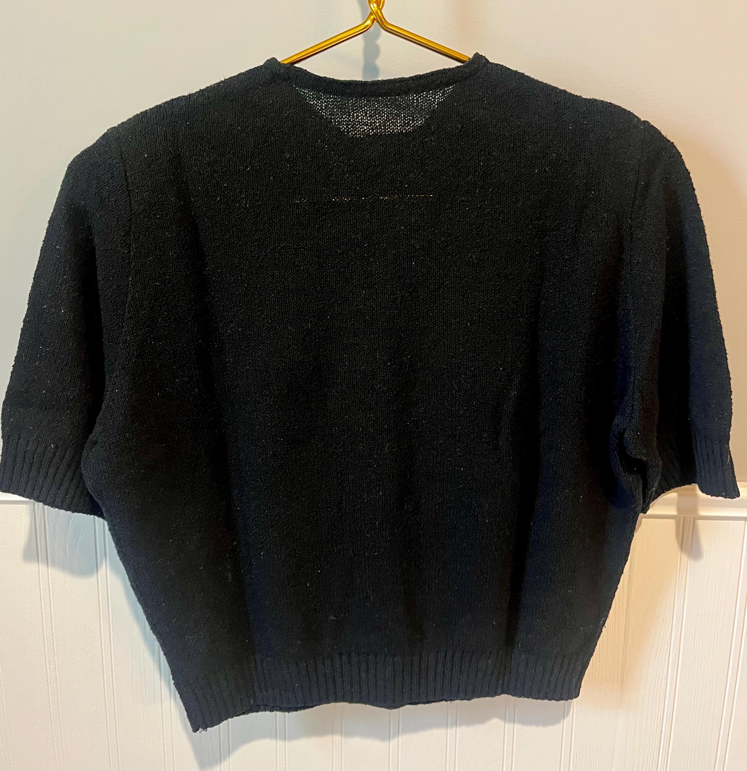 ✨ Features: • Black knit short-sleeve cardigan • Front button closure with rhinestone-style buttons • Cream embroidery with white seed beads and turquoise accent beads • Rounded neckline, cropped silhouette • Thin shoulder pads • Made approx in the 1930-40s