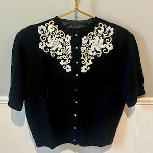 🧼 Condition: Excellent vintage condition for its age. Rhinestones are intact with gentle, even wear. Knit is strong with no visible holes or major flaws. Light discoloration under arms.