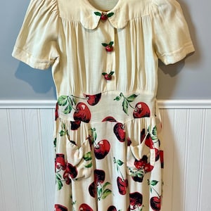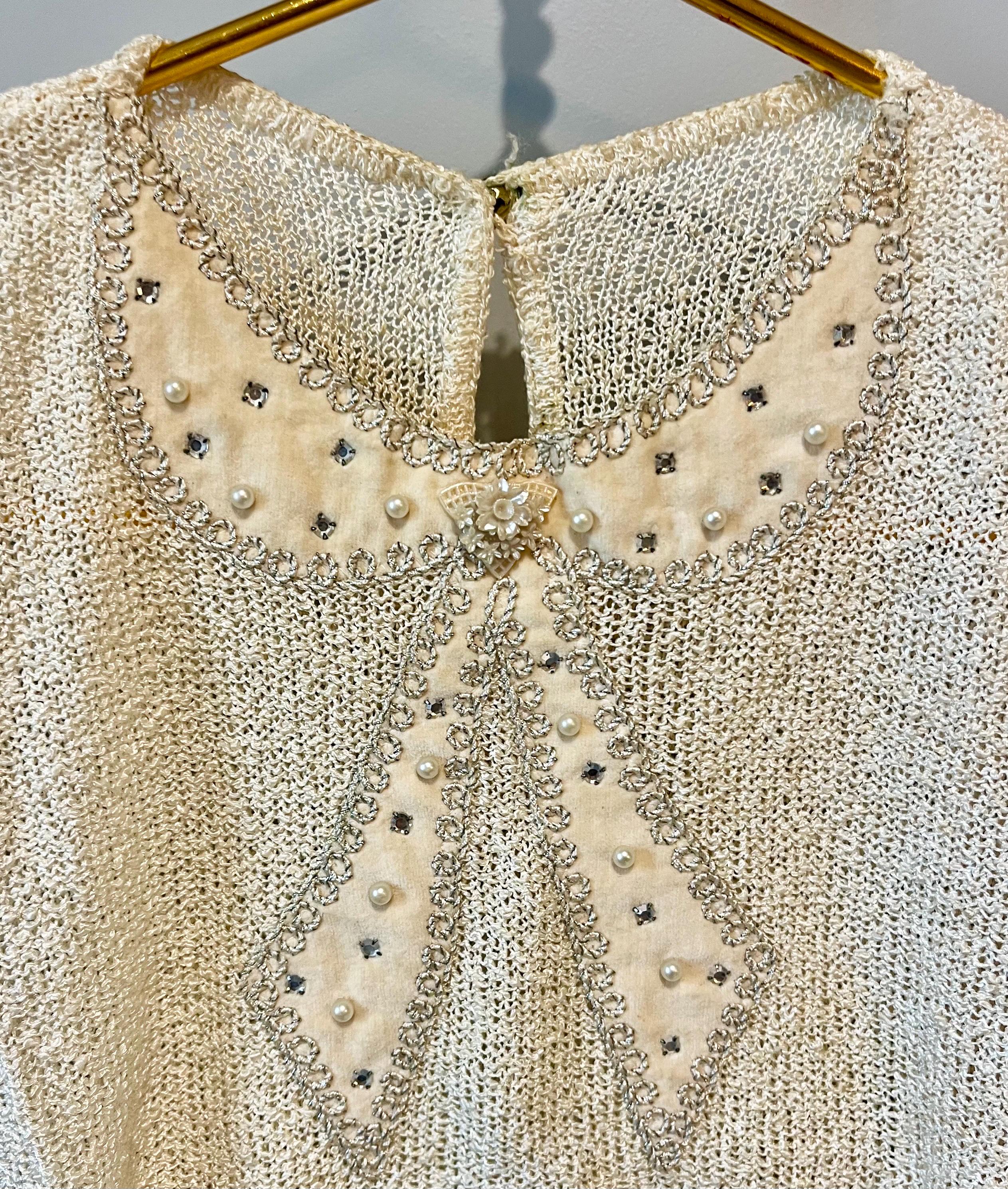 This elegant vintage cream knit top from the late 1930s to early 1940s is a timeless example of early American knitwear design. Made by Beau-Pal in New York, this sweater features a charming velvet bow–inspired collar encrusted with rhinestone accents, giving it a refined Art Deco–influenced look. A rare find in this condition, it’s perfect for collectors and vintage fashion enthusiasts alike.